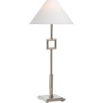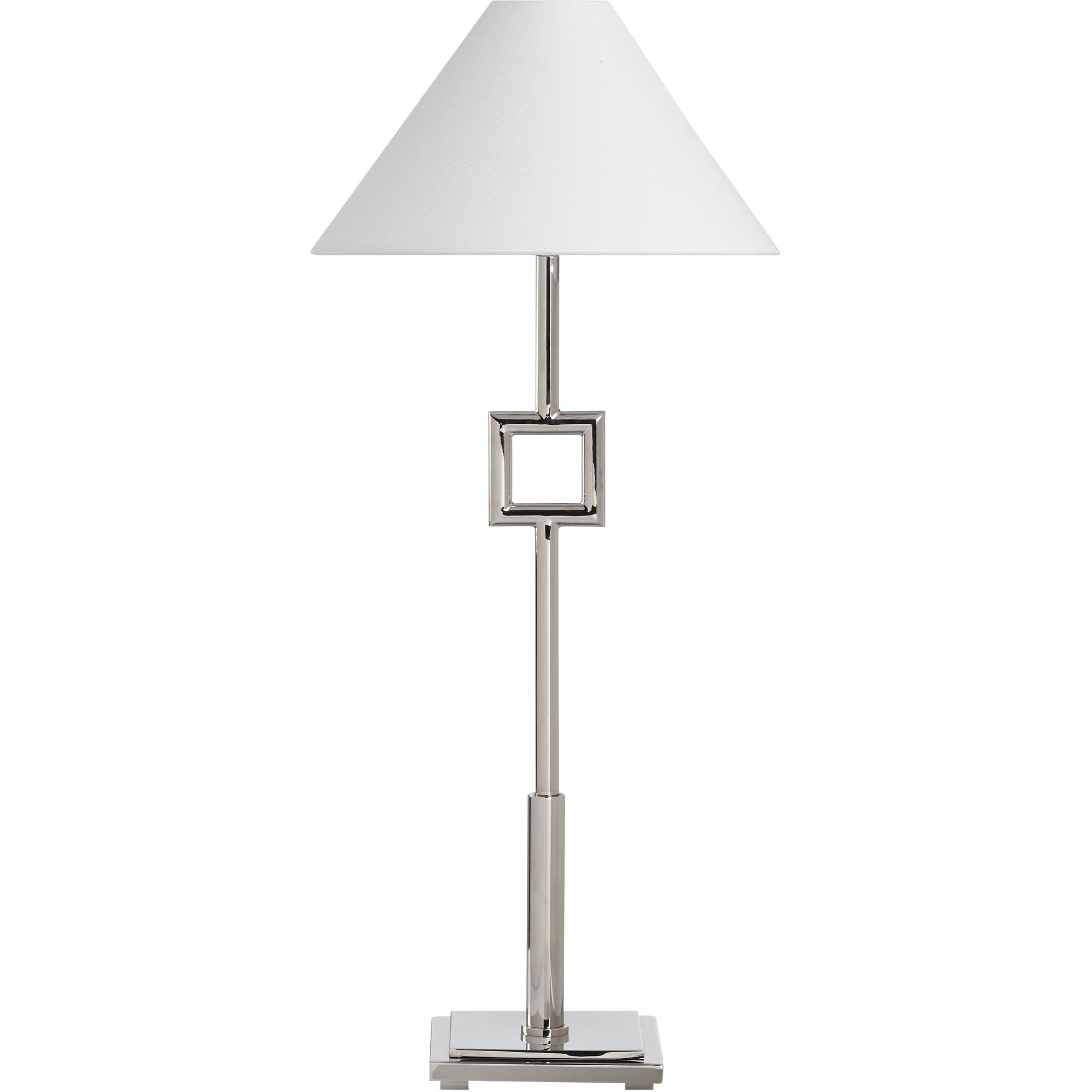 This sleek metal table lamp features a modern silhouette with a bold square accent, adding a touch of architectural elegance. With a polished nickel finish, it exudes sophistication, making it a perfect statement piece for any contemporary or classic space. Designed by Jamie Merida.