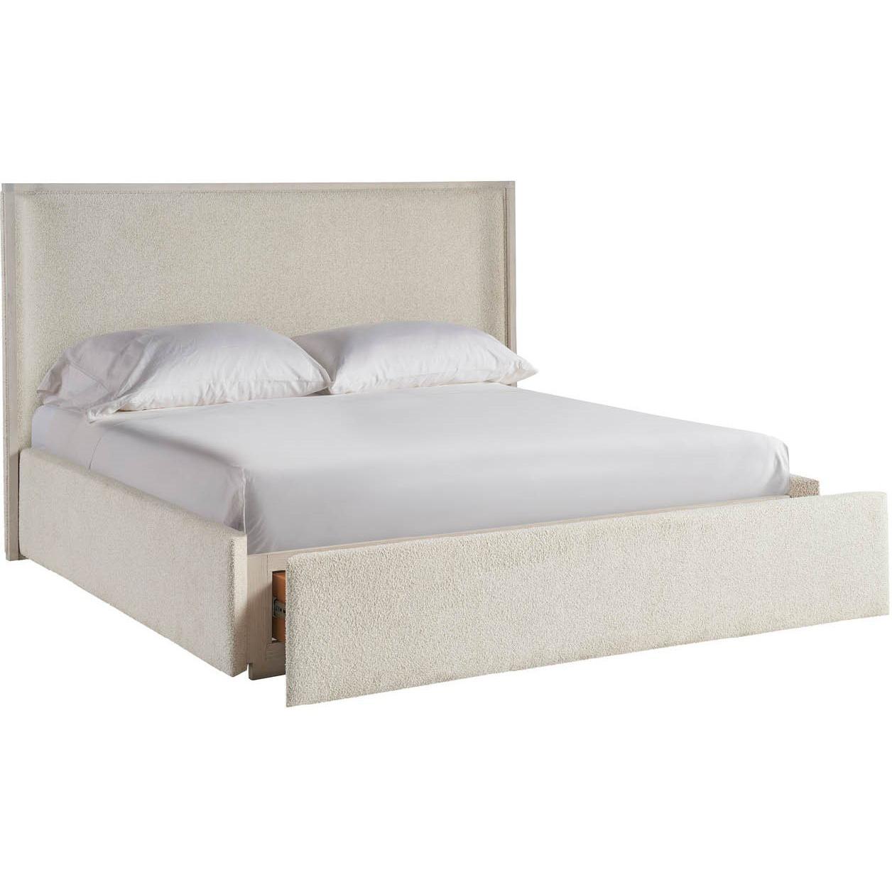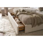 The Owen Storage Bed is a stunning blend of modern elegance and practical design. Its fully upholstered silhouette, accented by a narrow, wooden-framed headboard, creates a sleek and sophisticated look. The footboard, which effortlessly pulls out to reveal hidden storage space, adds a touch of convenience to this stylish piece.