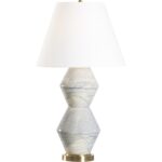 A natural touch of splattered paint brings a whimsical feel to a modern silhouette. The Paint Splattered Table Lamp’s ceramic body is painted with blue swirls on top of a smooth brass base with a white linen shade. Designed by Bill Cain.