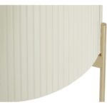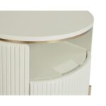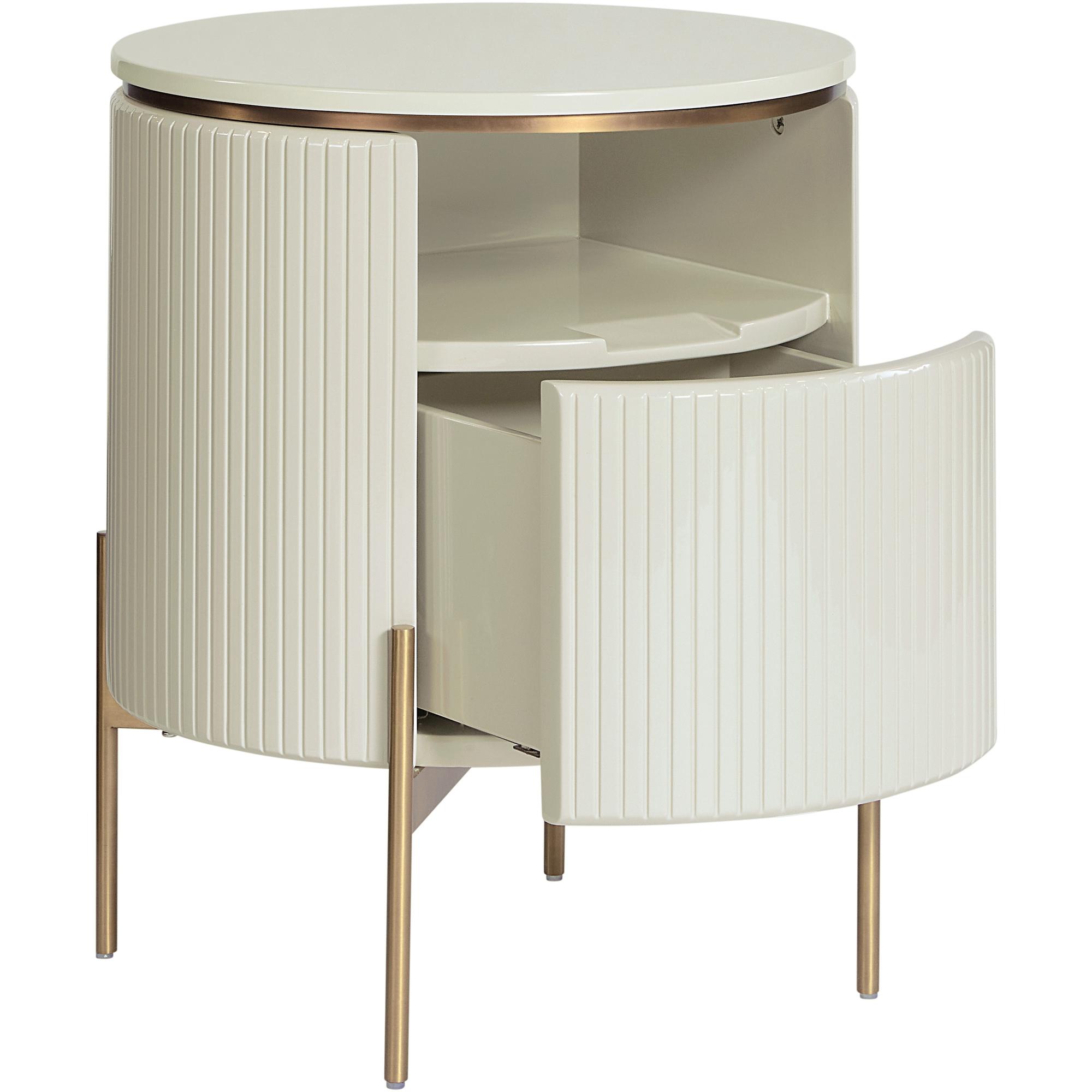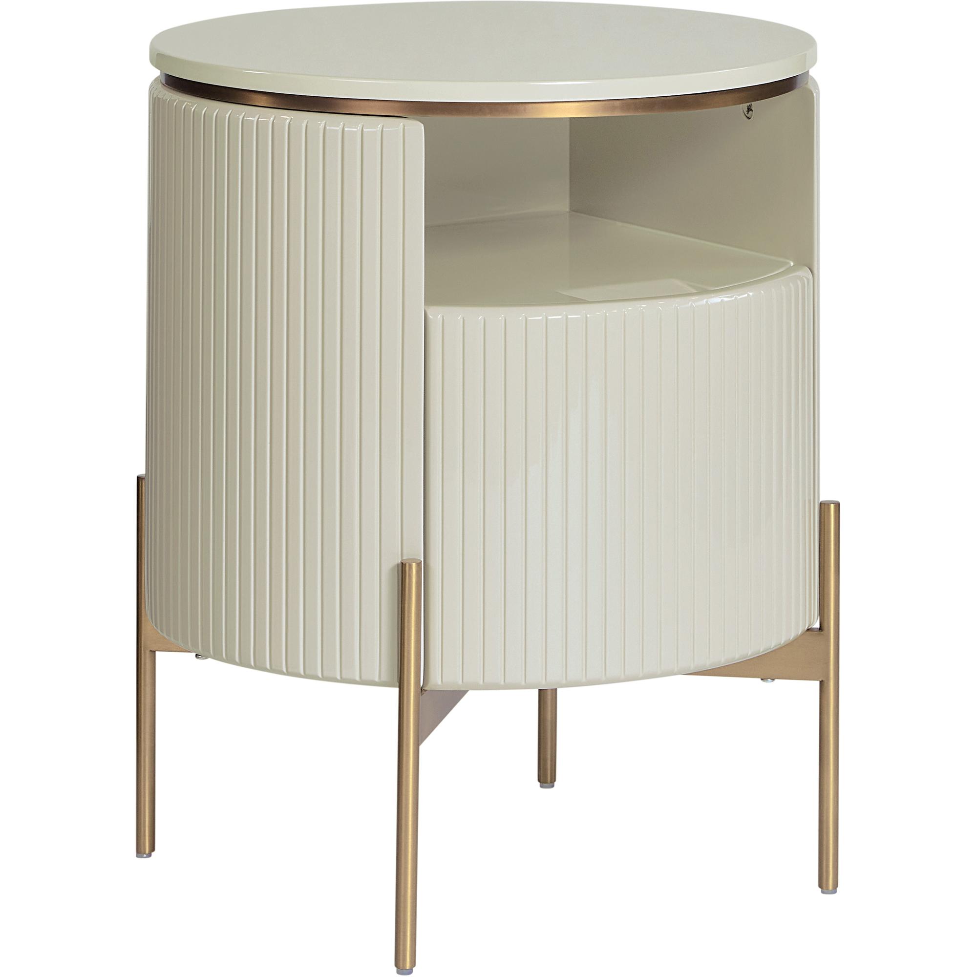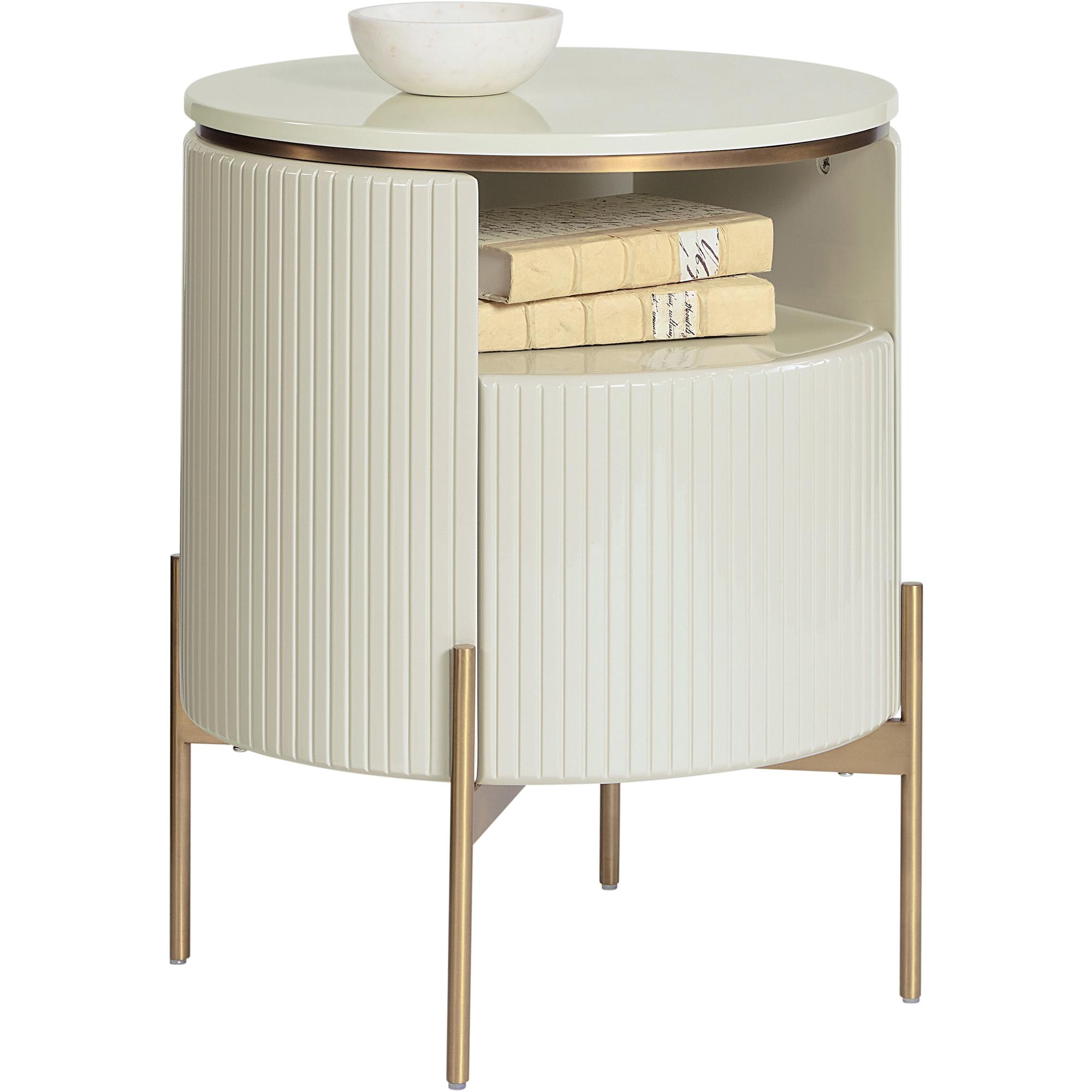 This luxurious end table will bring a sculptural spirit to any space. The curved frame, finished in high gloss cream, is contrasted with intricate vertical reeding. Gold stainless steel legs and inlay create added definition. Coordinating lift-top coffee table and sideboard also available.