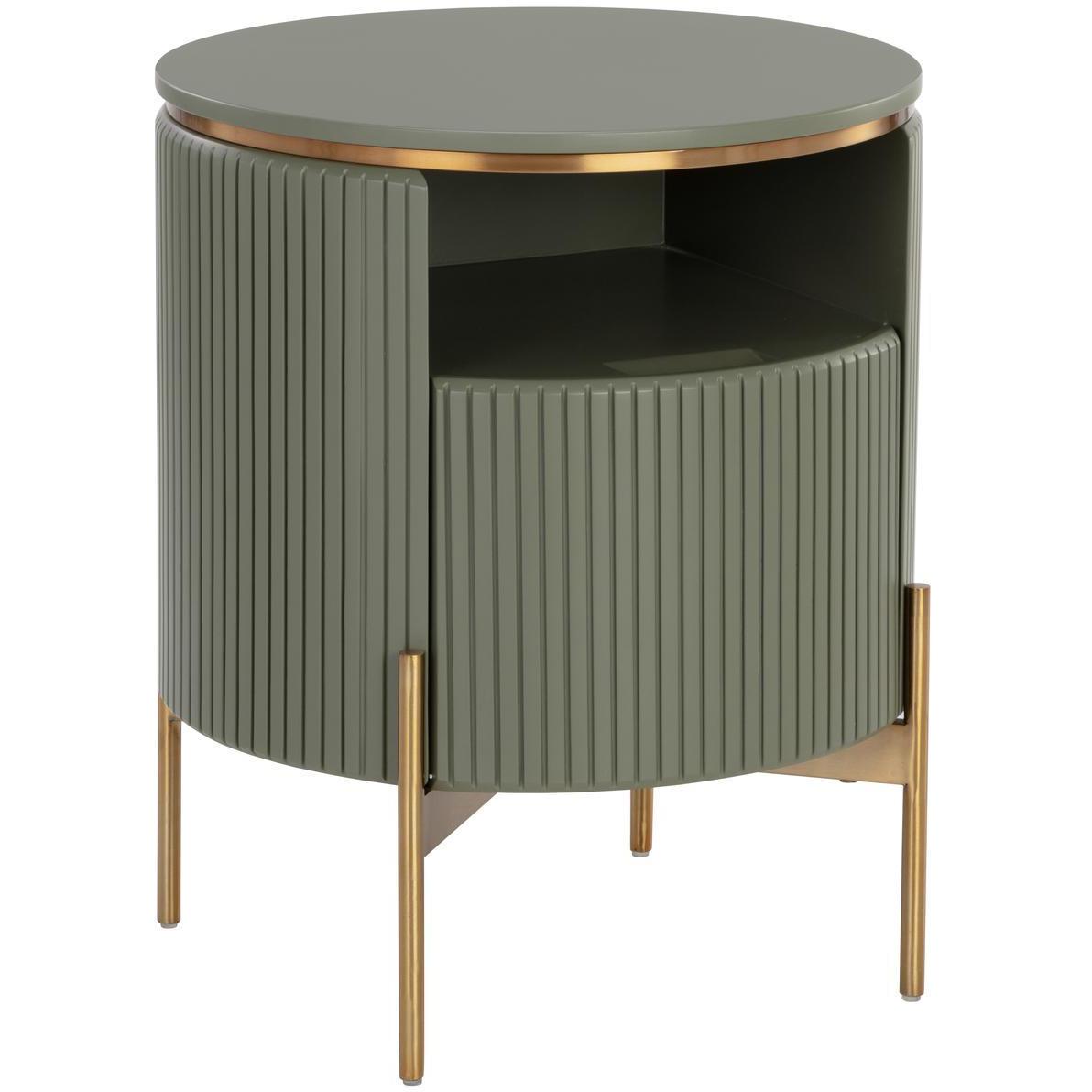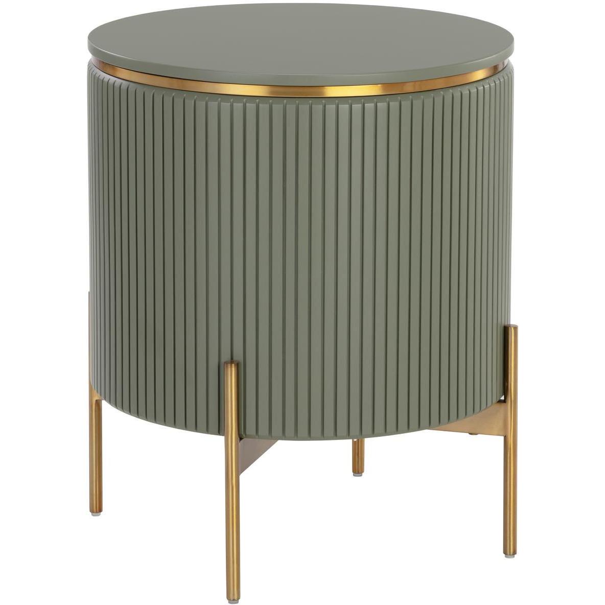 This luxurious end table will bring a sculptural spirit to any space. The round frame, finished in sage green, is contrasted with intricate vertical reeding. Gold stainless steel legs and inlay create added definition. Coordinating sideboard also available.