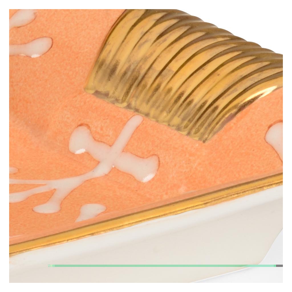 Pamela Tray features a hand painted cream pattern on a peach glazed porcelain tray with textured gold handles and trim. Display this tray on the even surfaces throughout your home as an eye-catching accent or a catchall.