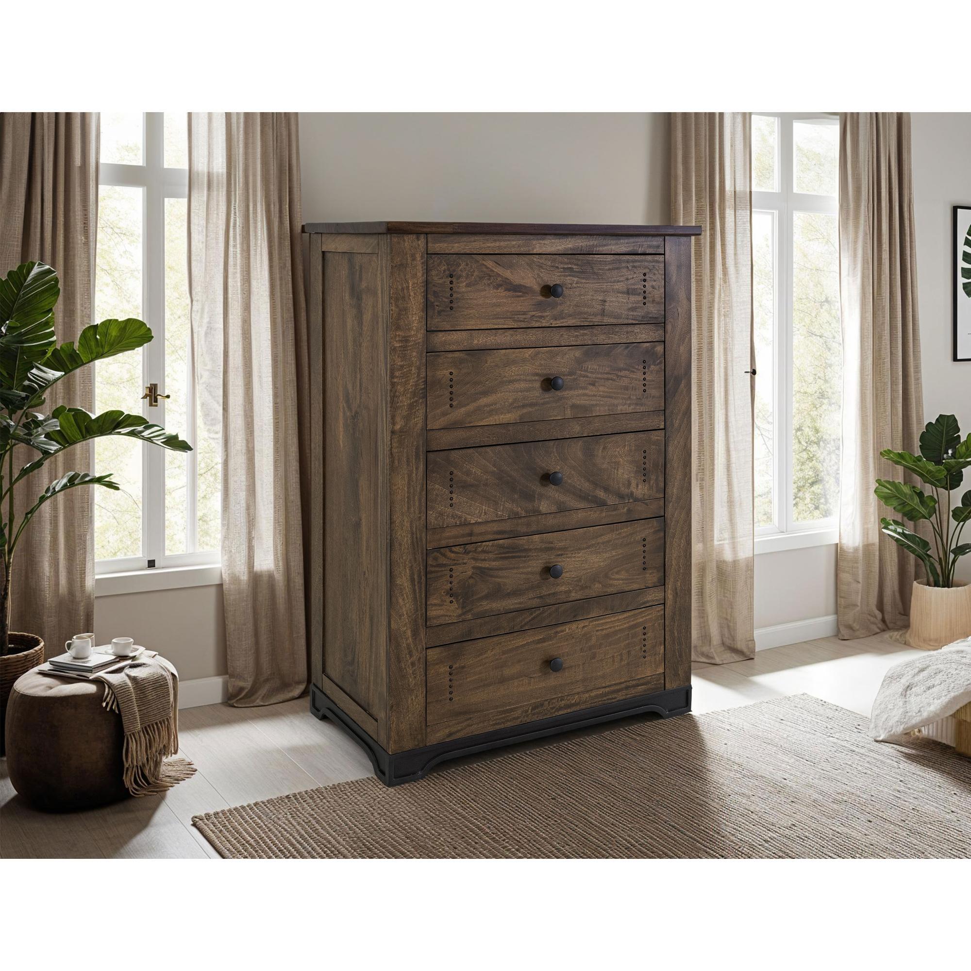 The exceptional Parota III Bedroom Collection showcases the beauty of Parota wood, native to Mexico and South America, It features panels and tops crafted from this stunning wood, incorporating butterfly joints between slabs combined with sustainable mango wood for the rest of the case piece. The translucent multi-step lacquer in brown allows the natural grain of the Parota wood to shine through beautifully. The collection also includes hand-forged iron details on the headboard and mirror, giving each piece a distinctive look. Additionally, the drawer fronts are adorned with decorative nails arranged in two vertical lines on either side of the knob handles. Elevate your bedroom with the unique charm and sustainable craftsmanship of the Parota III Bedroom Collection, where exquisite design meets eco-friendly elegance.