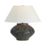 The Patina table lamp adds vintage-inspired charm to any room. Finished in distressed charcoal and beige, its ceramic base evokes a sense of effortless, timeworn beauty. Complemented by dark antique bronze details and a soft ivory linen shade, it casts a warm, inviting glow, while the dimmable rotary switch allows users to tailor the light to suit any mood or space.