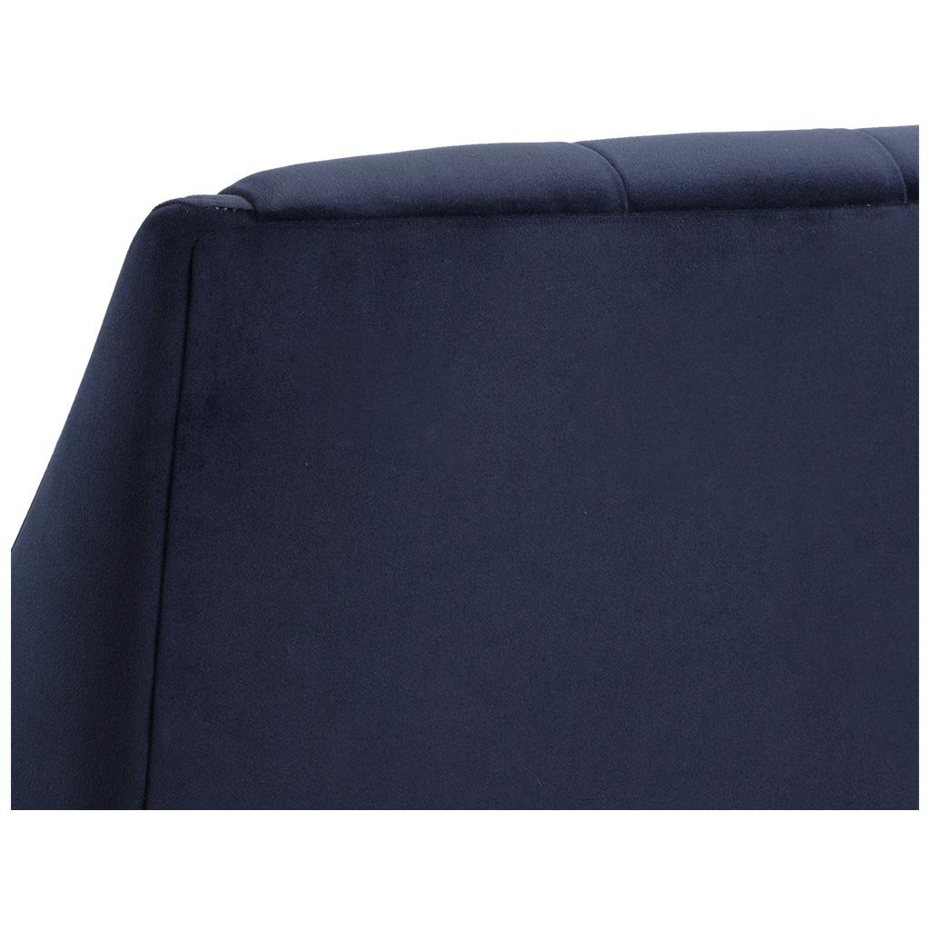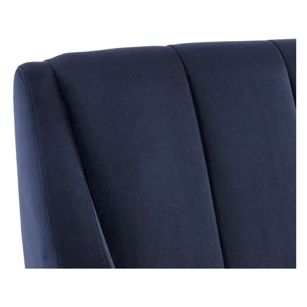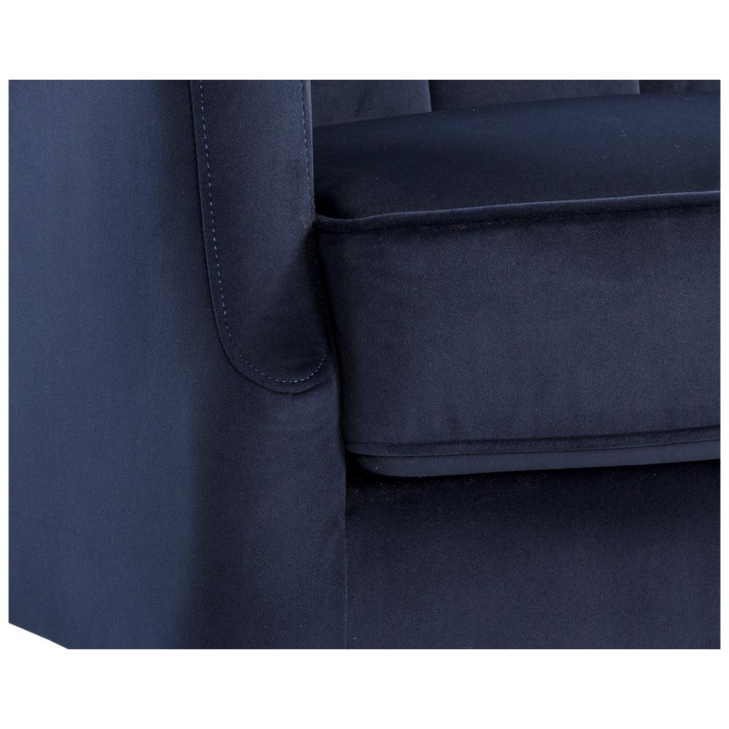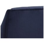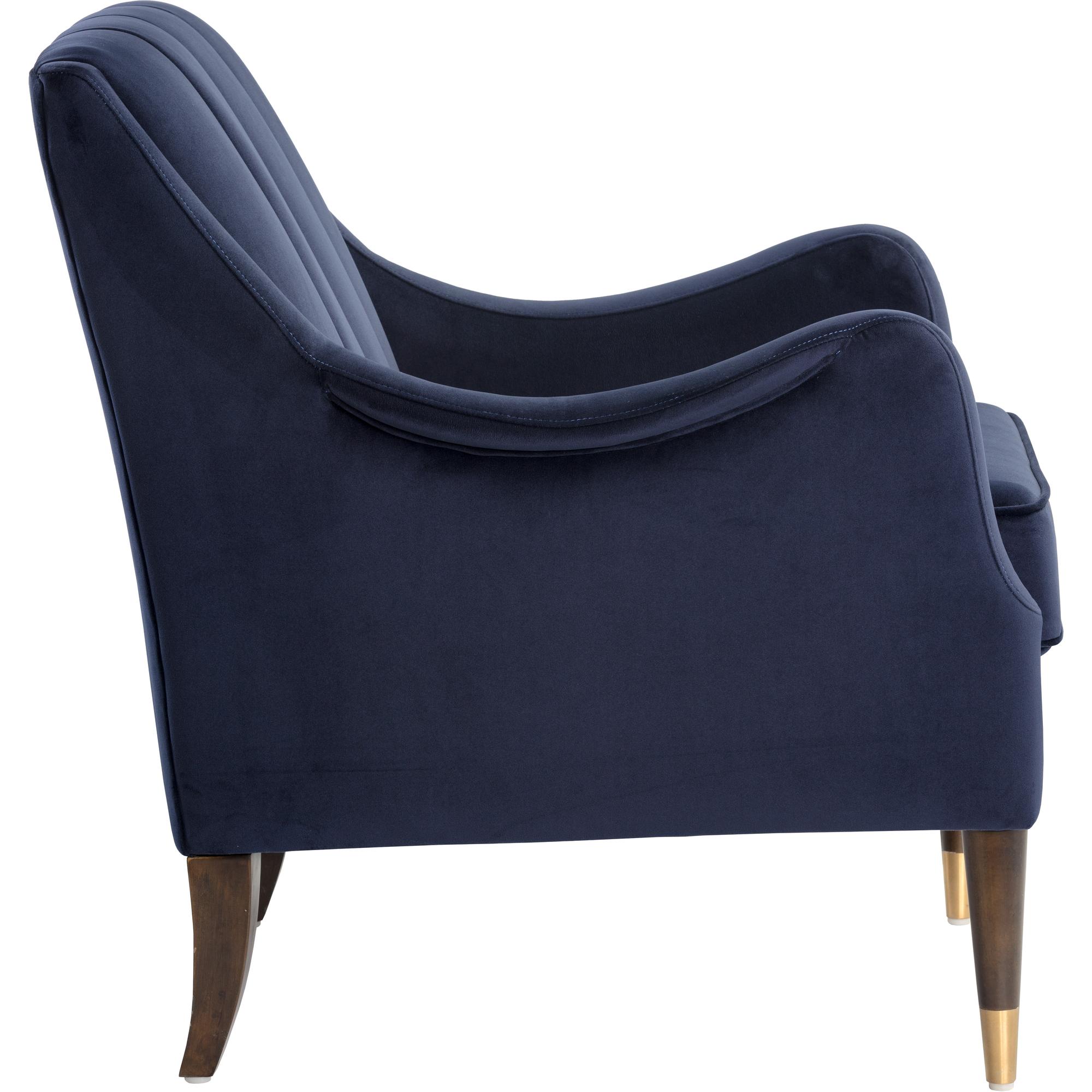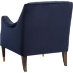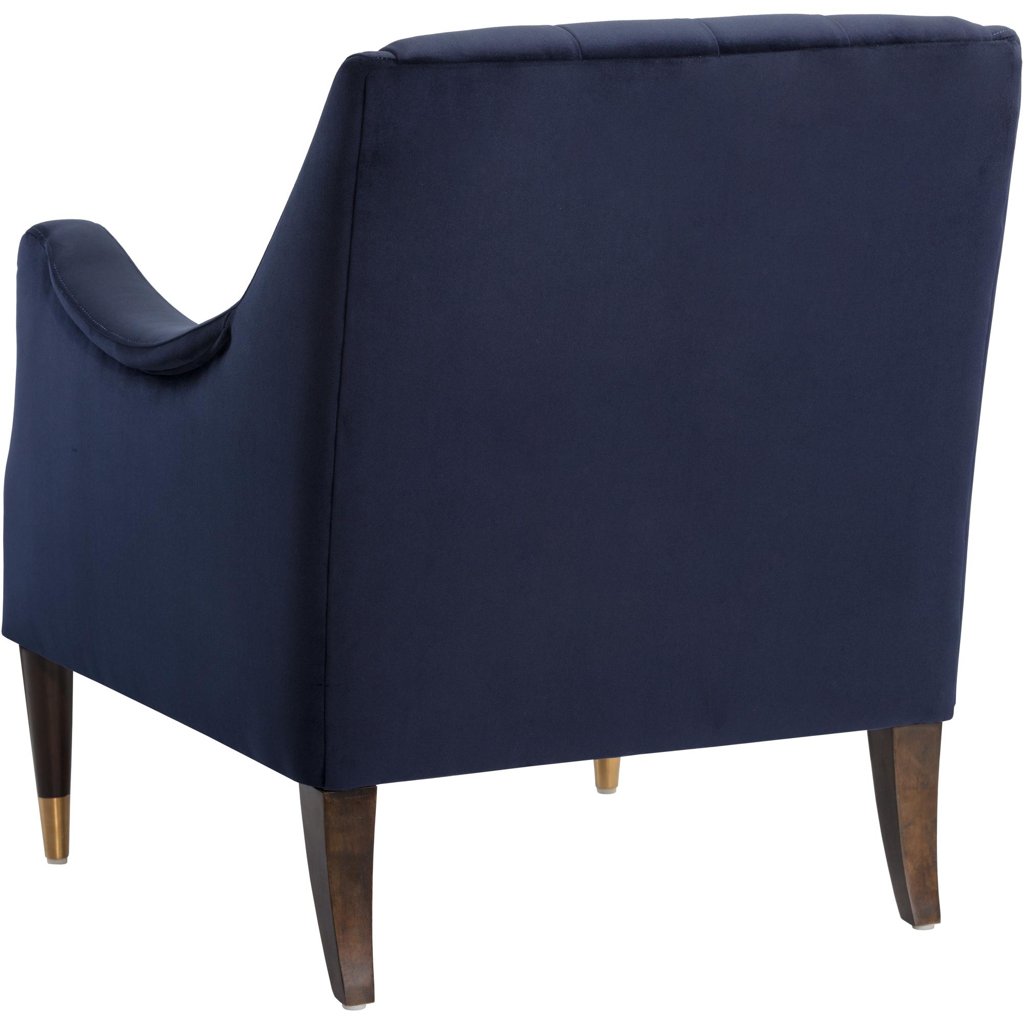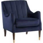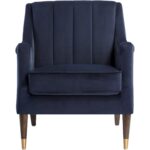 This transitional armchair sits comfortably in lush abbington navy fabric. Designed with channel tufting on the seatback and sculpted arms. Tapered acacia wood legs with antique brass footcaps complete the look. Perfect for any living, lounge or office space.