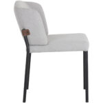 With a clean cut design, this modern dining chair illustrates the beauty of minimalism. Features a two-toned seatback with light grey fabric on the interior, and bravo cognac faux leather straps on the exterior. Completed with a black powder-coated iron frame.