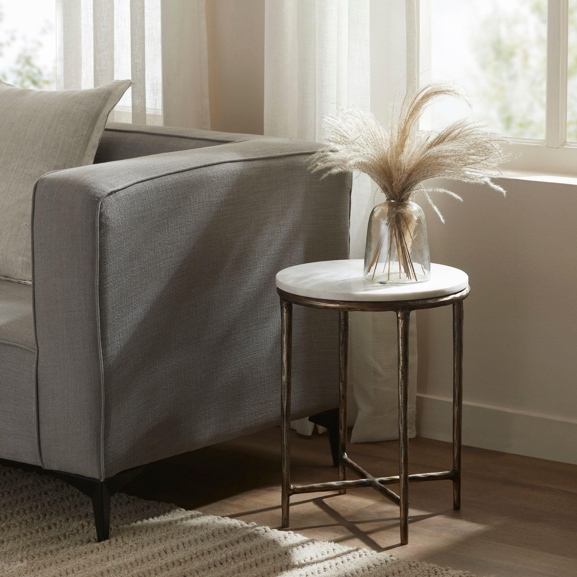 The Pearson Side Table in Antique Brass is a durable and versatile addition to your home. Crafted from sturdy cast aluminum, this table is built to last, ensuring reliability for your everyday needs. With a weight capacity ranging from 17.6 to 22.0 lbs, it provides secure support for your essentials. Its plated finish not only boasts an appealing antique brass look but also shields the table from daily use, preserving its charm over time. The sleek design and versatile antique brass finish effortlessly complement any decor style, adding a touch of elegance to your space.