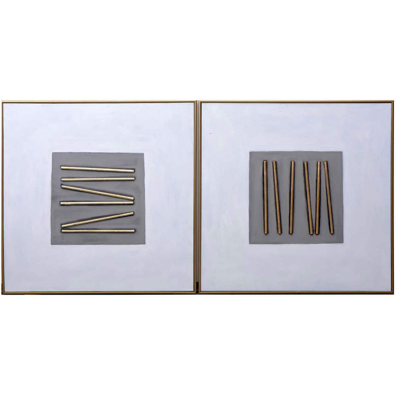 This square diptych features gold relief lines that create texture atop of painted grey squares. Install multiples for a dramatic effect. Features a gold floater frame. Each artwork is hand-painted and will feature slight variations that make every piece unique.