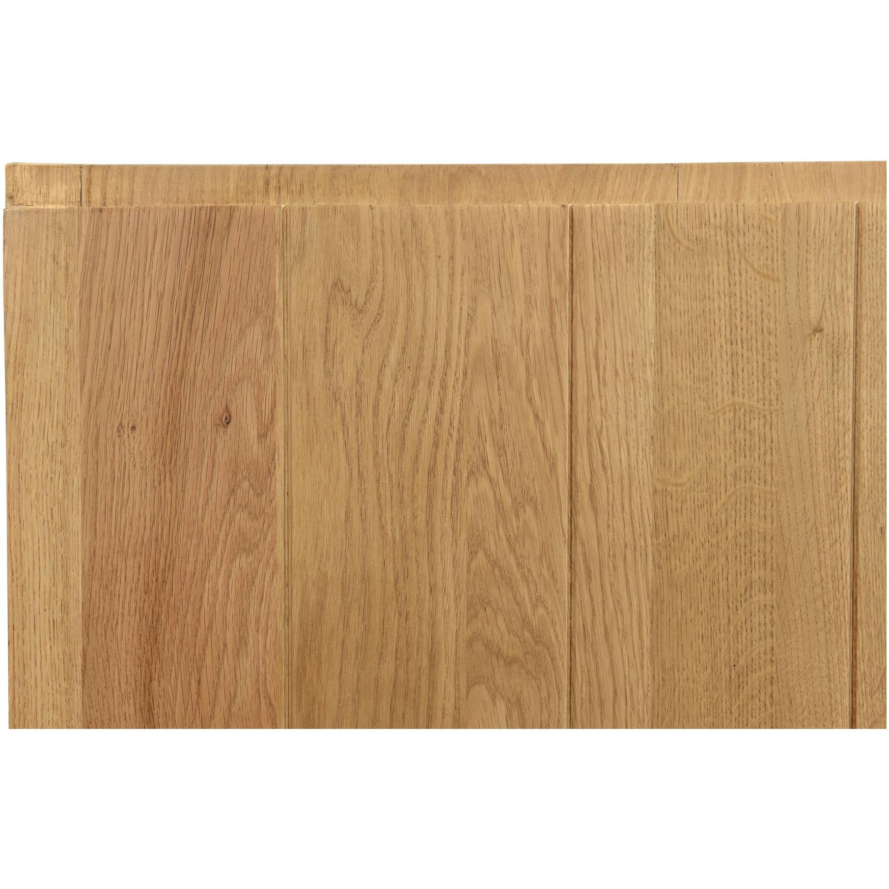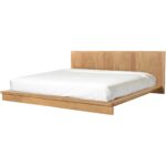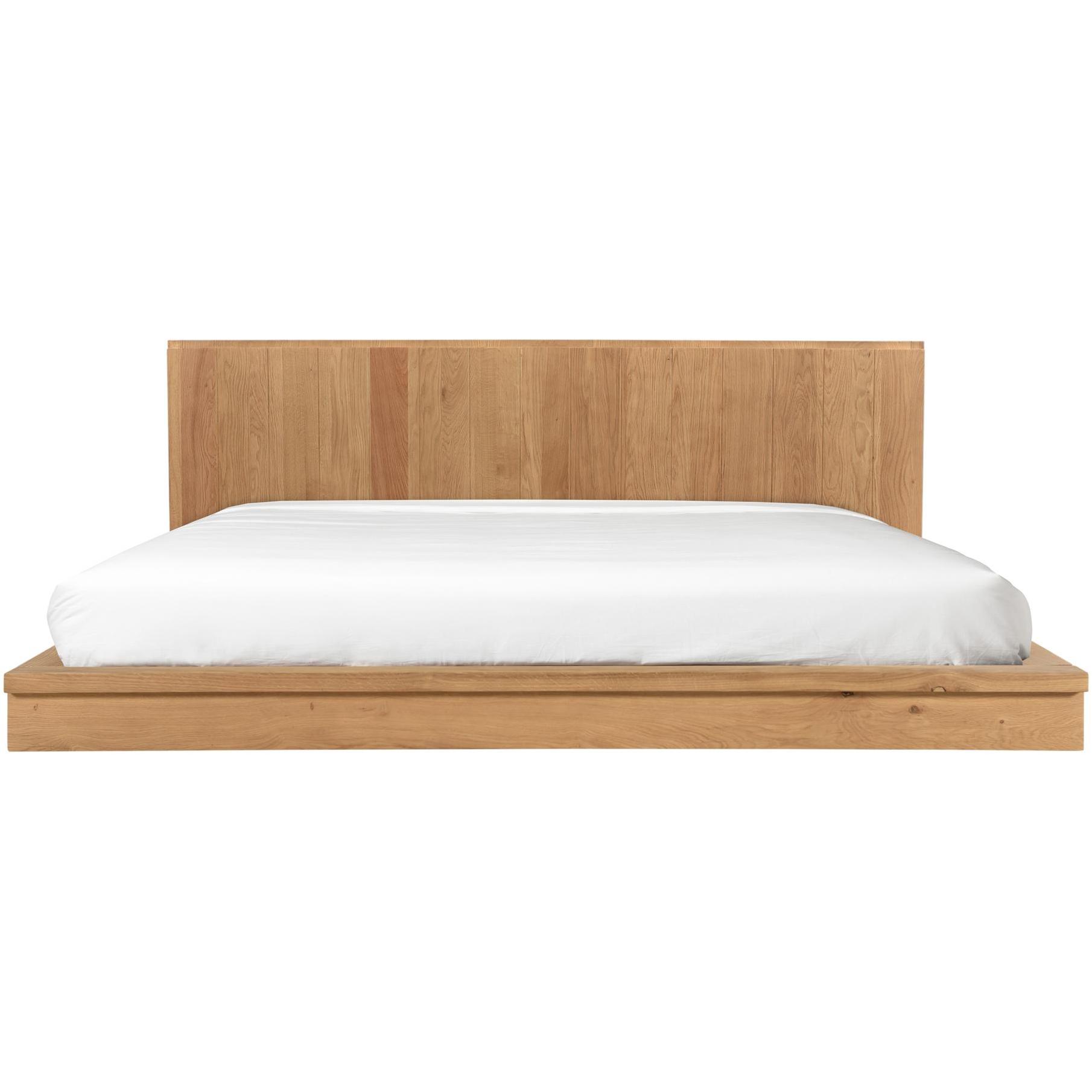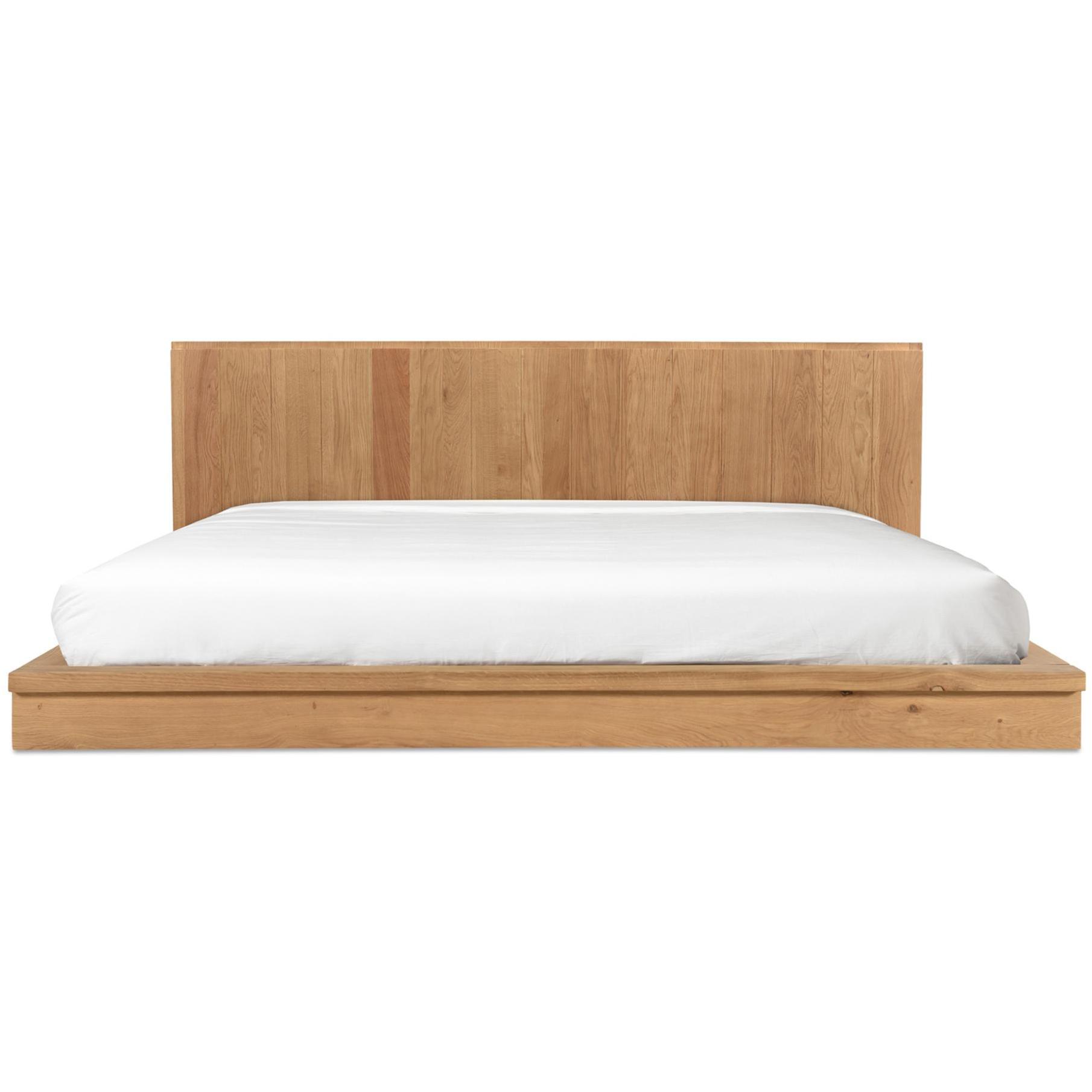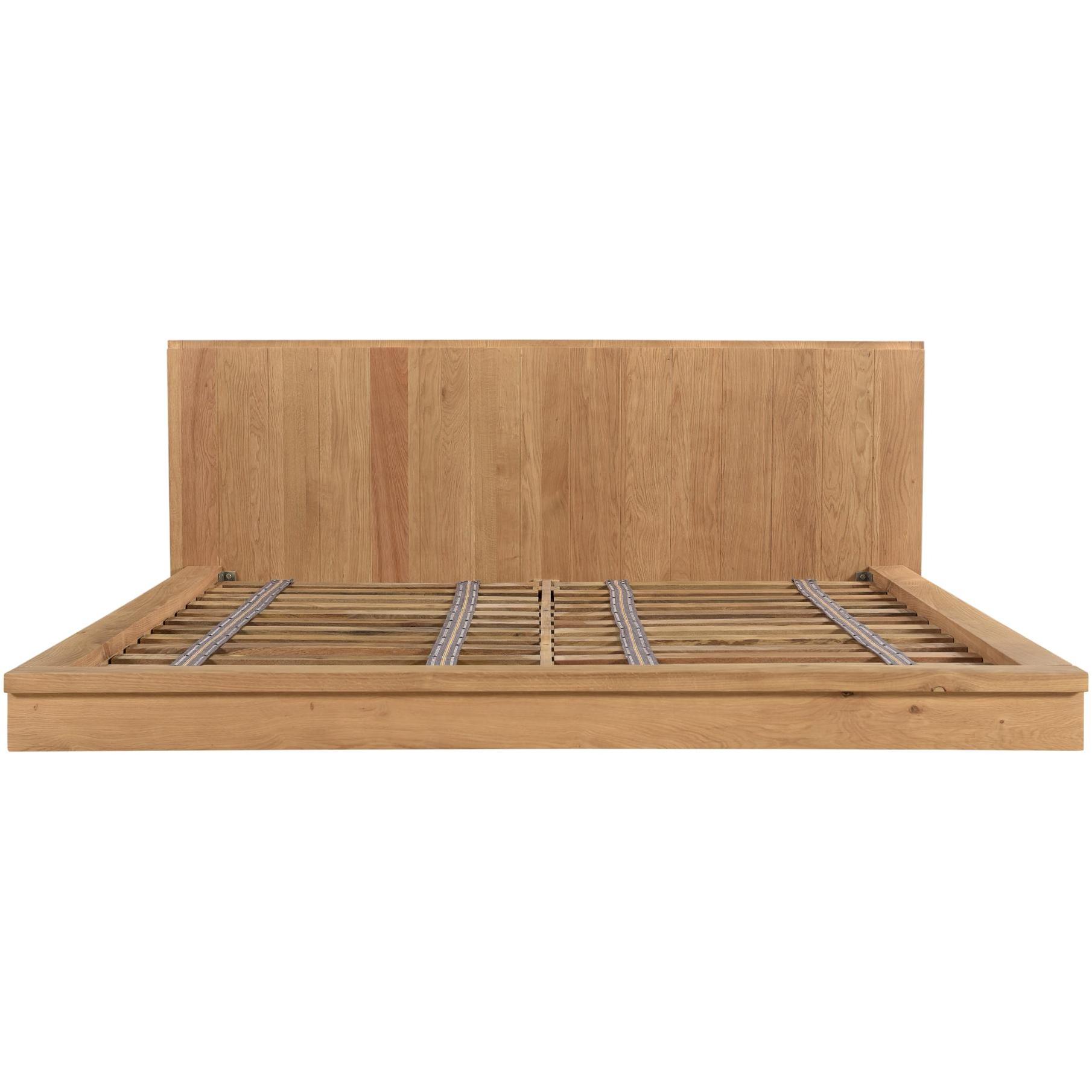 - A king bed with solid oak construction. A low-profile build features an expansive headboard