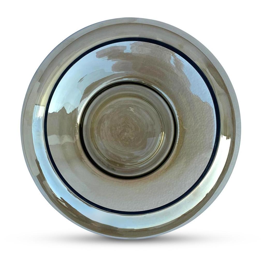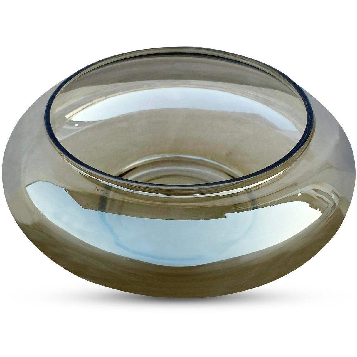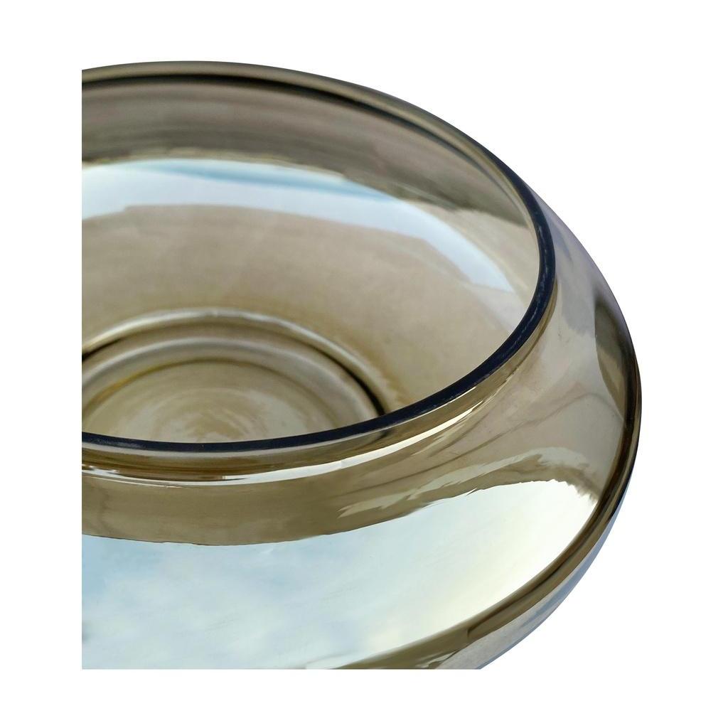 - Soft Hues: A shallow glass bowl in smoky brown with a sheen featuring topaz-colored hues that evoke the softness of vintage-colored glass.