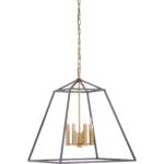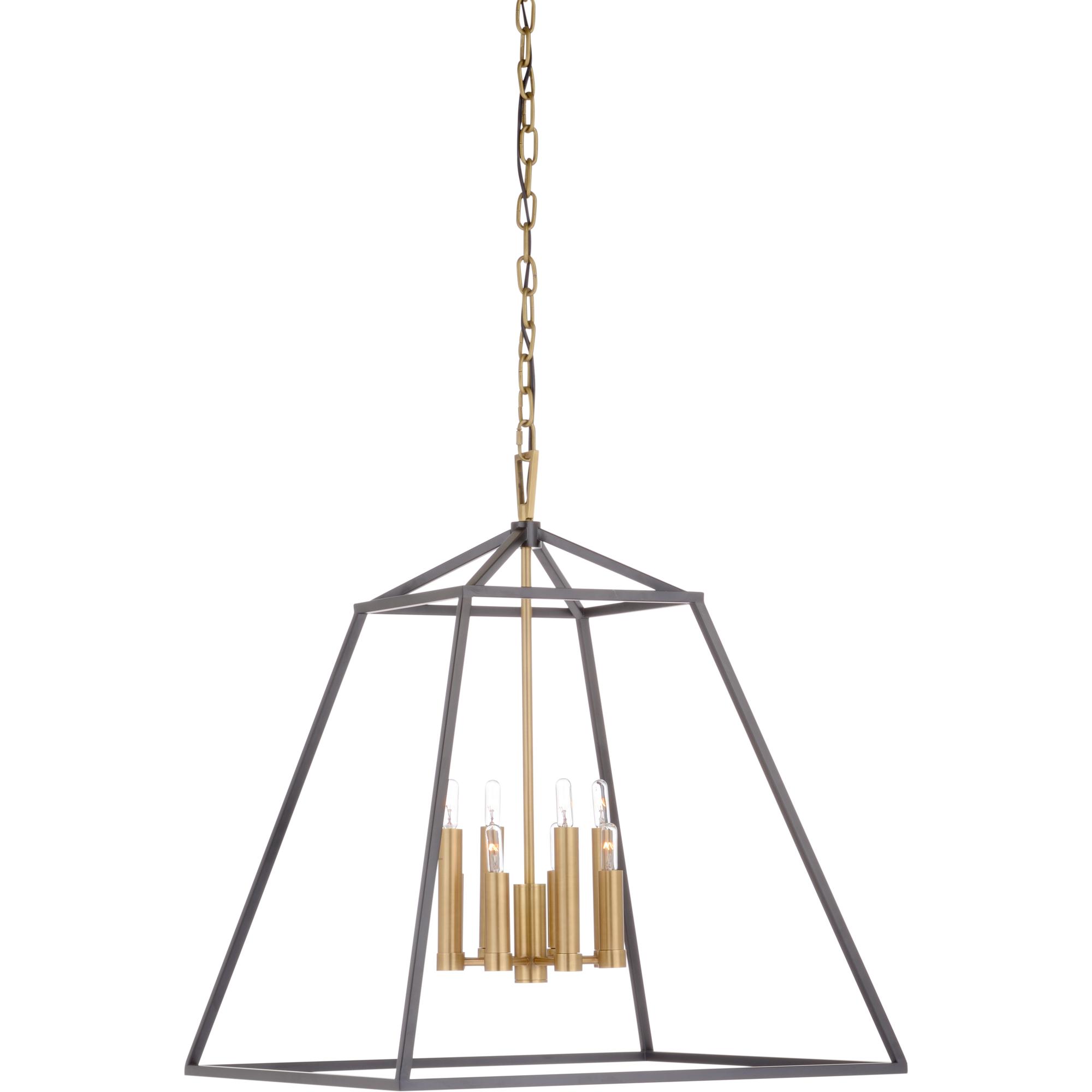 Matte black on iron with eight antique brass electrified candles. Comes with 6′ of chain.