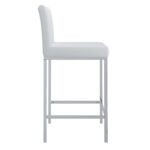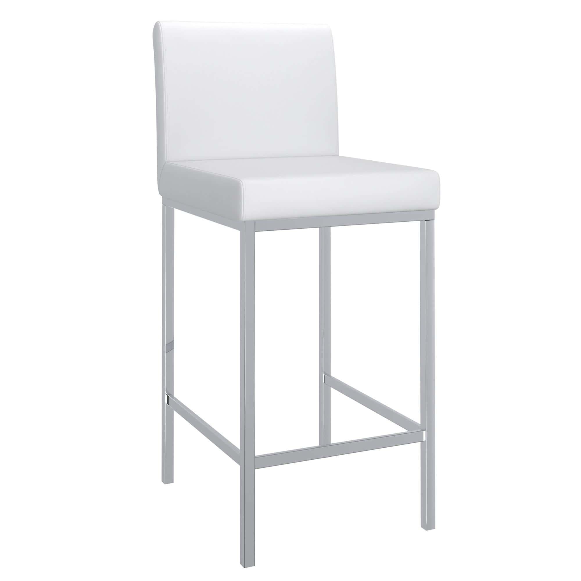 Contemporary counter height stool with faux leather and shiny chrome finishing. Combined, these two materials create a modern piece that will work will with any decor. The low back provides ample back support while adding to the minimalist appeal. Great for a casual breakfast bar or for the fancy basement bar where you can spend hours conversing with guests.