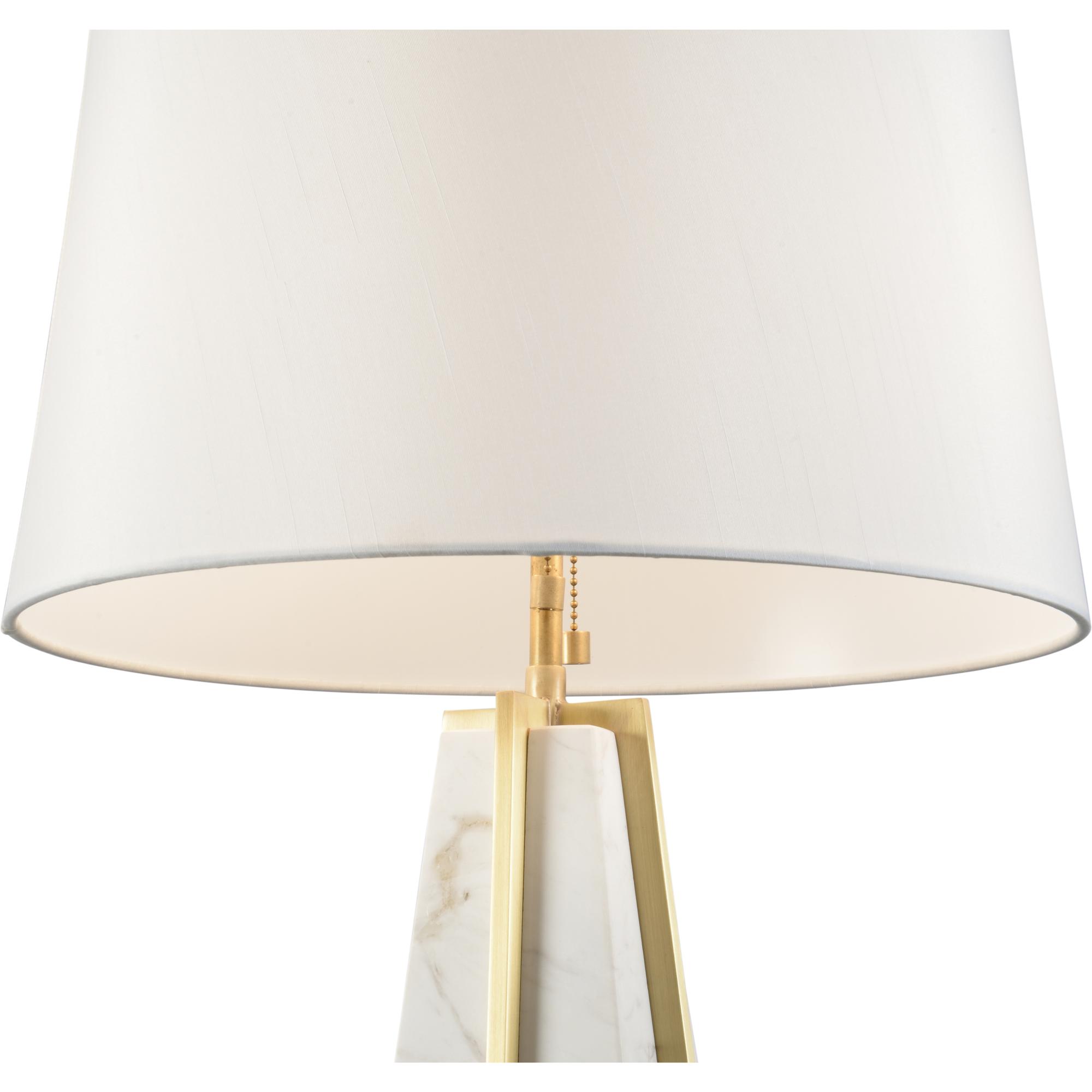 Mixed materials combine to create this handsome table lamp. Natural white carrera marble and antique brass finished metal form a pyramid shaped base ideal for illuminating any elegant modern space. Color and veining patterns may vary.