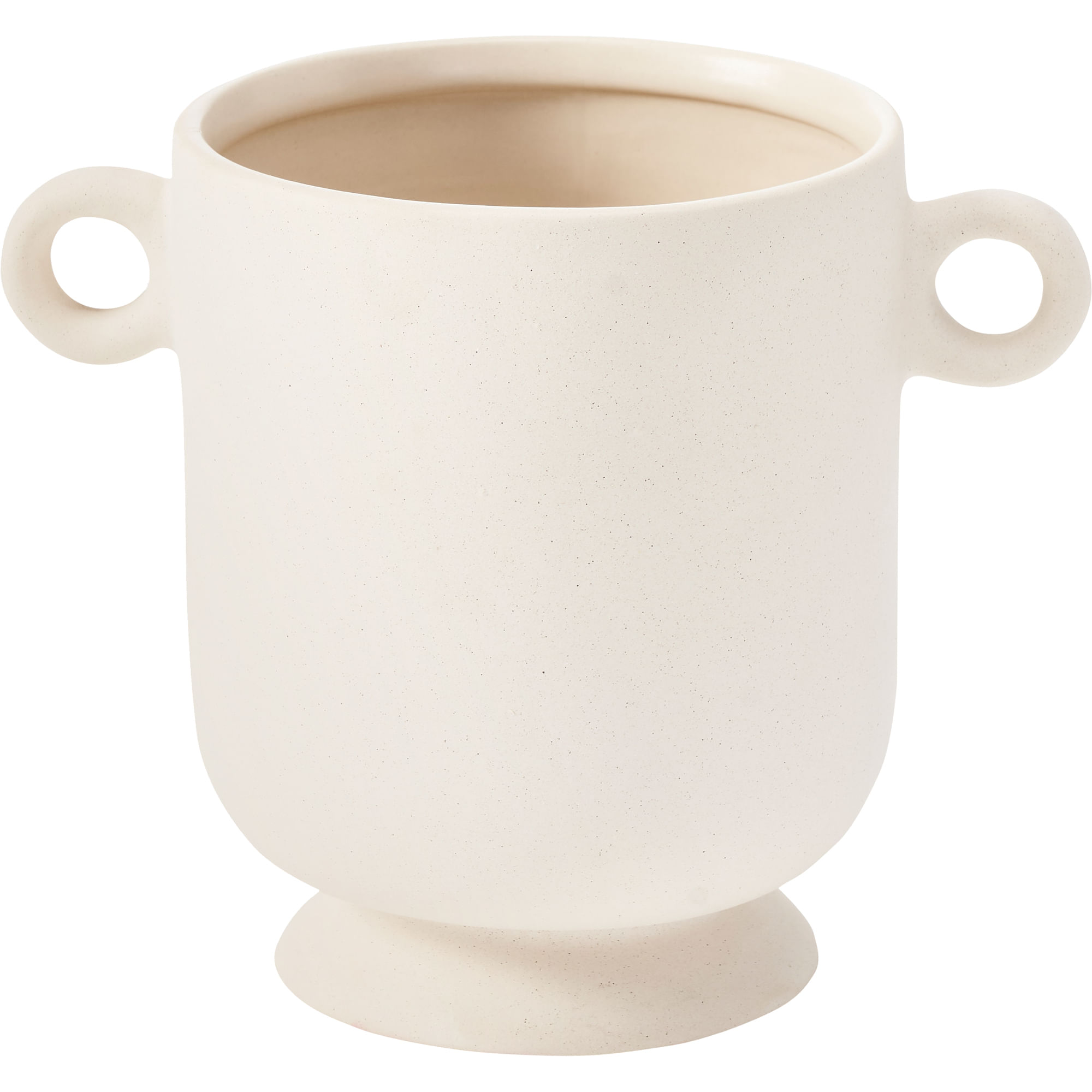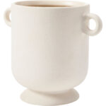 Matte cream ceramic stoneware emits an air of old-world architecture in this vase design. With a simple structure and smooth angles, it is pleasing to the eye at every passing moment. At 8.6 by 5.5 inches, it holds a small stature that is optimal for arrangement on a bookshelf or mantel.