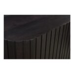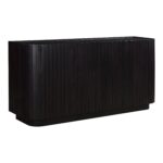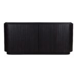 A convergence of shape and form, the Povera 4 door sideboard balances detail and form. This piece anchors the dining room with its Acacia façade’s gentle ribbing reminiscent of ripples and waves adding texture and warmth. A rich black finish with a soft purple undertone allows the natural wood grain to show through. Somberly beautiful with an impactful silhouette, four doors open to reveal three adjustable shelves in a roomy interior.