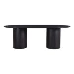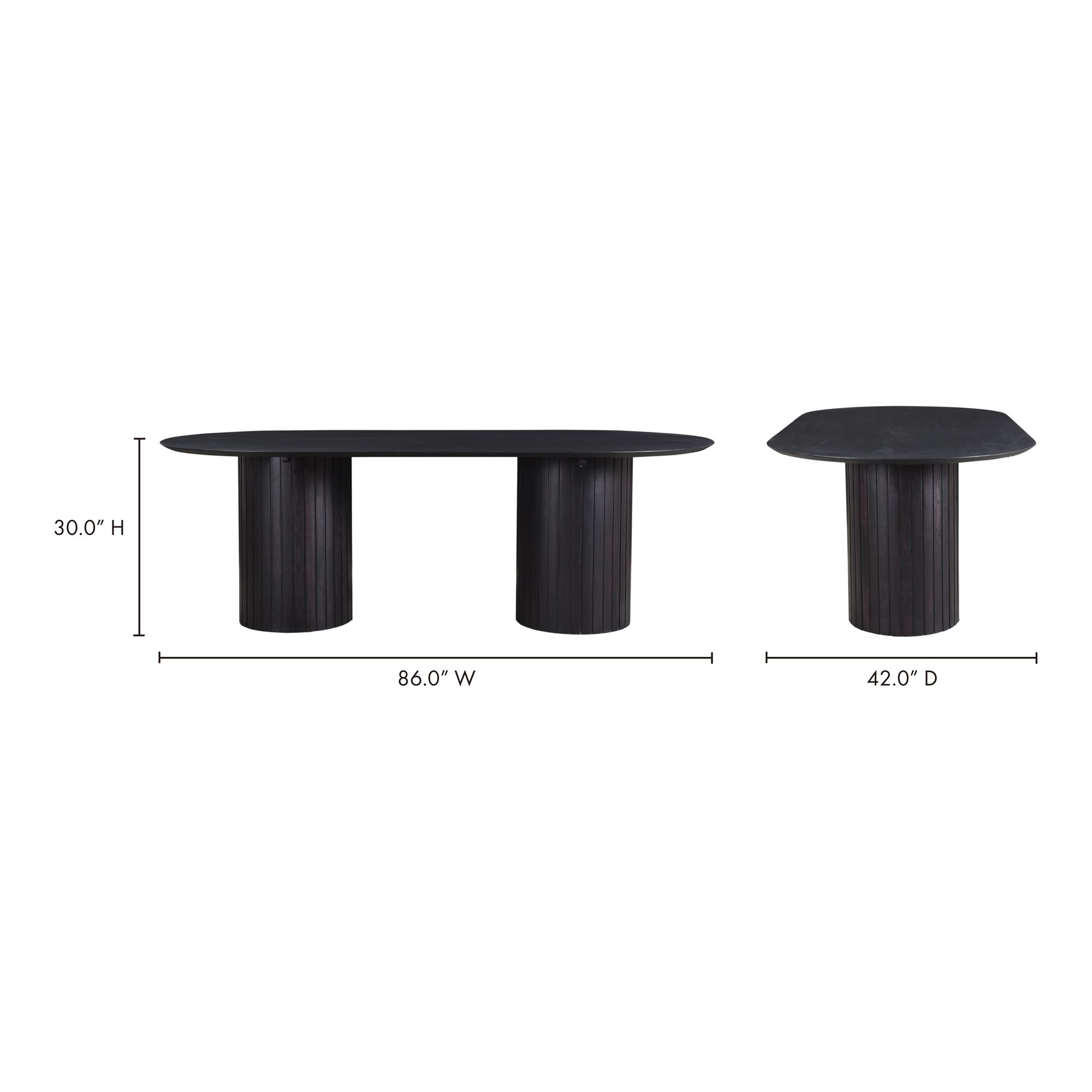 A convergence of shape and form, the Povera dining table will serve as the pillar of your dining area. Povera features two large columns supporting an expansive tabletop, their gentle ribbing reminiscent of ripples and waves. With a rich black finish featuring a soft purple undertone that allows the natural wood grain of the Acacia wood to show through, this dining table uses simple geometry and natural materials to form an experience. Offering bold statement appeal, Povera incorporates the elegance of ratio into your dining area.