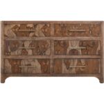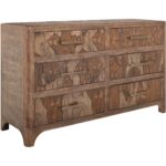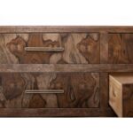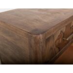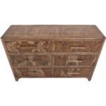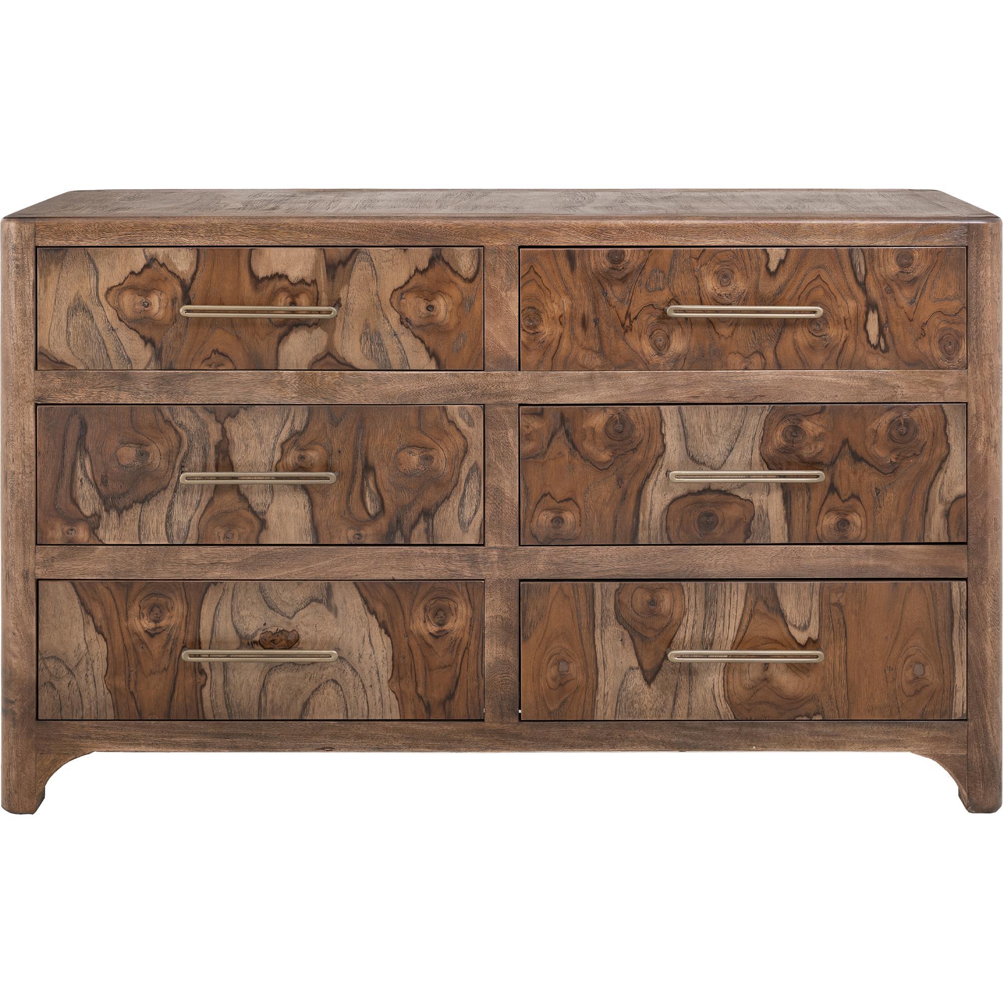 Transform your space with this modern bedroom set. Crafted from engineered teak and sustainable mango wood, this collection combines lasting durability with natural beauty. The rich brown multi-step lacquer finish adds warmth and depth to the furniture. The Praga Dresser has six spacious drawers for ample storage. The aged golden handles add a touch of sophistication, while its short, sturdy legs provide balance and stability, making it a versatile addition to any space.