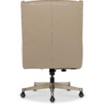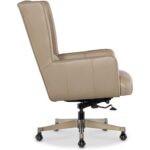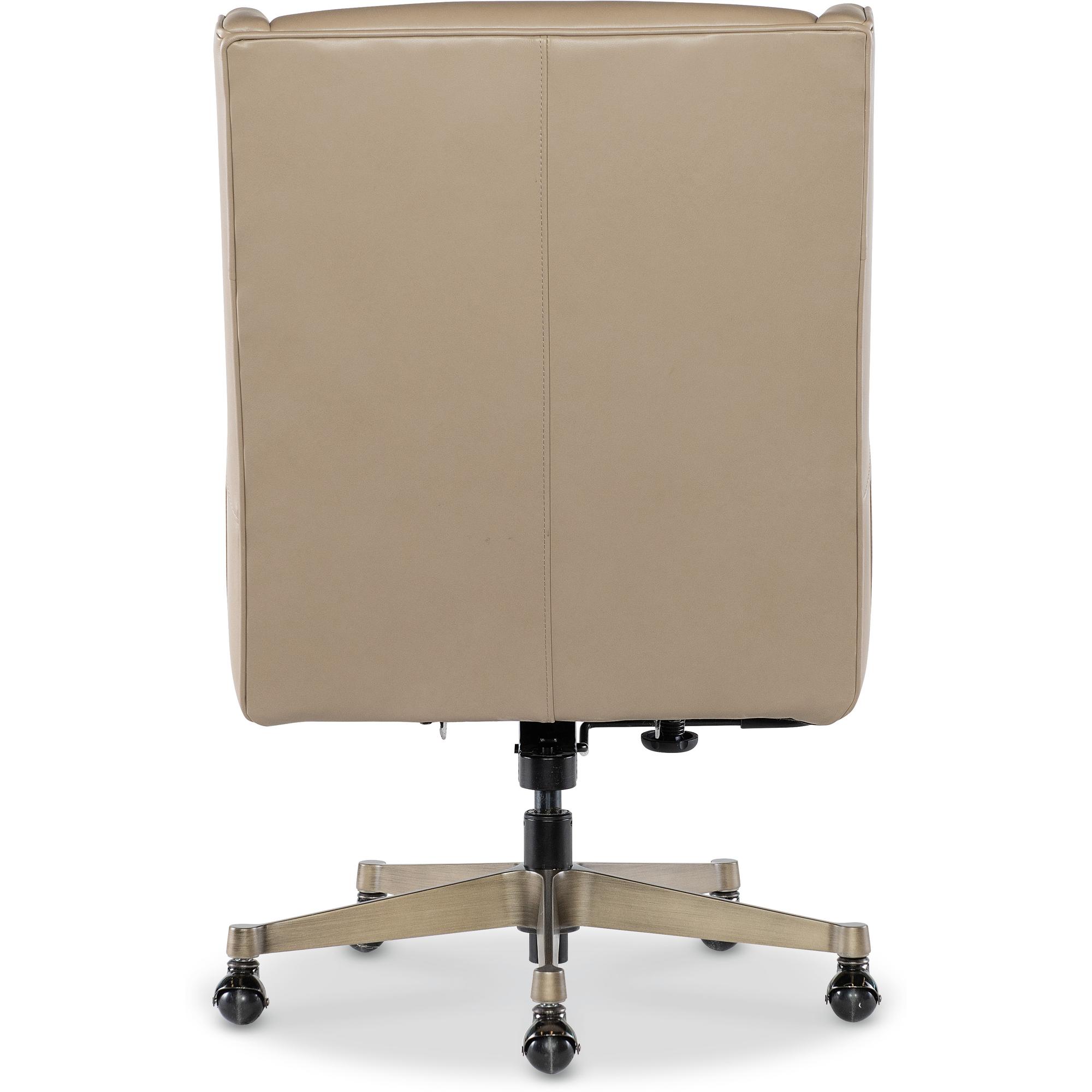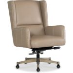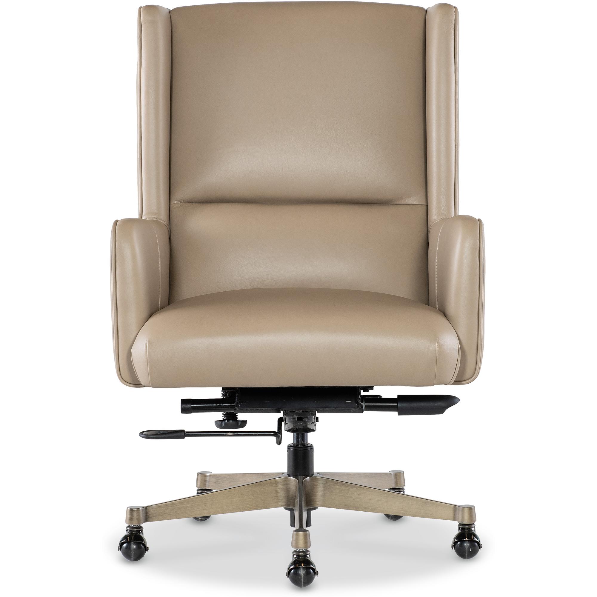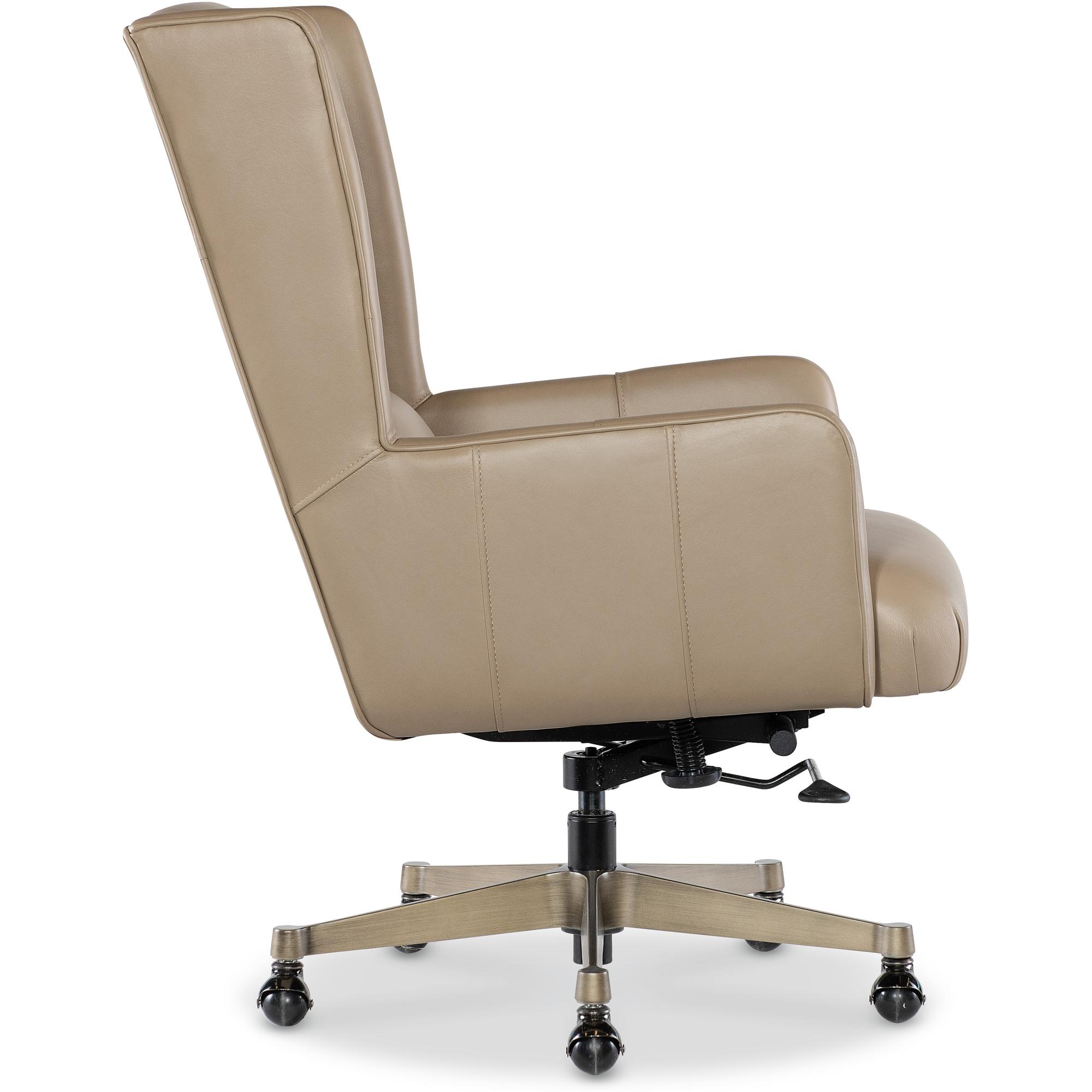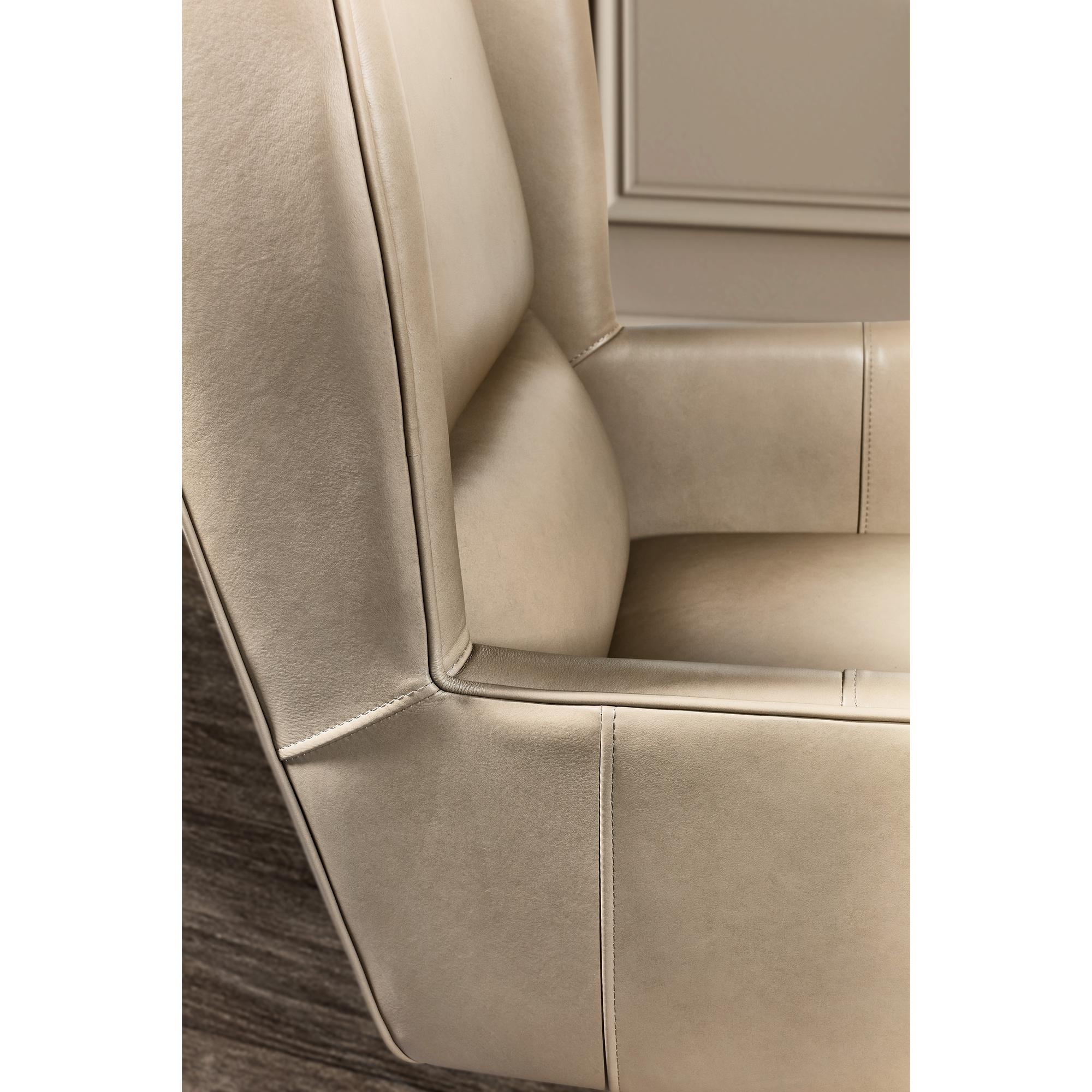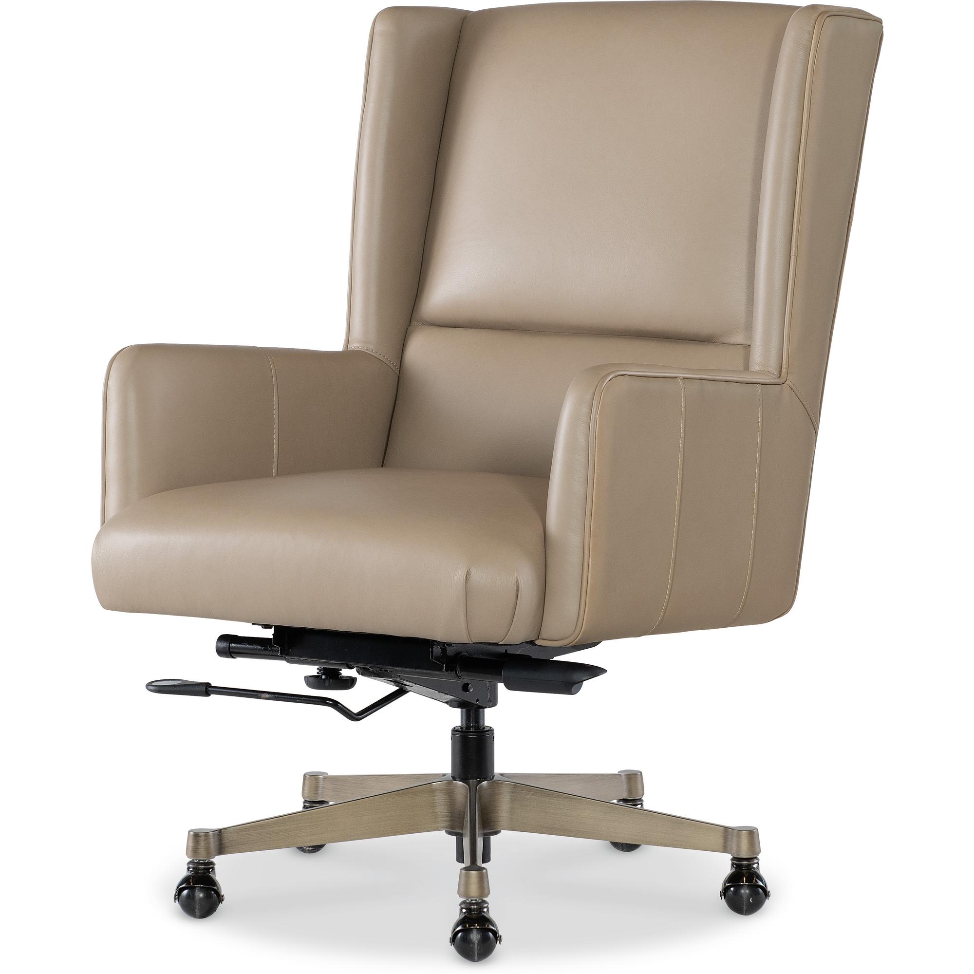 Features: Modern transitional wing back design Glazed gold base Black nickel casters Leather features a subtle two-tone color with mid-sheen and has been pigmented and corrected with a natural grain and soft silky finish