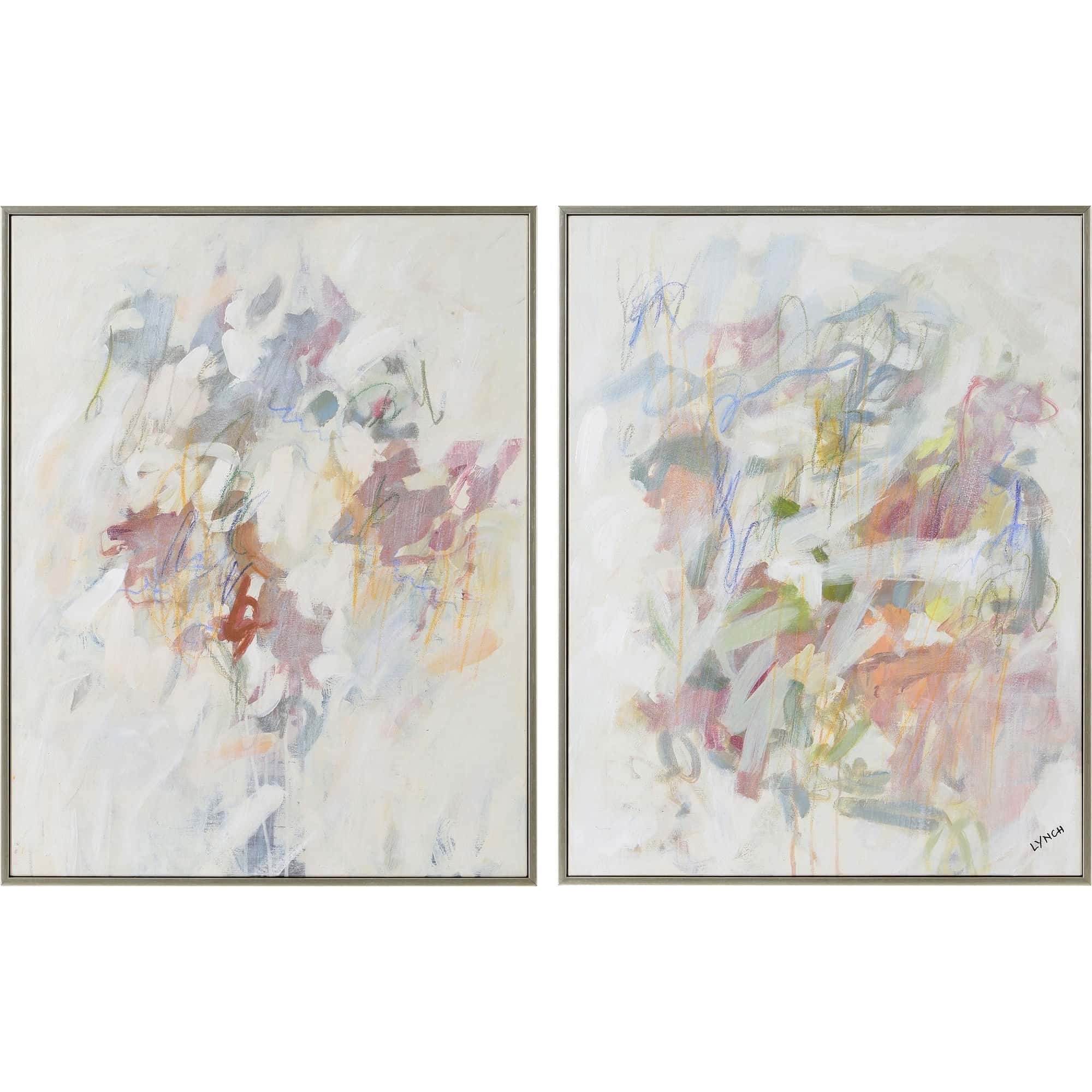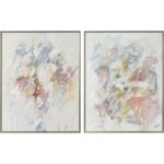 Graffiti style art gets a delicate, romantic makeover in this set of two canvas paintings. Created to be hung vertically or horizontally, each piece has its own variation on the design, allowing both to stand out. While the grey backdrop and pops of blue and green add to its beauty, the dusty rose details elevate each piece to new heights.