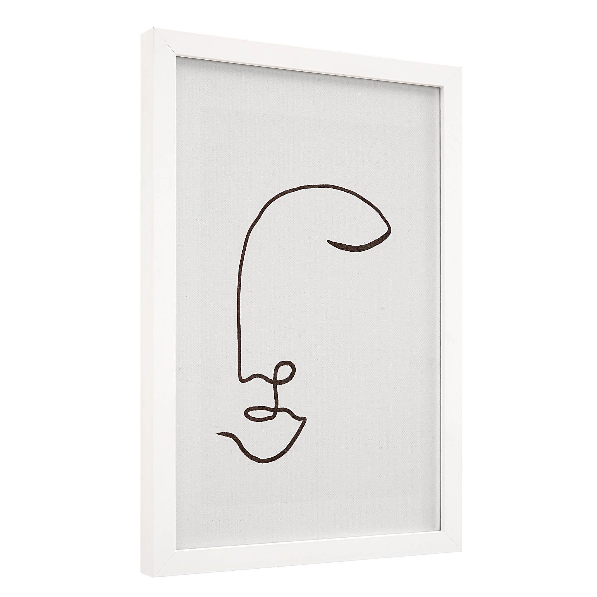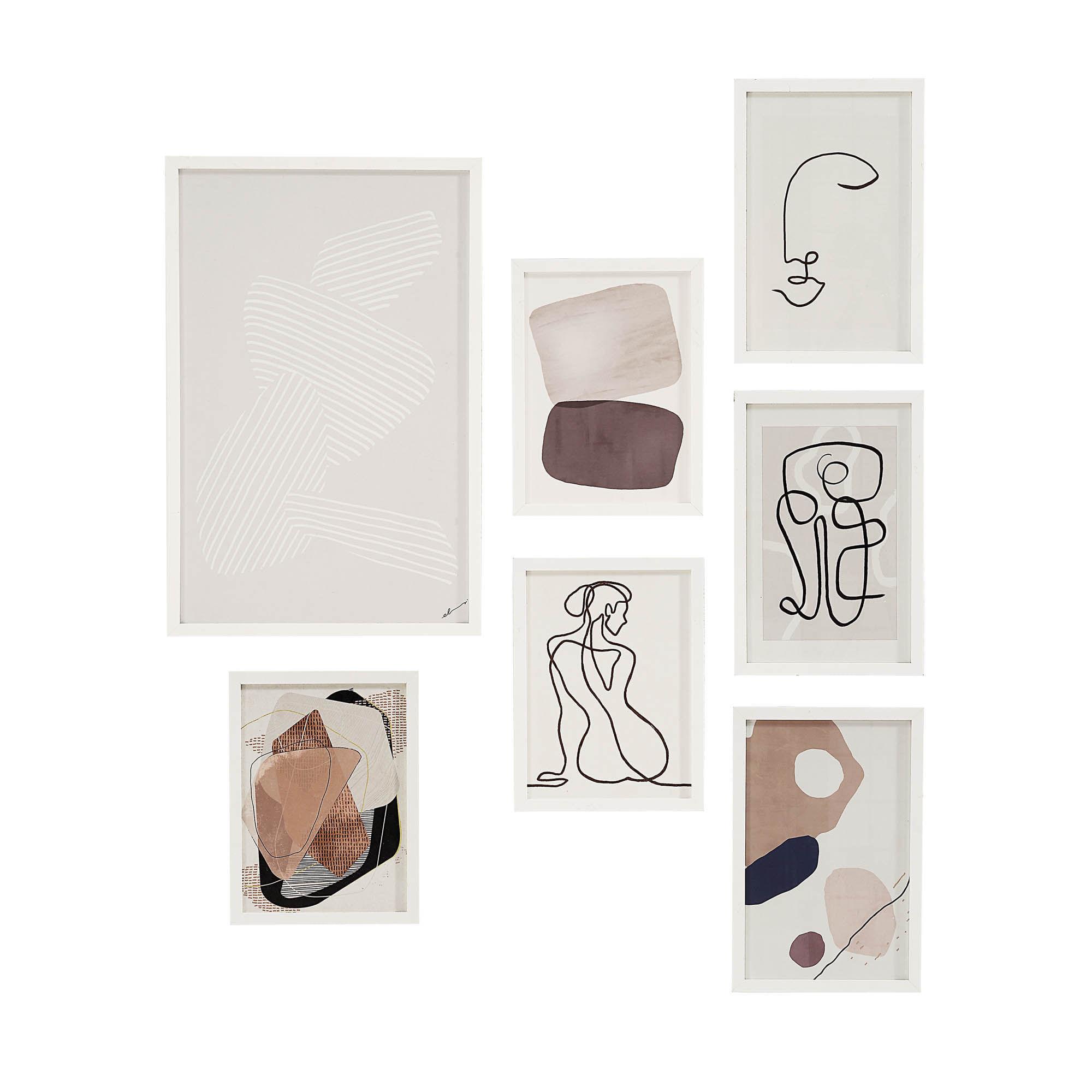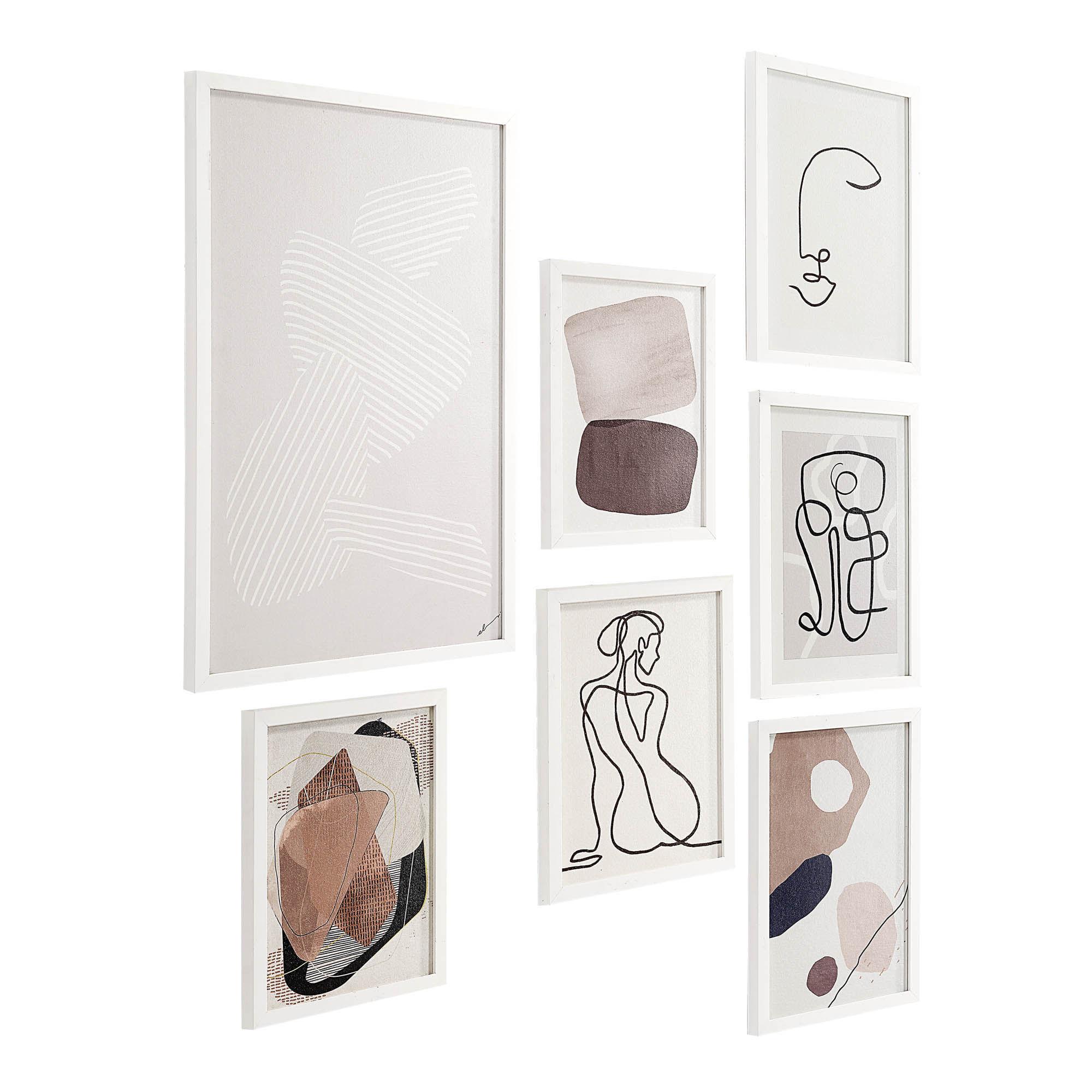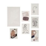 This set of seven wall art designs tells a story through its blend of modern designs, featuring both abstract and portrait influences. With a subtle, soothing palette, this set of framed canvases are suitable for bedroom and living spaces where the aim is to create a serene space. With each print’s colors complementing the other, the set allows for seemingly endless arrangement opportunities, giving the homeowner a chance to change the look over time.