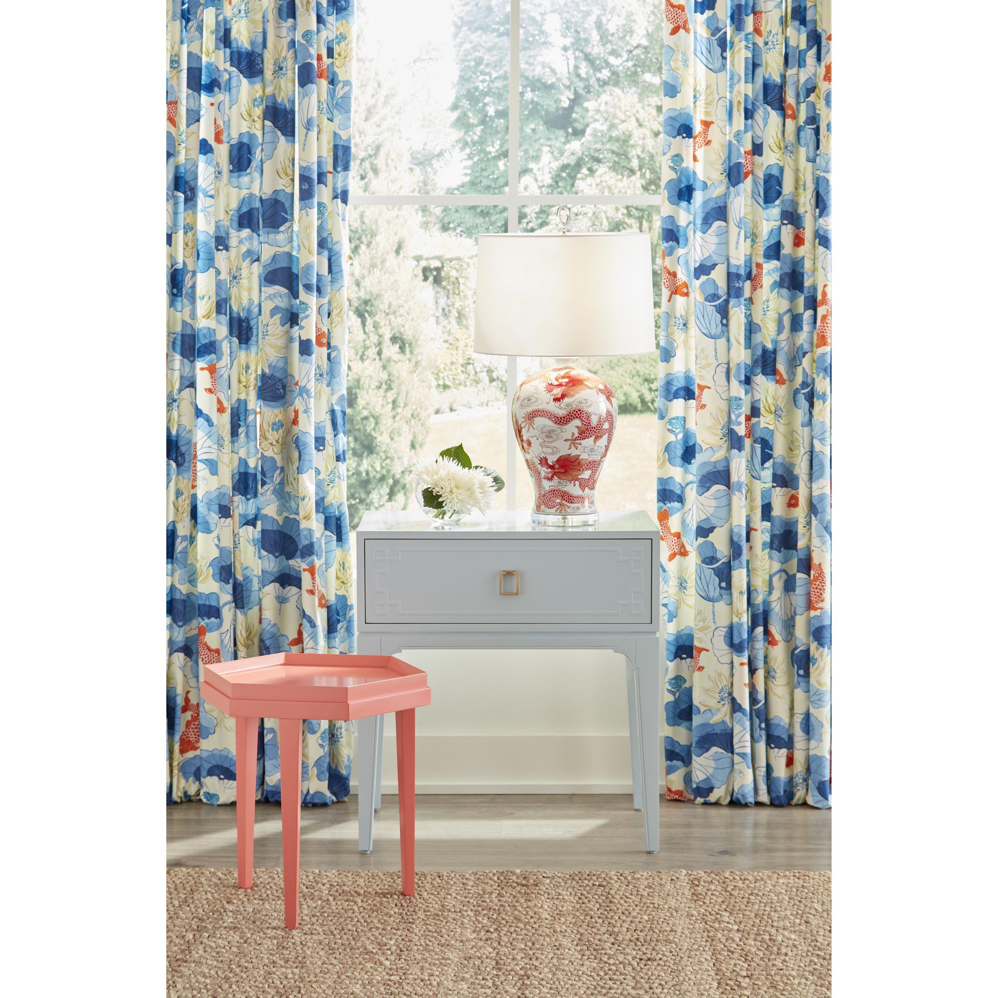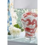 Our prosperity lamp is a modern take on a classic. Traditional Asian dragons are hand painted on white porcelain. The crisp white drum shade and acrylic base add elegance while keeping the focus on the festive design.