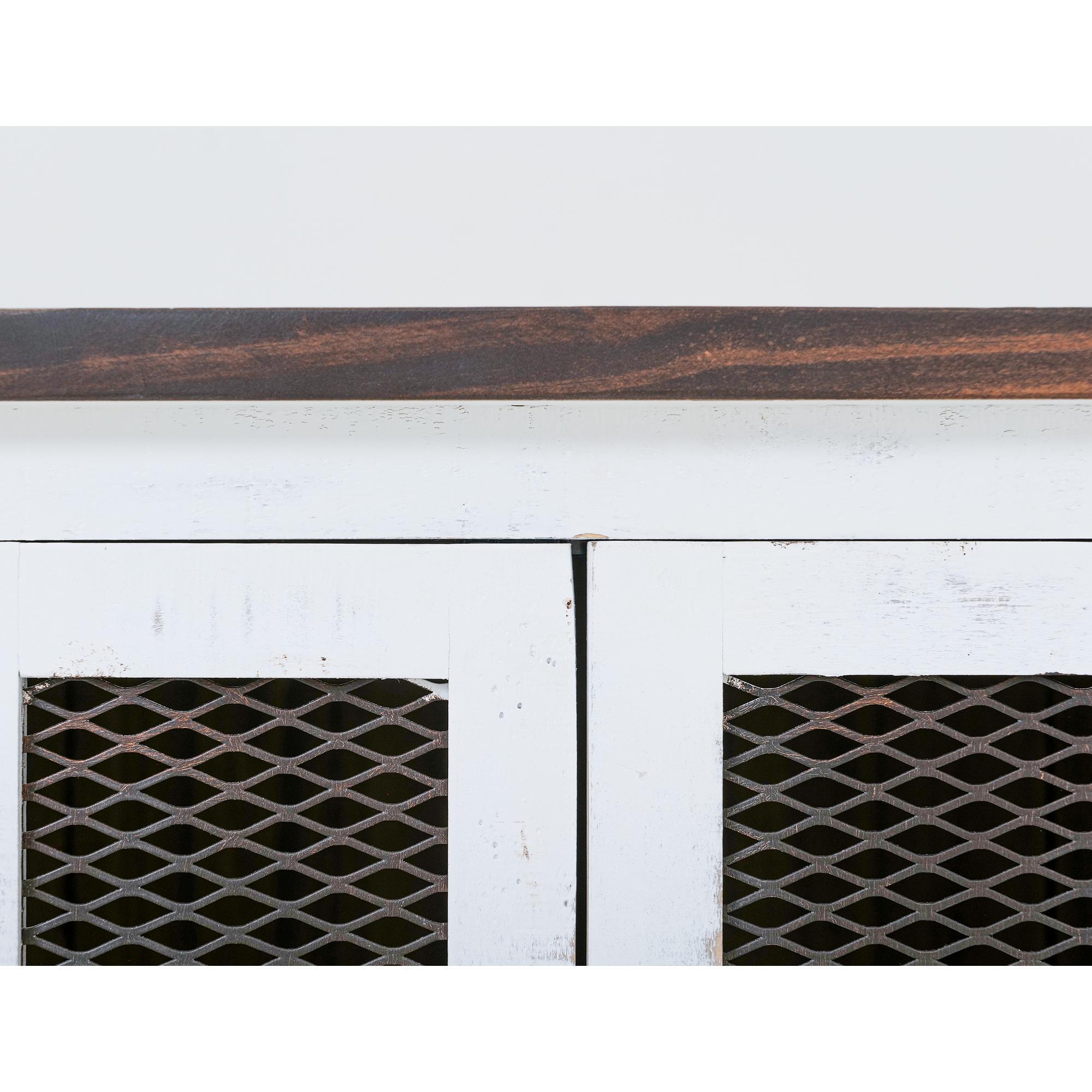 - Two-tone, multi-step lacquer finish with a weathered white effect on hand-distressed wood and brown tops.