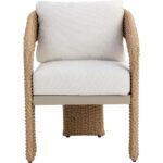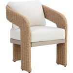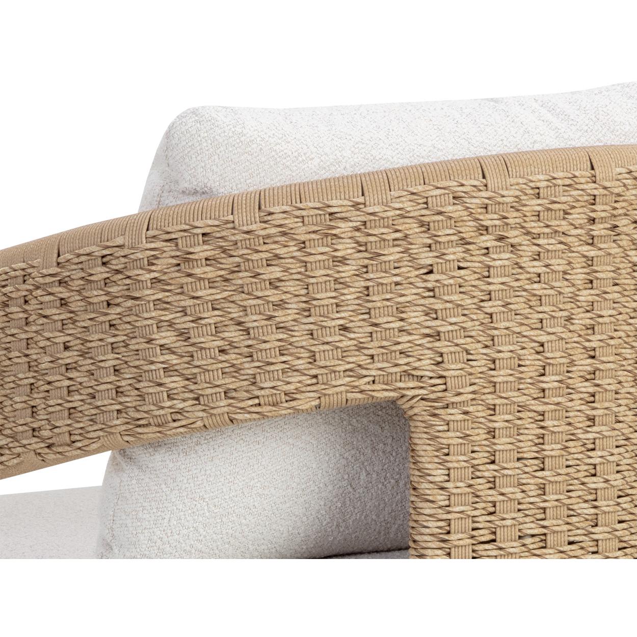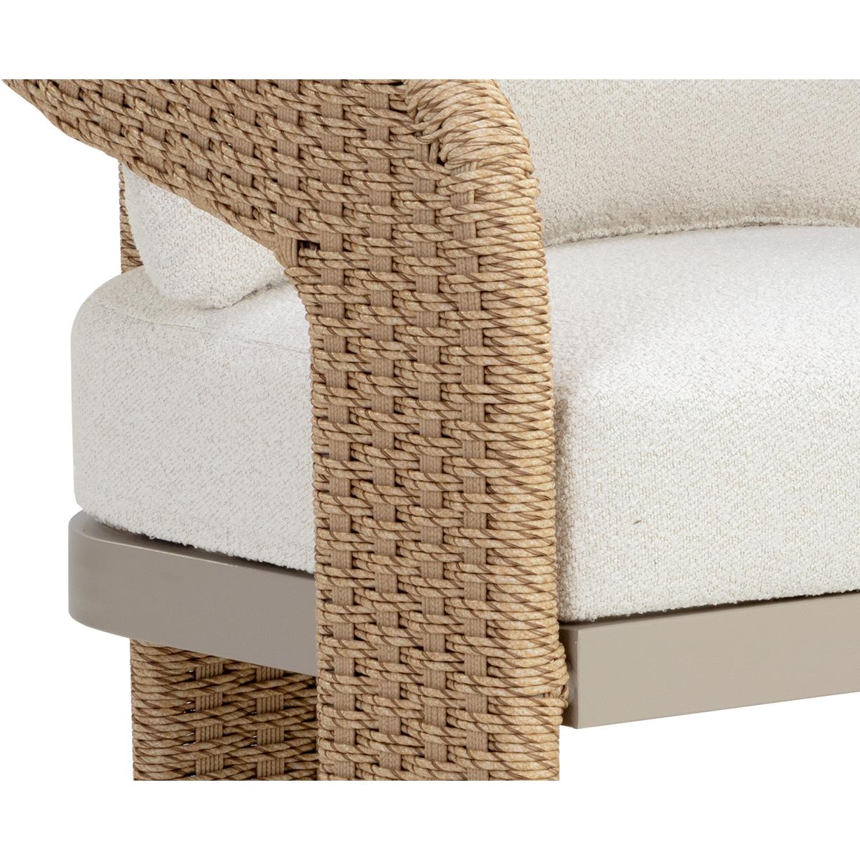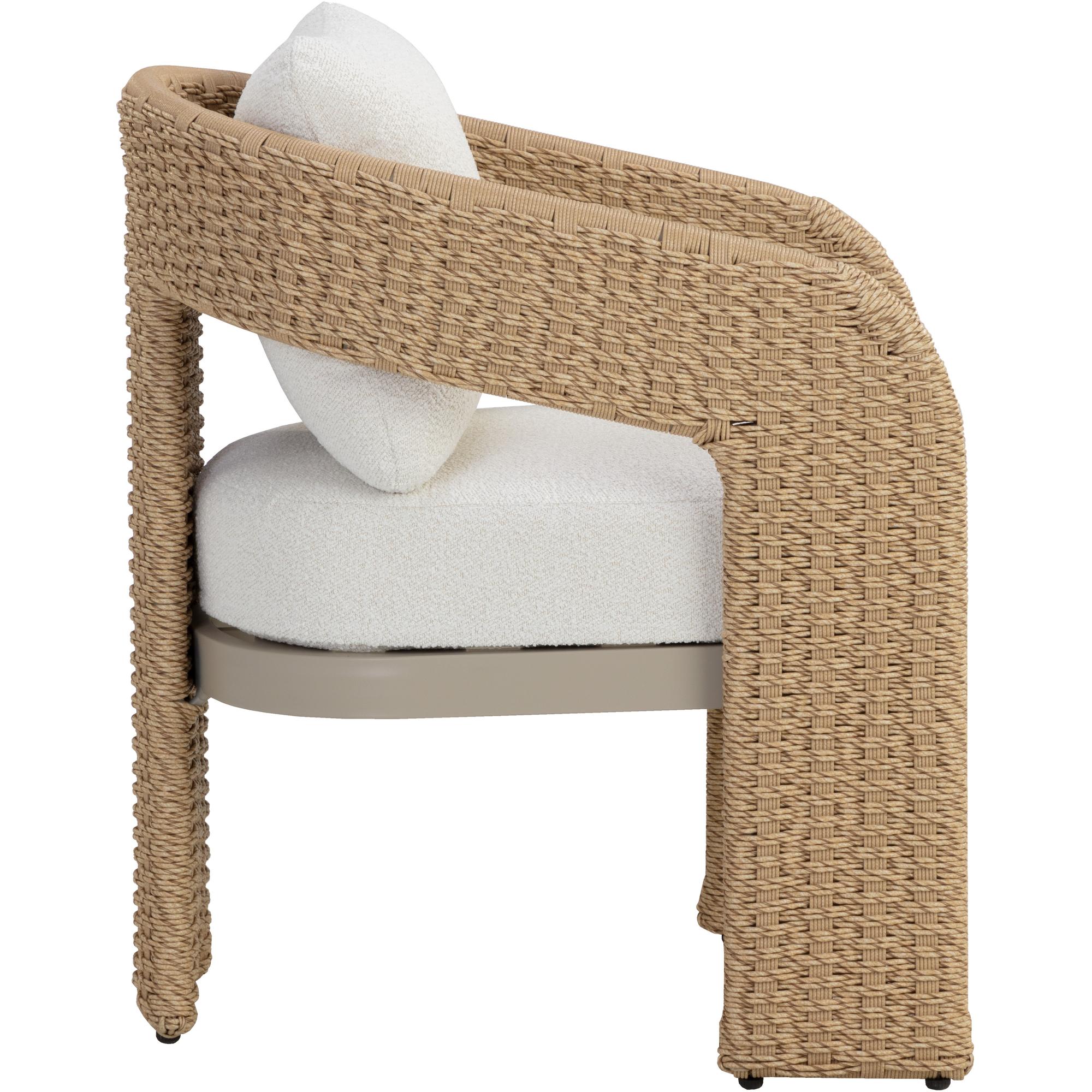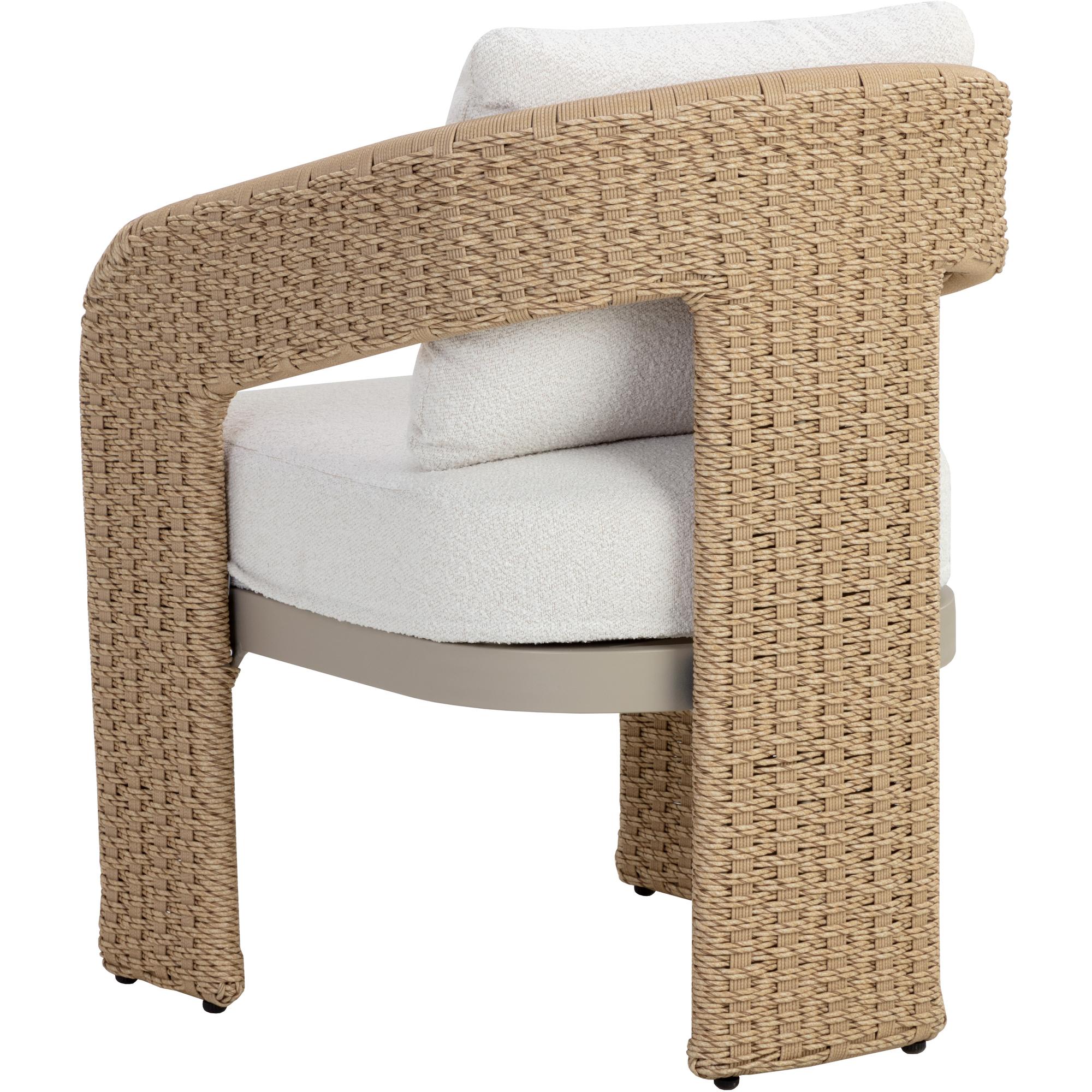 The geometric curves of the Pylos Dining Chair will effortlessly stand out in any outdoor area. Twisted wicker in a natural finish wraps around an aluminum frame for a defined, textured look. Soft cushioning in our louis cream outdoor boucle performance fabric completes the design.