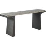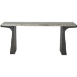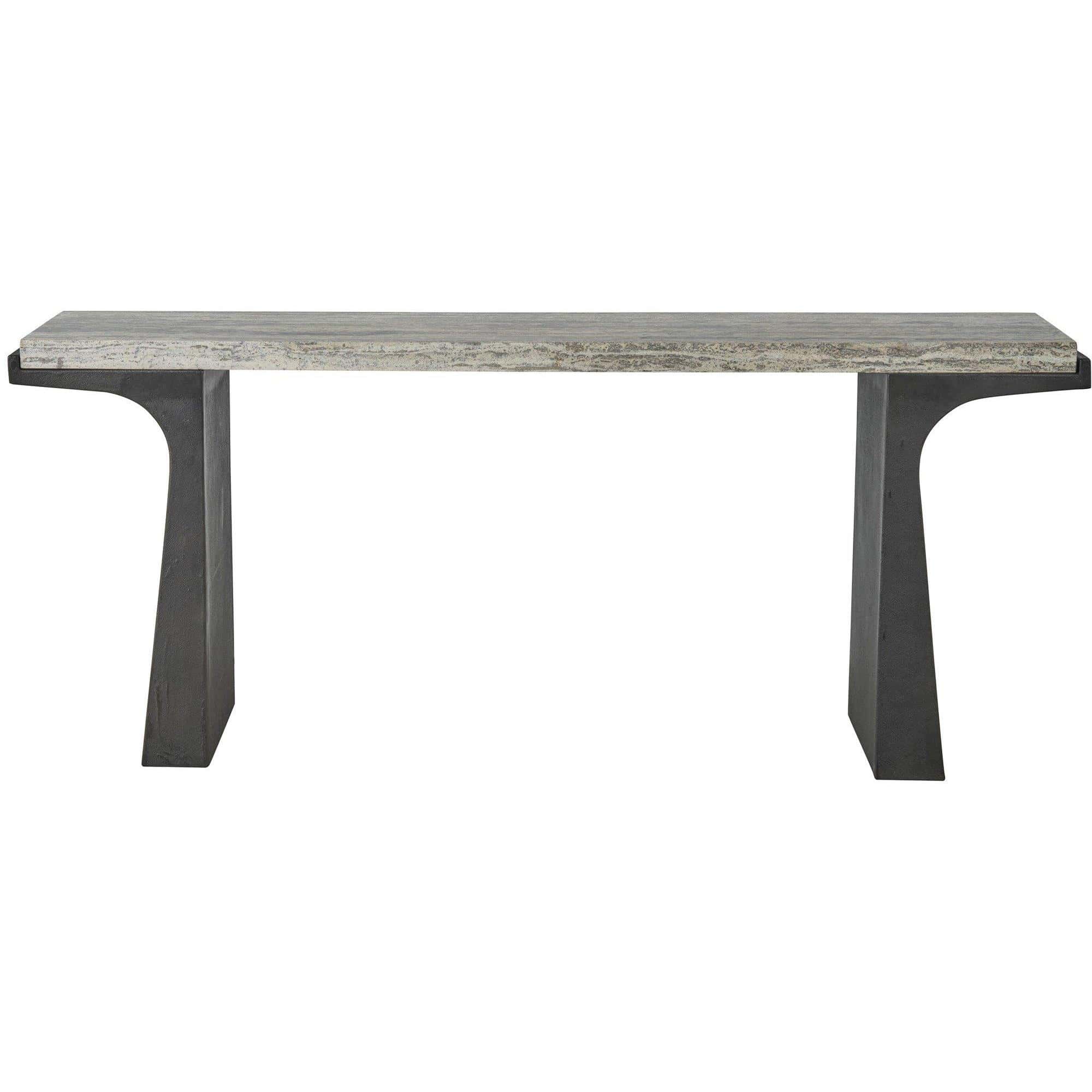 The Quill Console Table presents a sleek, abstract expression in design, featuring a White Travertine top elegantly perched on a pedestal of Aluminum with a Dark Bronze finish. This piece introduces a touch of matte texture and intrigue, effortlessly enhancing spaces with its unique aesthetic and refined presence.