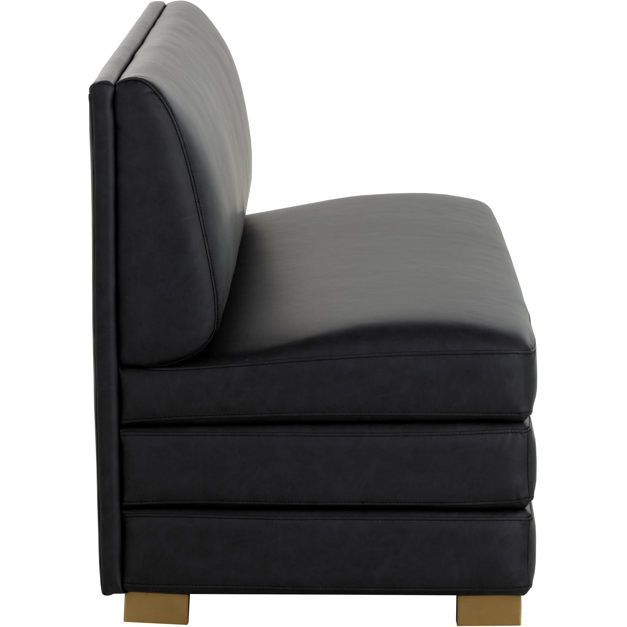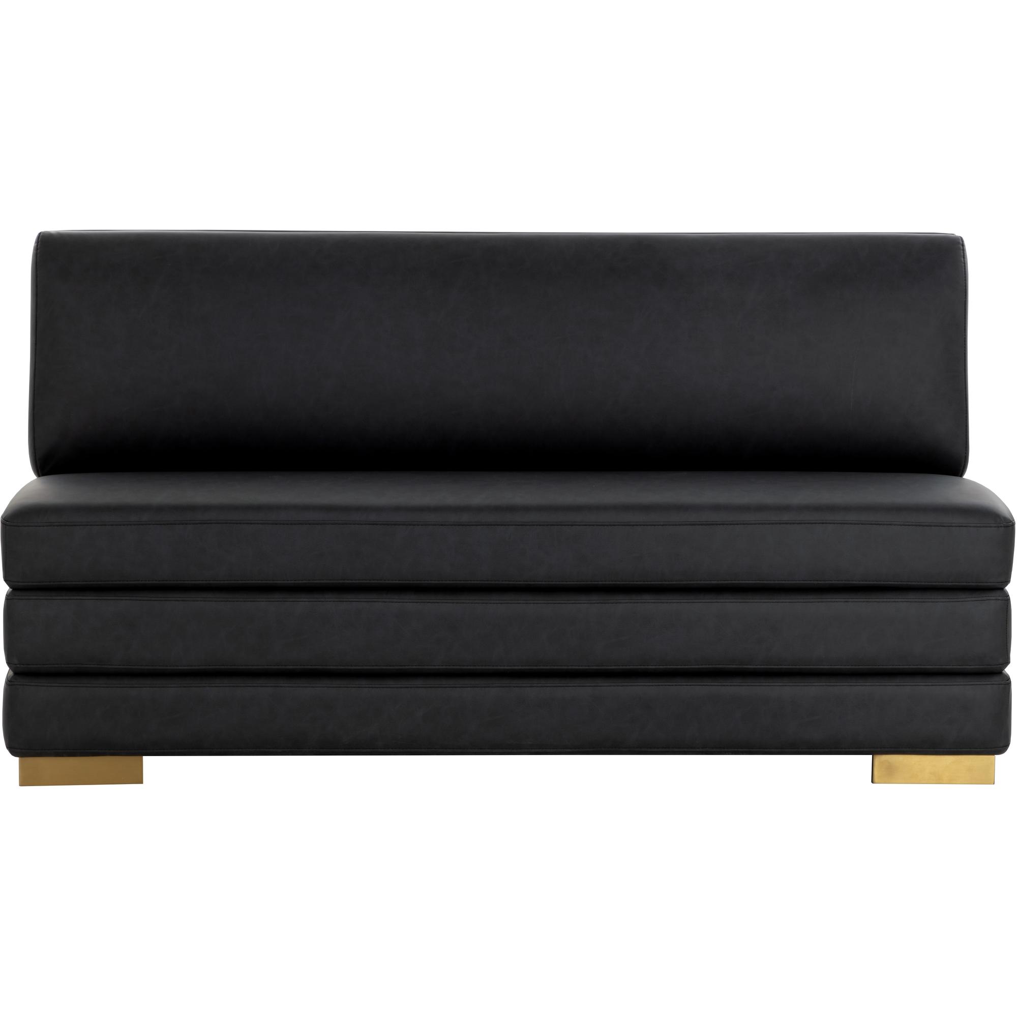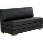 The streamlined design of the Radcliff Banquette enhances the elegance and comfort of your favourite nook. Upholstered in bravo black faux leather with gold stainless steel legs, it is a combination of durability and style. Handle With Care: This design has been crafted with faux leather. Faux leather is manufactured to reflect the natural characteristics of leather; as such, colour variations, markings, wrinkles, grooves, and light scratches are appreciated characteristics. No two pieces will be alike. Visit our Product Care page for more information on how to ensure the lasting beauty of this piece.