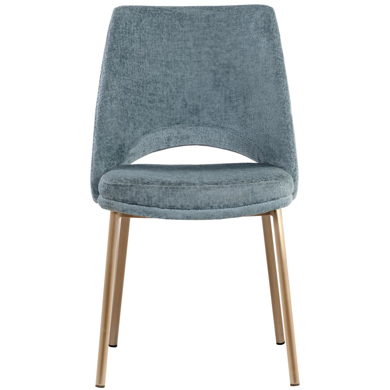Dashing with contemporary style, this dining chair is designed with a refined touch. Upholstered in bergen french blue fabric with a stylish cutout on the seatback. Completed with an antique brass stainless steel base.