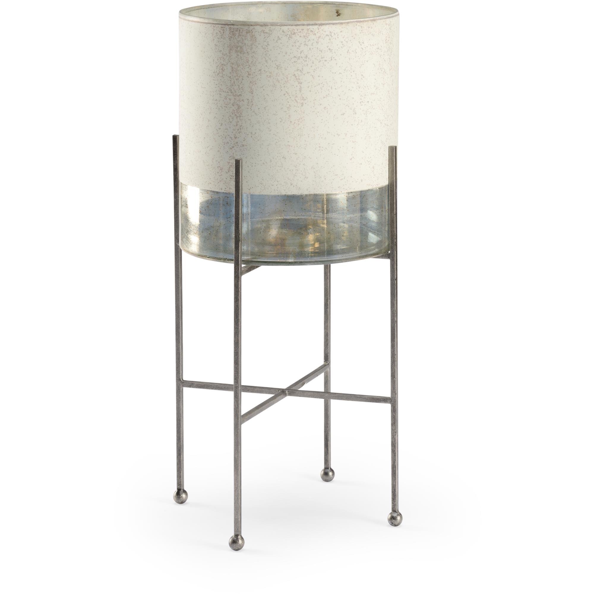 Large glass candleholder with rusticated white finish and silver banding. Antiqued iron support.