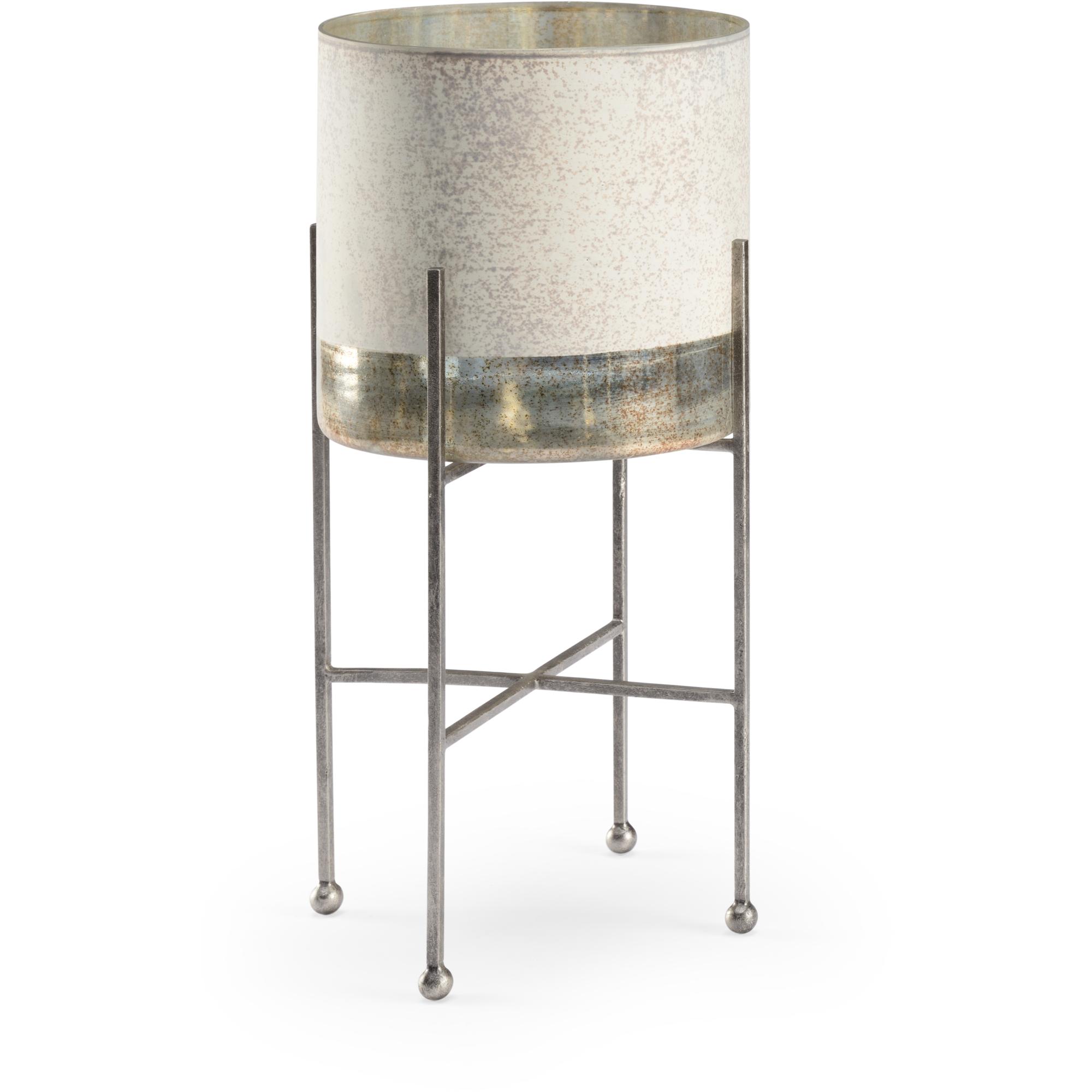Medium glass candleholder with rusticated white finish and silver banding. Antiqued iron support.