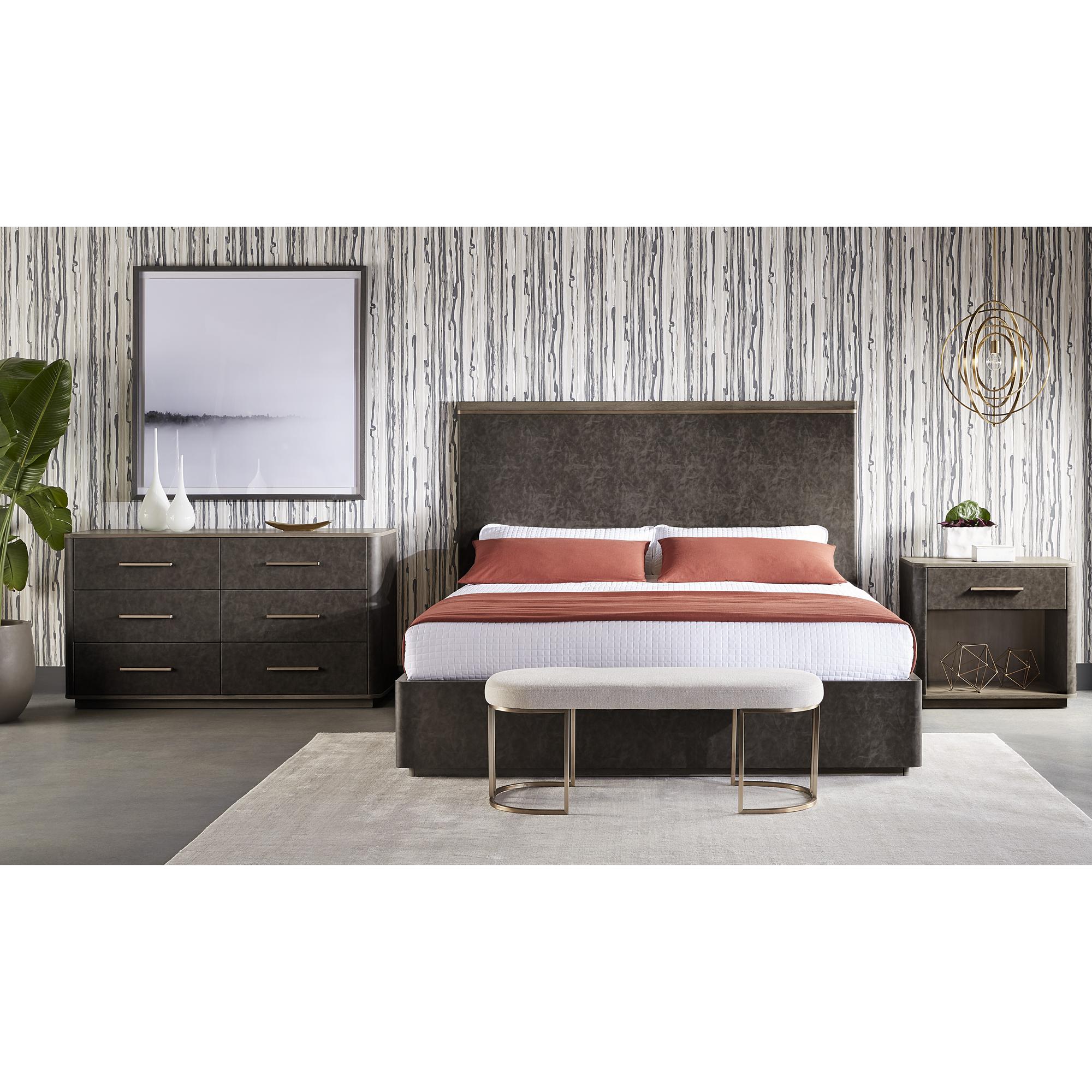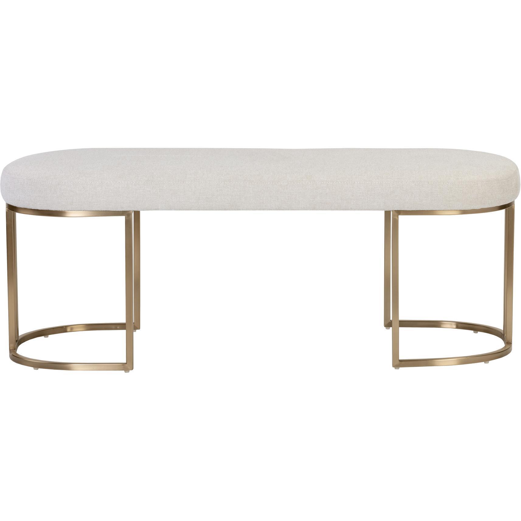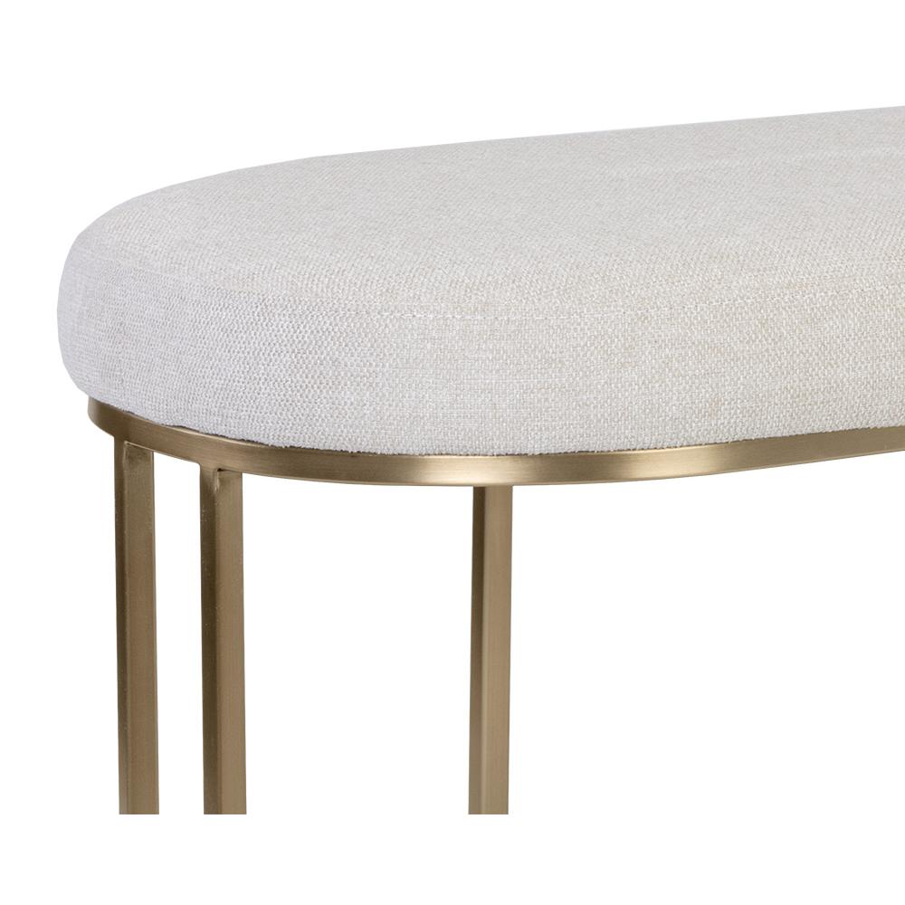An elegant bench designed with soft, textured belfast oatmeal fabric and an exposed antique brass stainless steel frame.