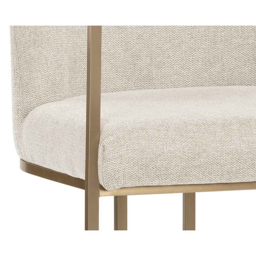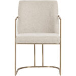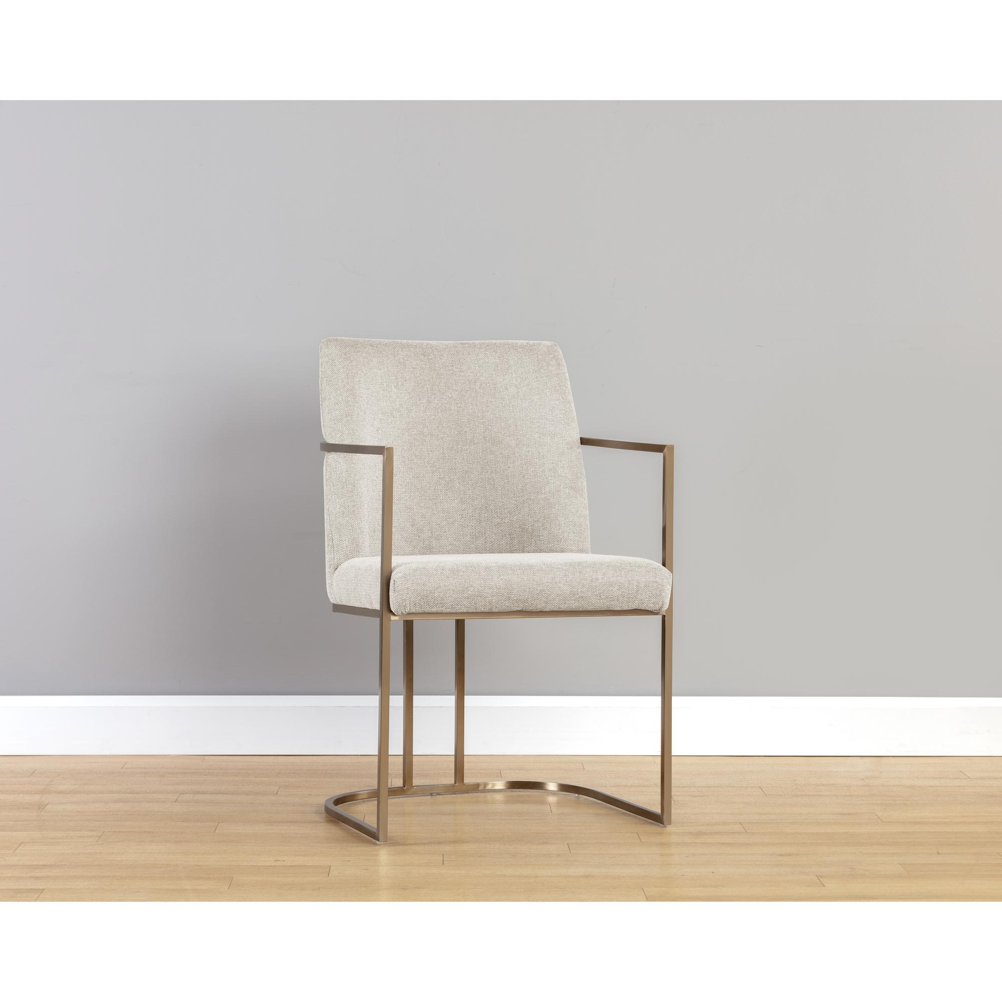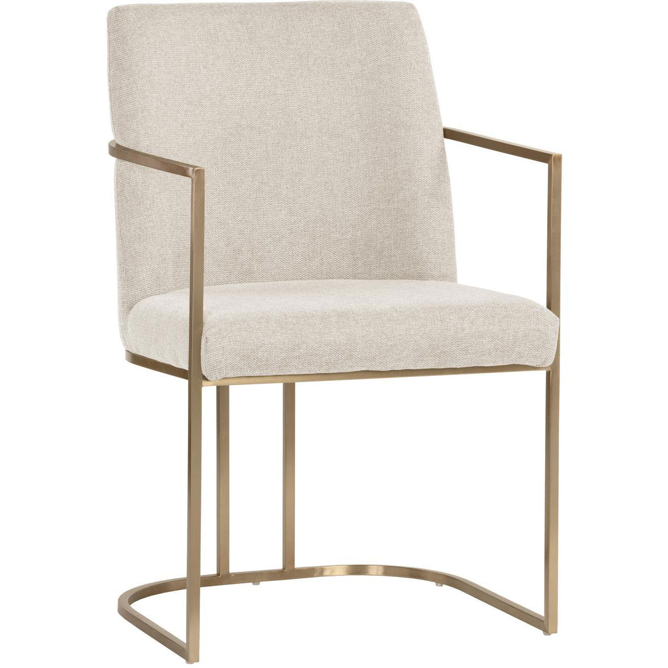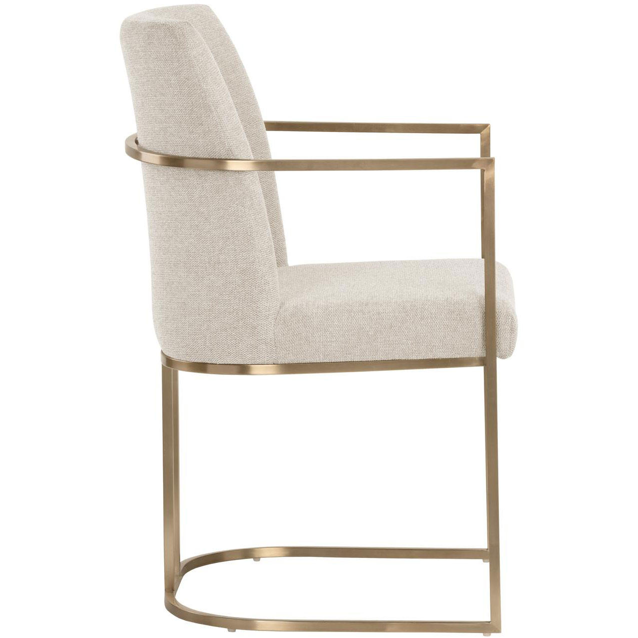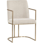 An elegant cantilever dining armchair designed with soft, textured belfast oatmeal fabric and an exposed antique brass stainless steel frame. Can be paired with coordinating dining chair and bench.