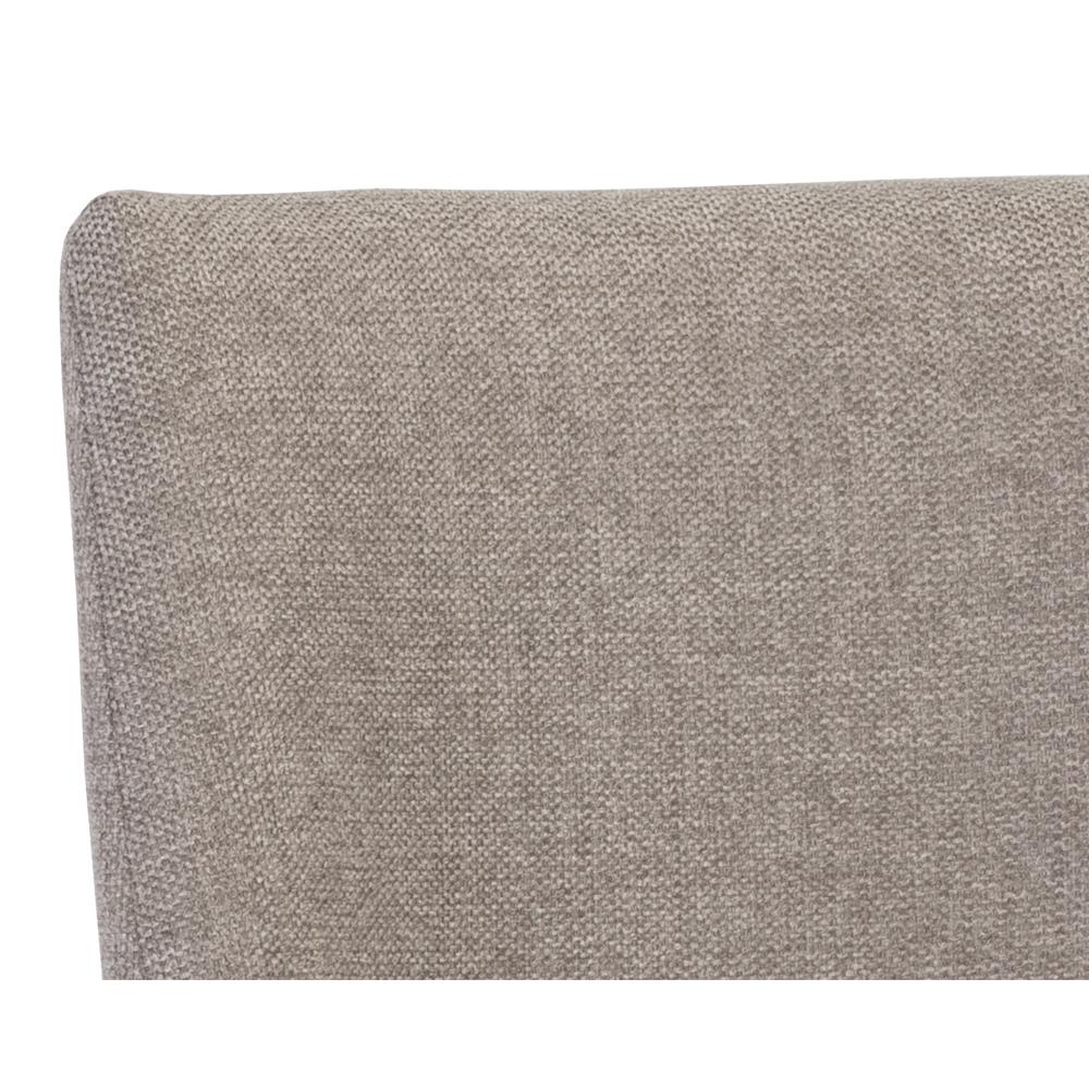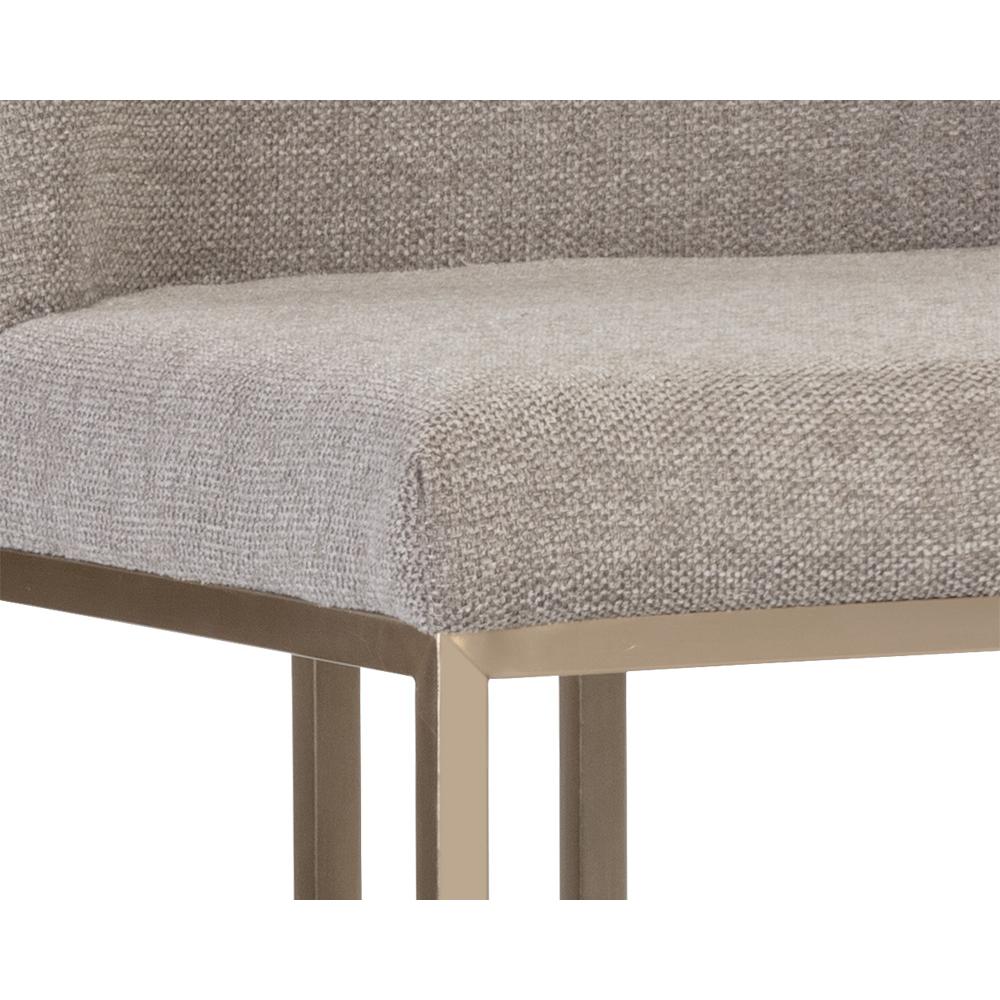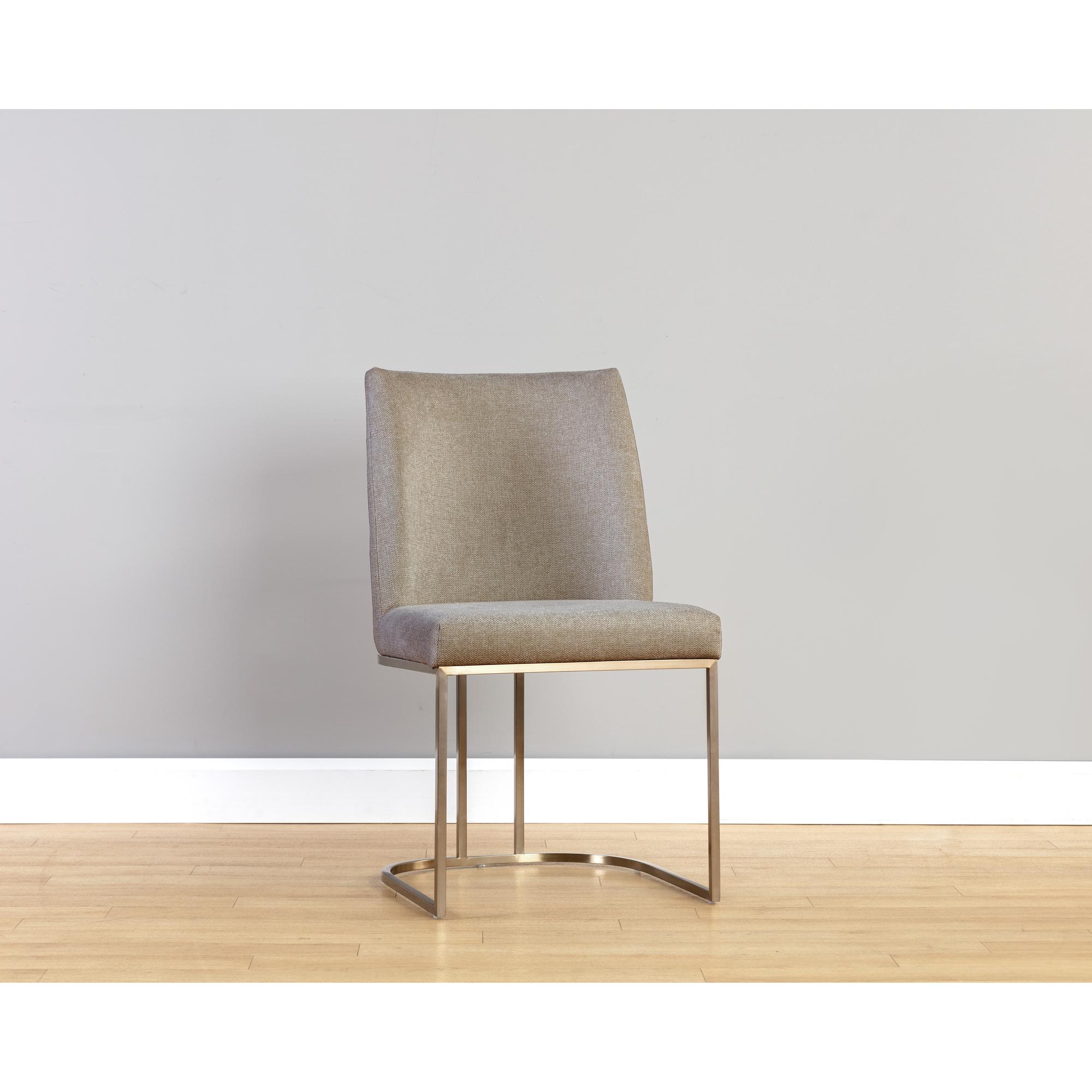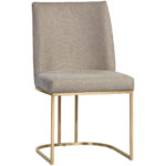 An elegant cantilever dining chair designed with soft, textured belfast oyster shell fabric and an exposed antique brass stainless steel frame. Can be paired with coordinating dining armchair and bench.