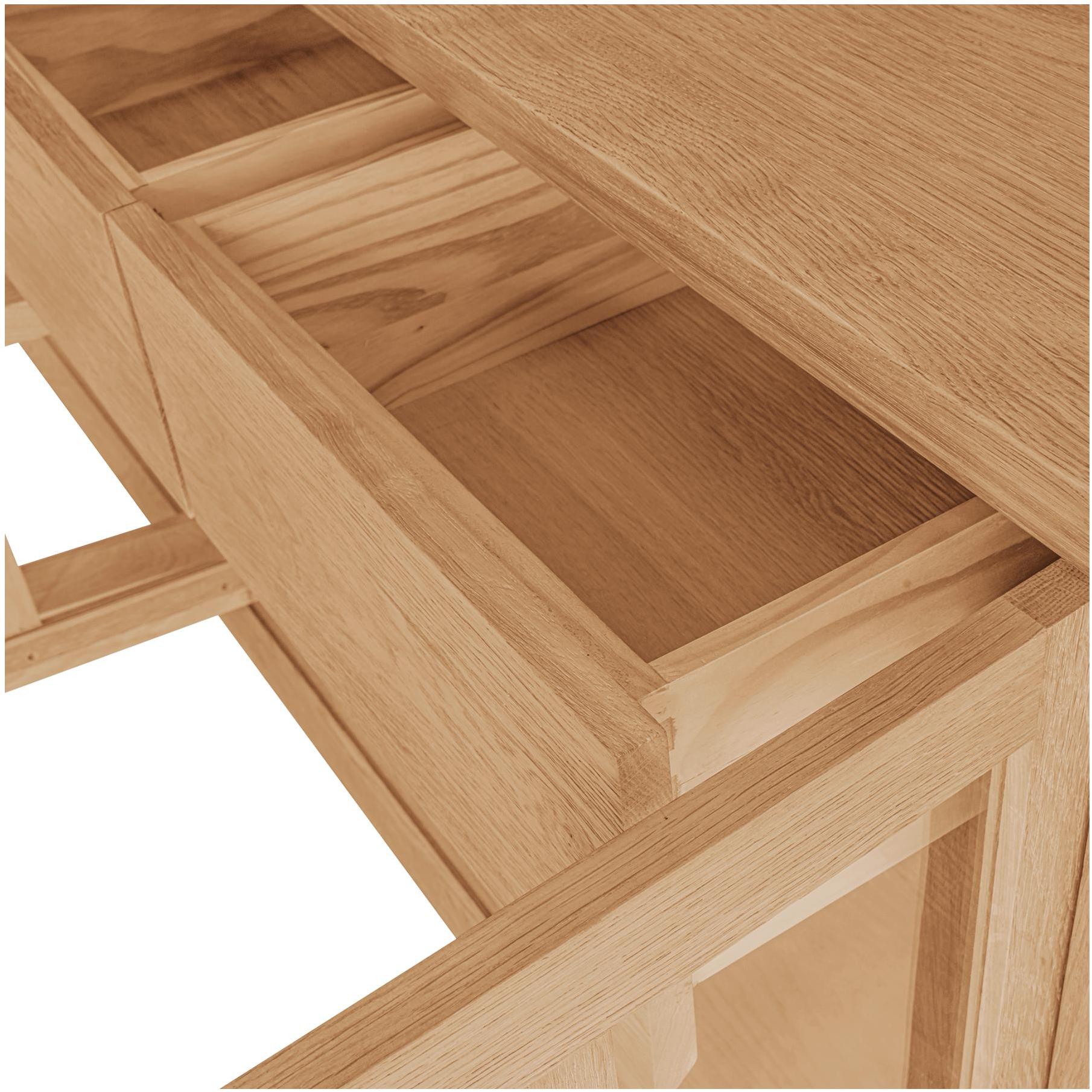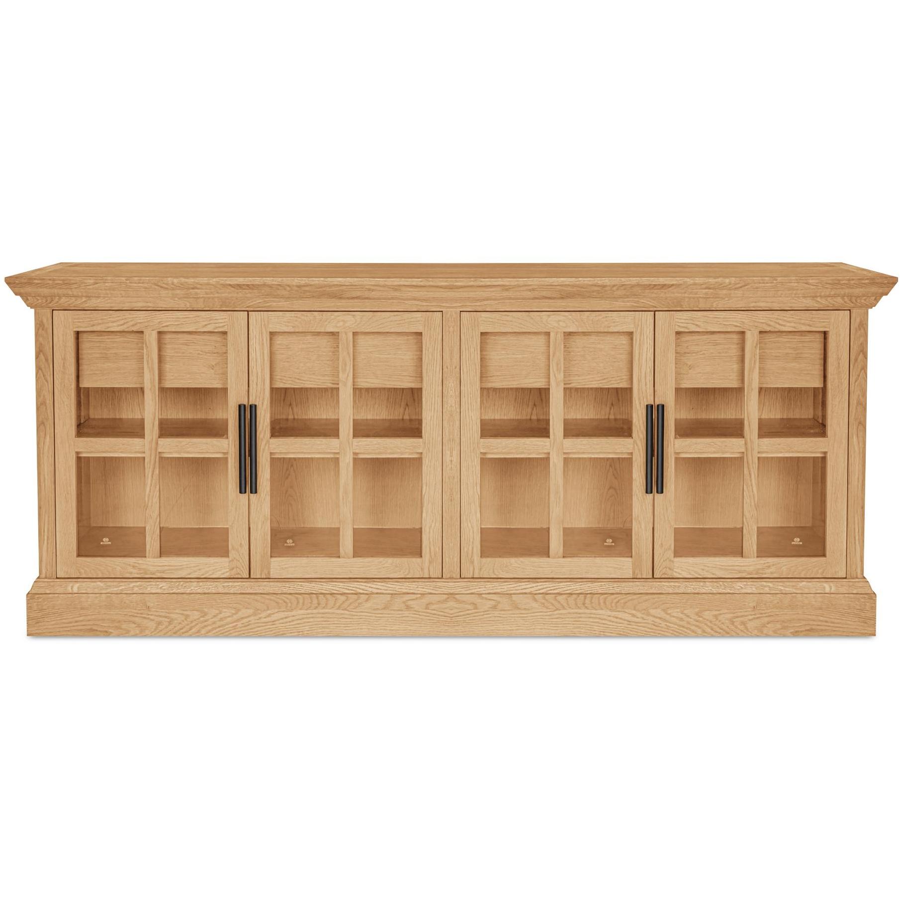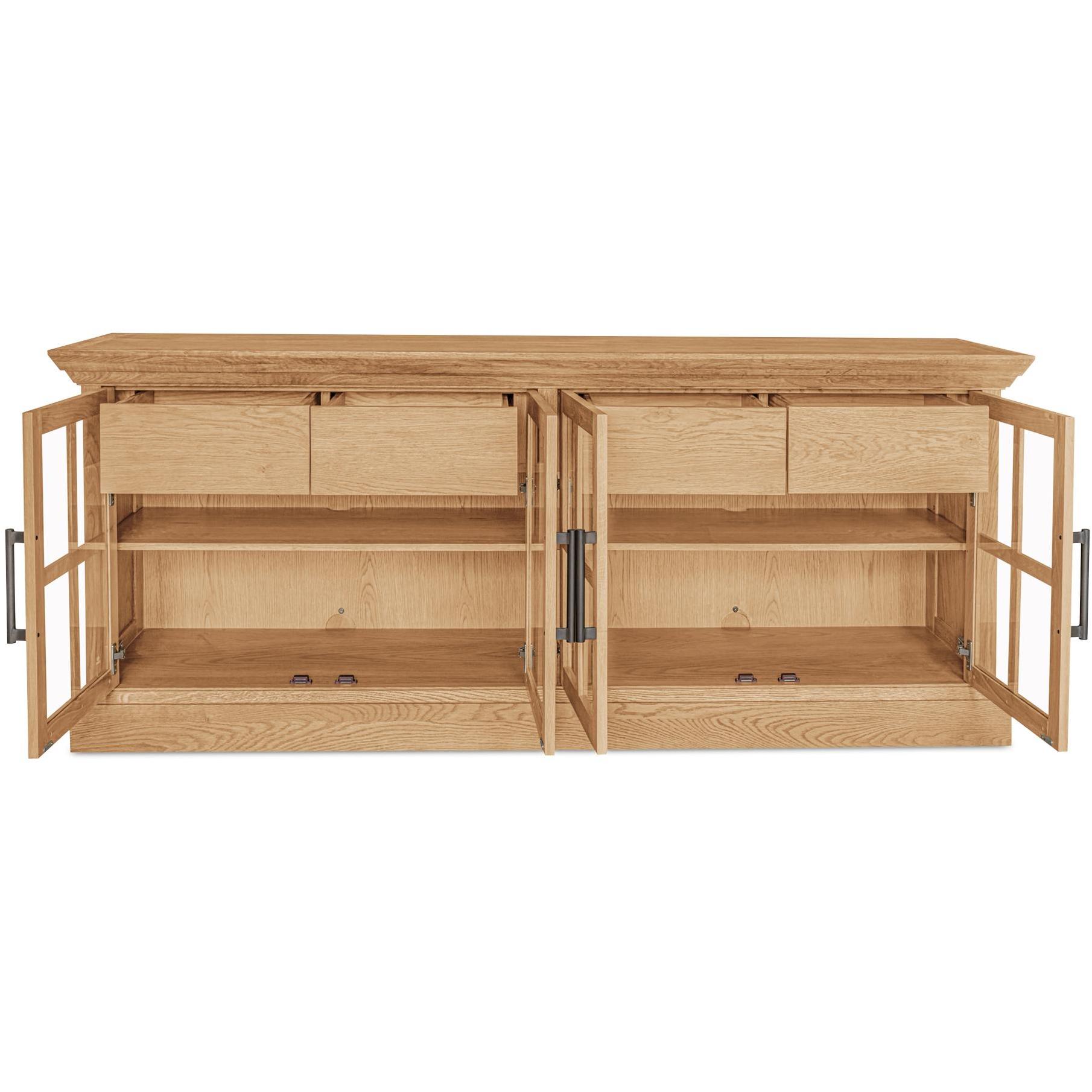 Meticulously crafted from solid oak and oak veneer, the Raymond sideboard’s wire-brushed natural finish exudes warmth and texture. The glass front, adorned with traditional molding and a graceful overhang, adds elegance with a contemporary twist. Four drawers and discreet cable management provide practical storage solutions.