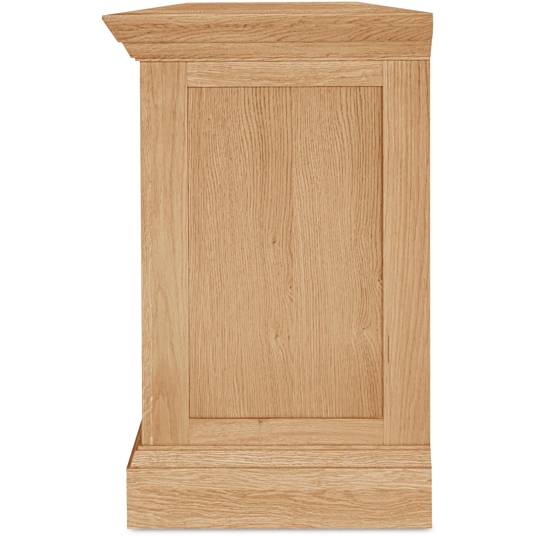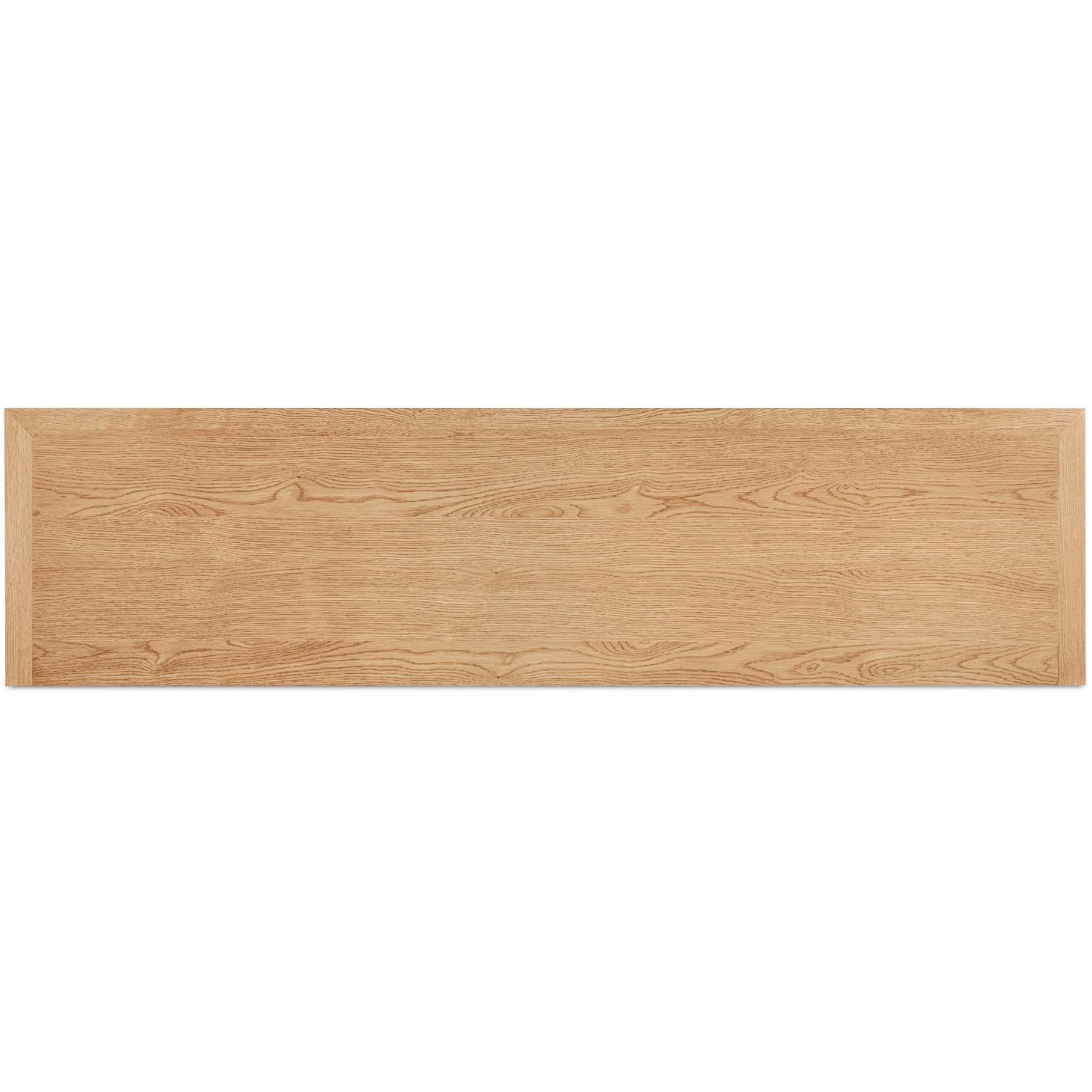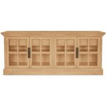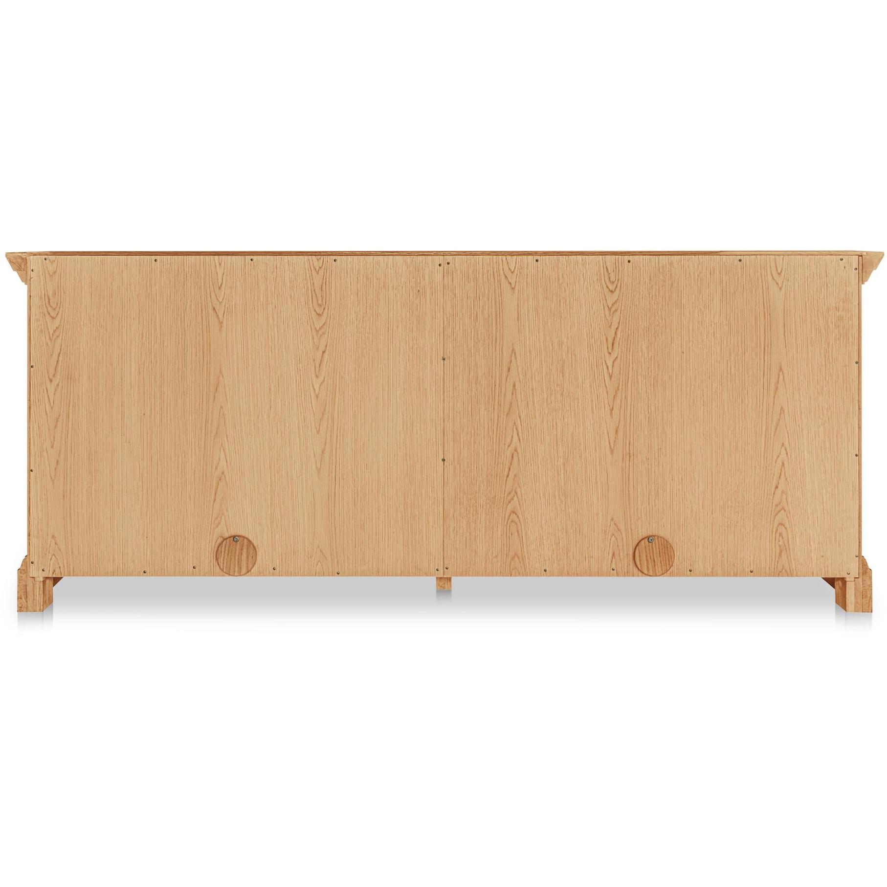 Meticulously crafted from solid oak and oak veneer, the Raymond sideboard’s wire-brushed natural finish exudes warmth and texture. The glass front, adorned with traditional molding and a graceful overhang, adds elegance with a contemporary twist. Four drawers and discreet cable management provide practical storage solutions.