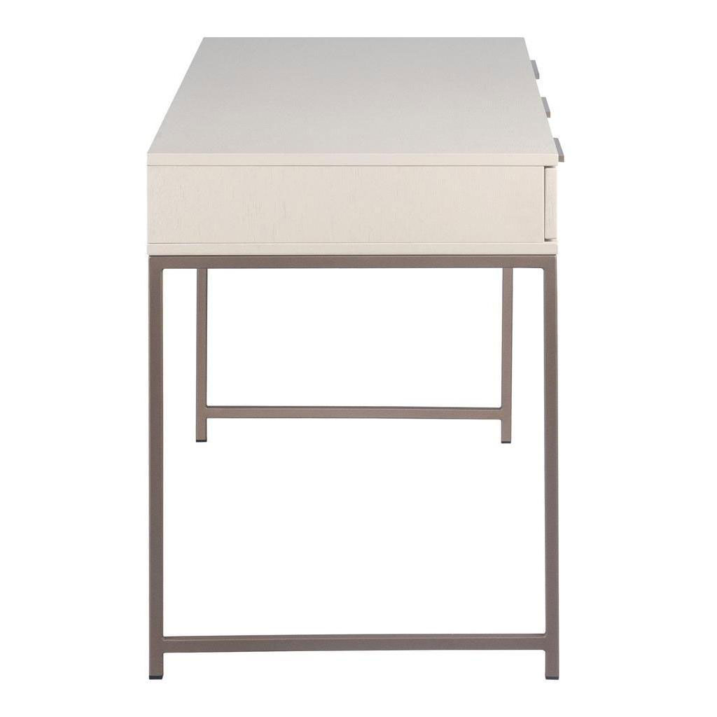 A modern desk designed to add a beautiful touch to office spaces. Crafted from cream oak wood veneer with three soft closing drawers for ample storage. Brushed champagne gold iron hardware completes the look. Also available in a taupe oak veneer with a black iron frame or raw umber wood veneer with a gold frame. As wood is an organic, porous material, these pieces will contain natural variation of texture and may also exhibit fine indentations and cracks. Wood pieces will also display a disparity of colour and grain, and visible knots and burls that add to the character of each piece.