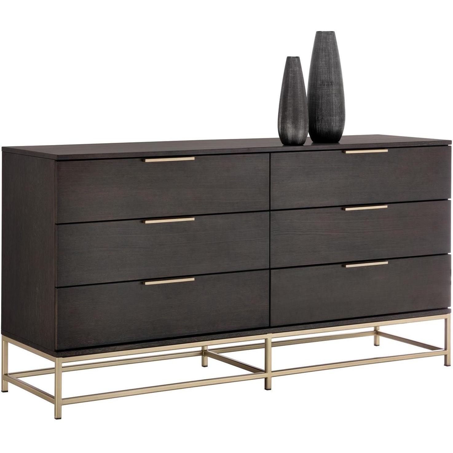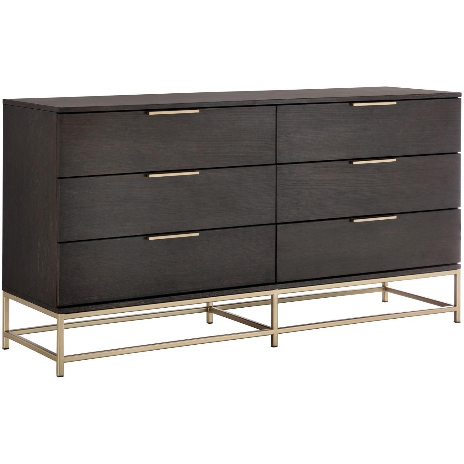 A modern dresser designed to add a beautiful touch to the bedroom. Crafted from charcoal grey oak veneer with six soft closing drawers for ample storage. Brushed gold iron hardware completes the look.
