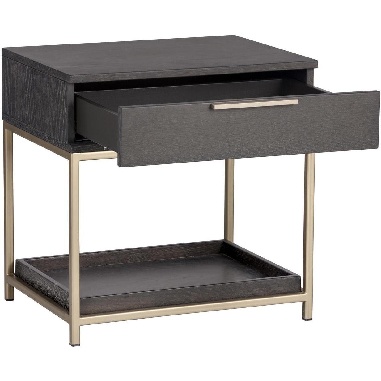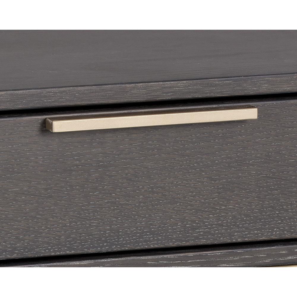 A modern nightstand designed to add a beautiful touch to the bedroom. Crafted from charcoal grey oak veneer with a soft closing drawer and shelf for added storage. Brushed gold iron hardware completes the look. As wood is an organic, porous material, these pieces will contain natural variation of texture and may also exhibit fine indentations and cracks. Wood pieces will also display a disparity of colour and grain, and visible knots and burls that add to the character of each piece.