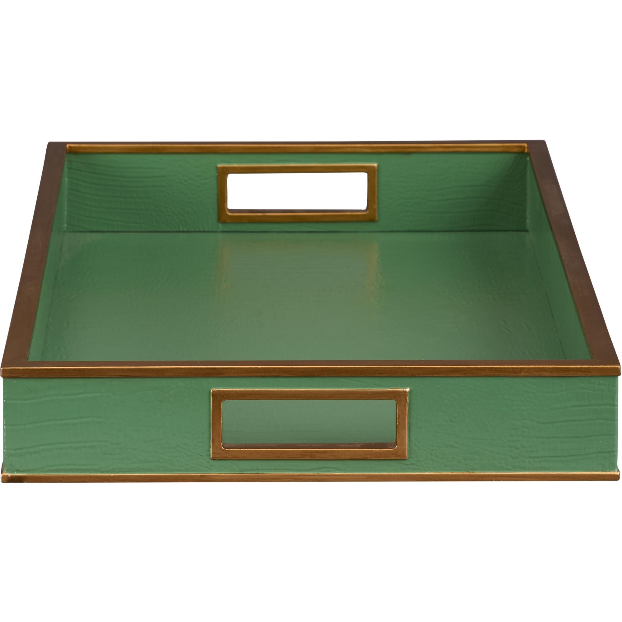This chic tray features a green faux crocodile finish accented with gold edging, blending bold texture with refined elegance for a sophisticated statement piece. Designed by Shayla Copas.