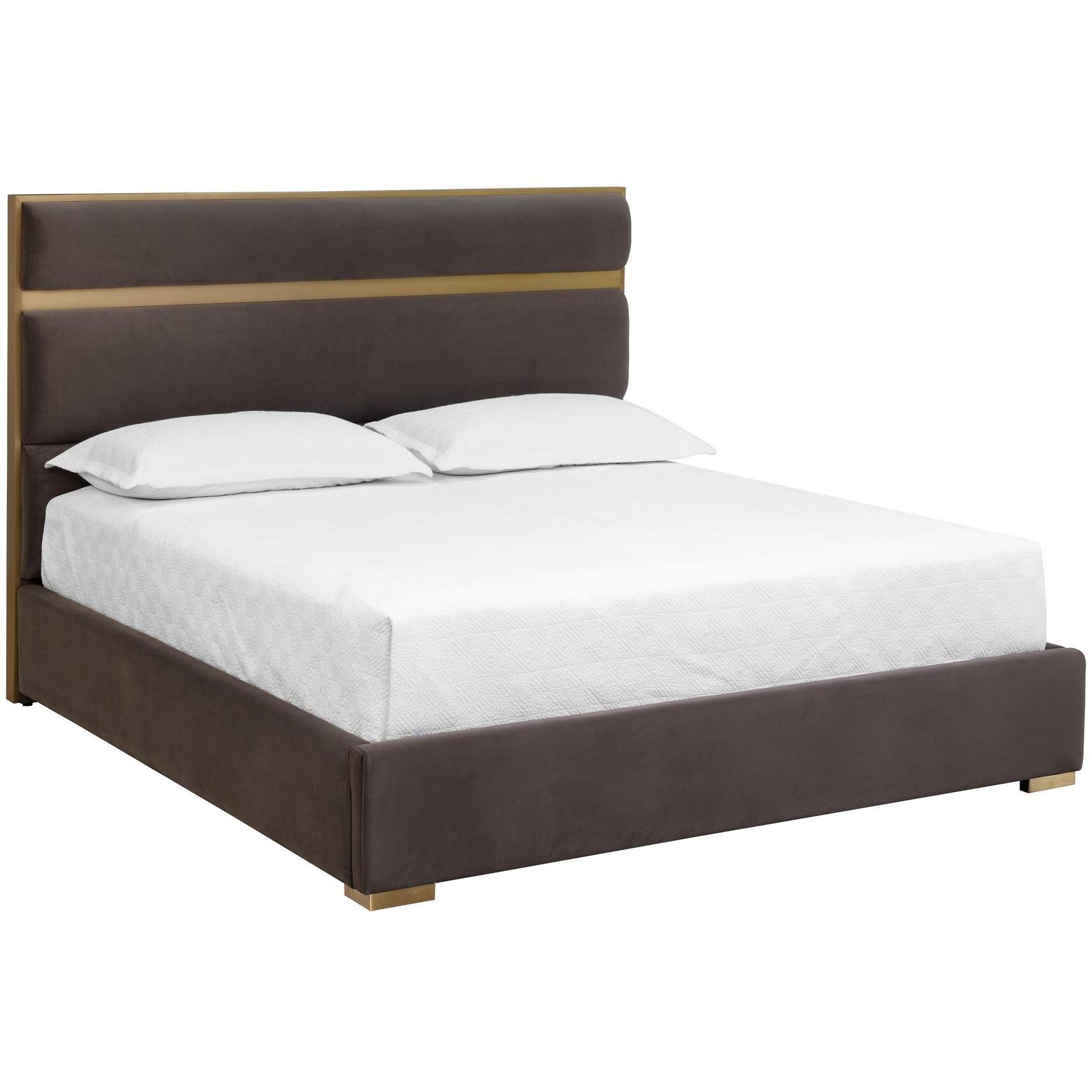 The clean lines of our Reign Bed bring an elegant silhouette to any bedroom. The gold stainless steel headboard is beautifully complemented with the moody tones of our meg ash fabric. No box spring is required and folding slats are included.