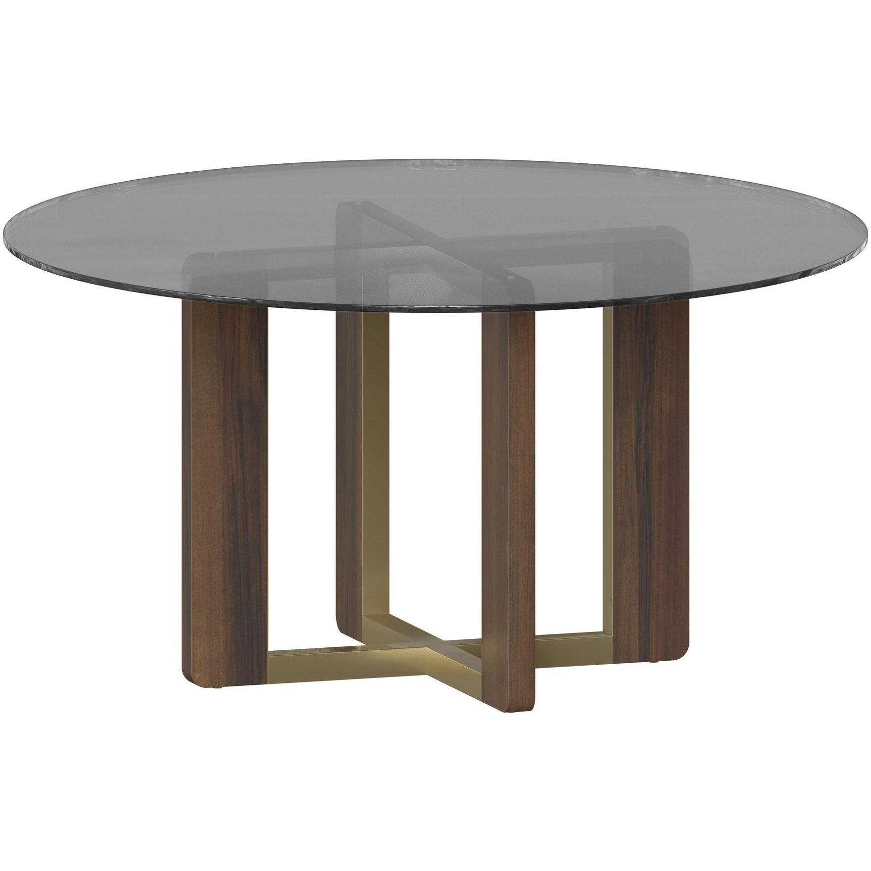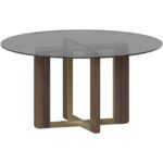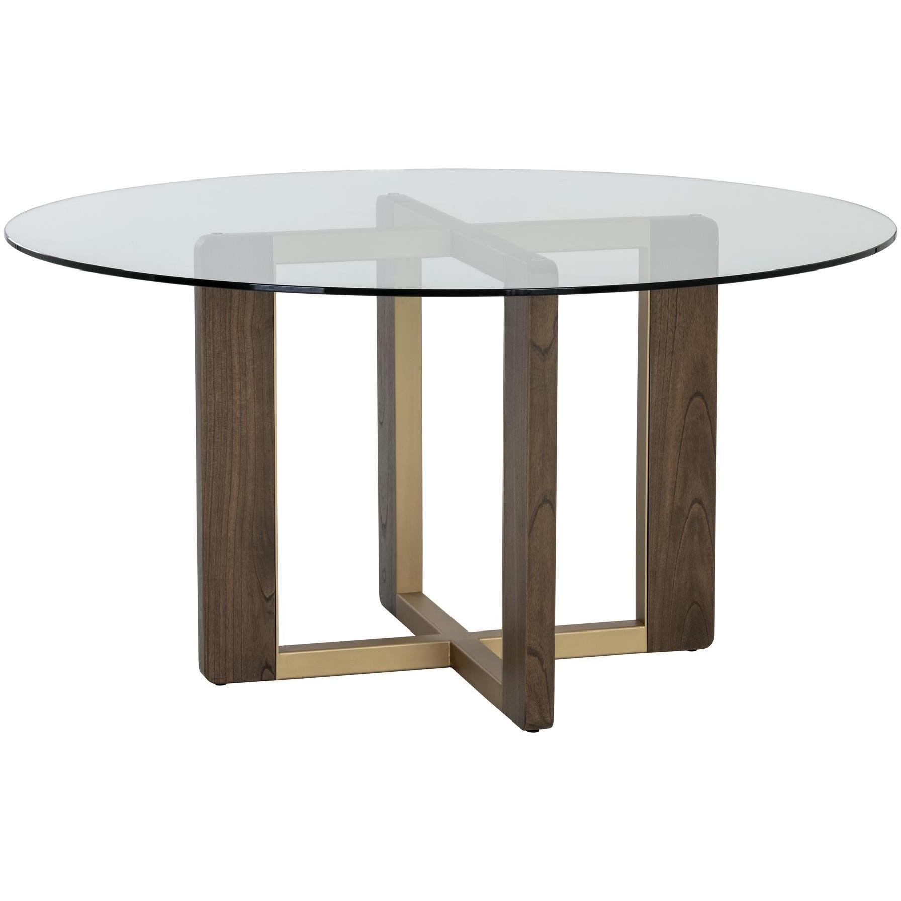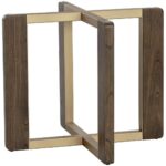 A beautiful dining table base that features contrasting brown solid mindi wood paired with a gold iron finish. Intended for use with a 59″ round glass dining table top, or use two bases with a 96″ glass top for a rectangular table combination. Table tops sold separately. Designed for use with glass table tops only. As wood is an organic, porous material, these pieces will contain natural variation of texture and may also exhibit fine indentations and cracks. Wood pieces will also display a disparity of colour and grain, and visible knots and burls that add to the character of each piece.