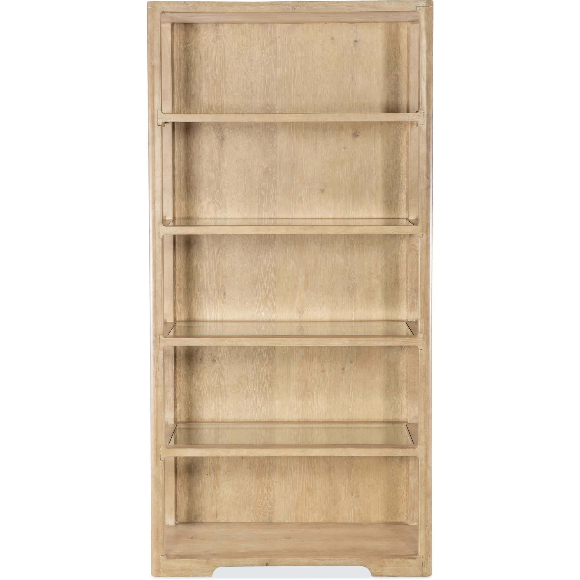 - Features: Four fixed wood-framed tempered glass shelves