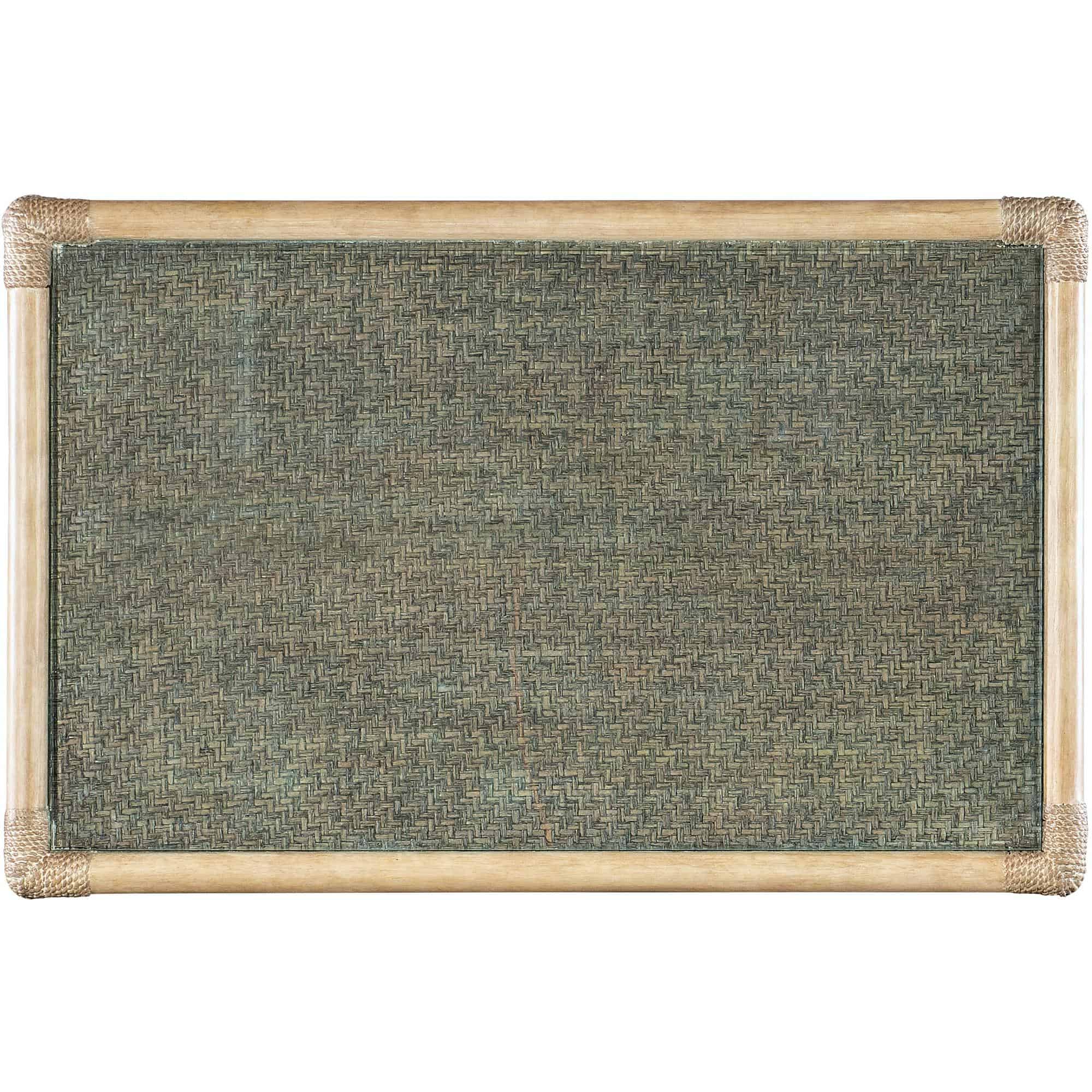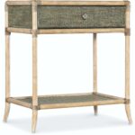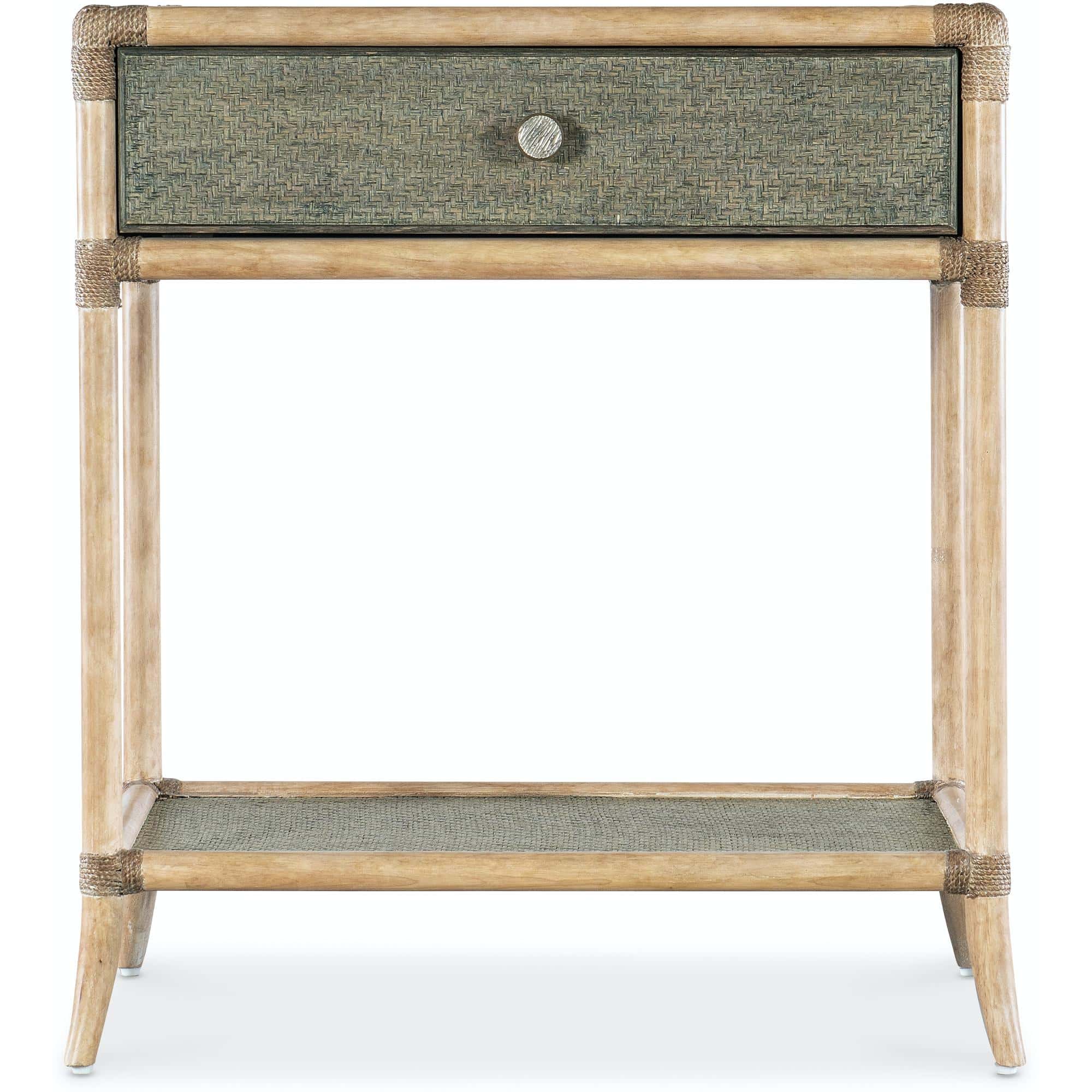 Features: One self-closing drawer One fixed shelf Levelers Painted raffia shelf and top Glass top insert