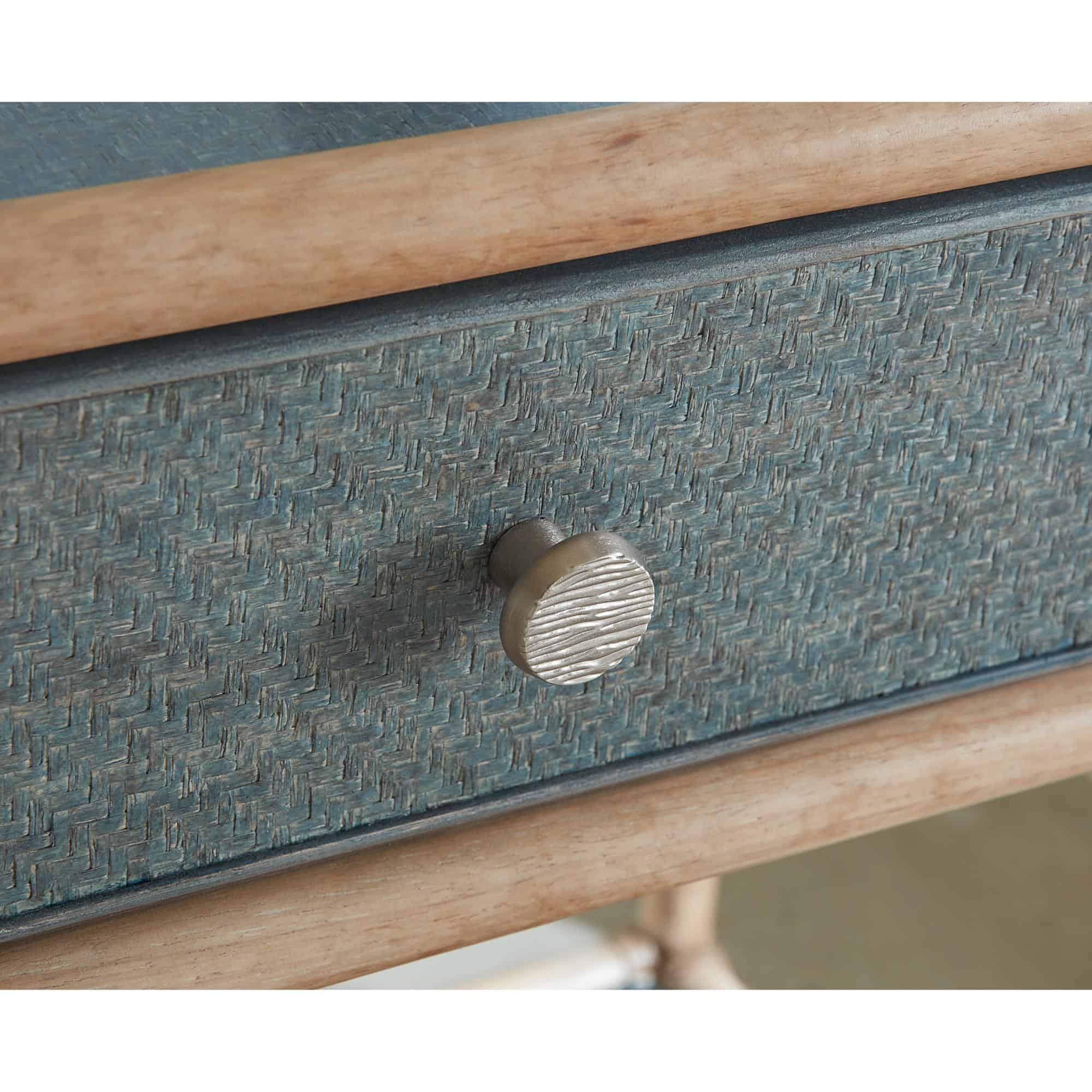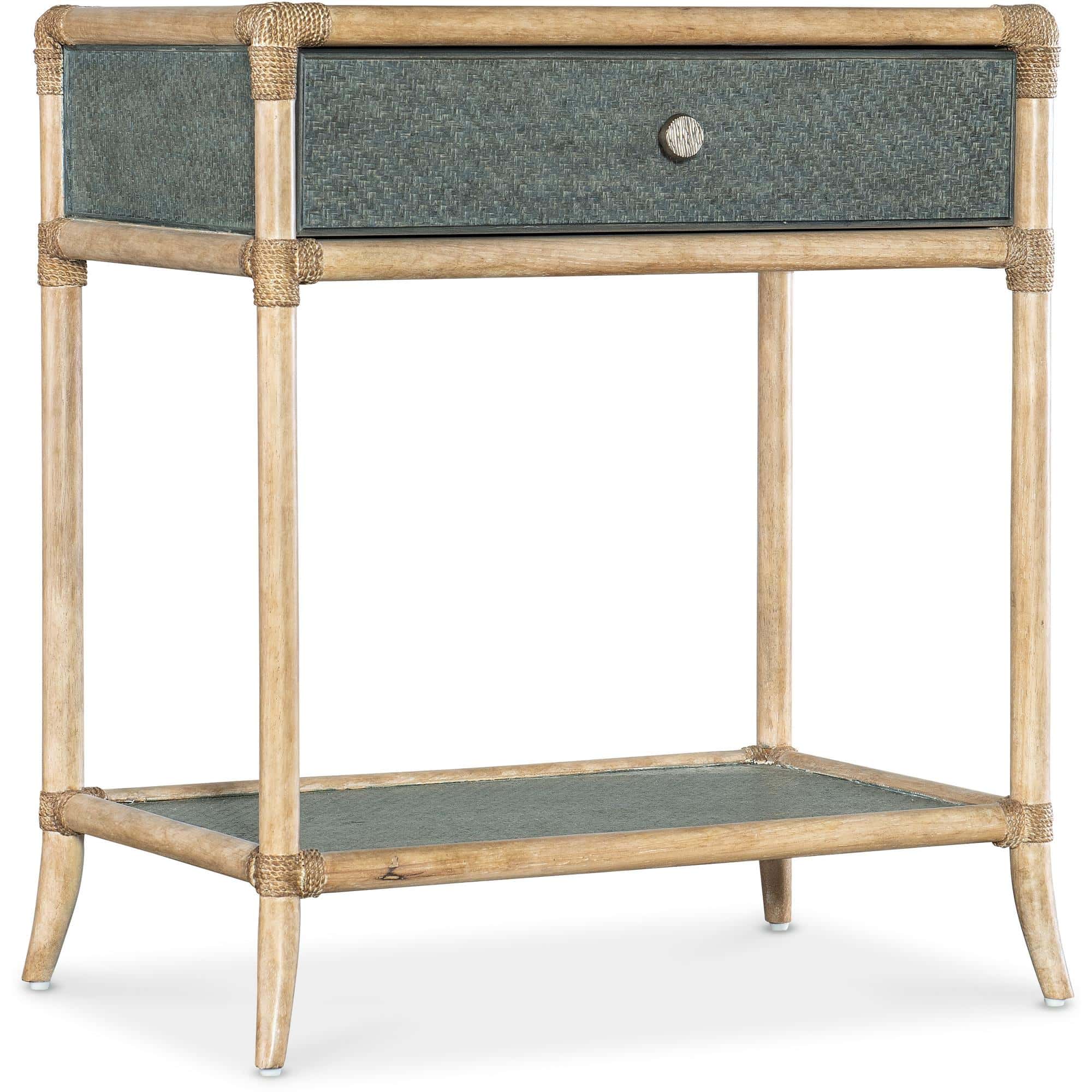 Features: One self-closing drawer One fixed shelf Levelers Painted raffia shelf and top Glass top insert
