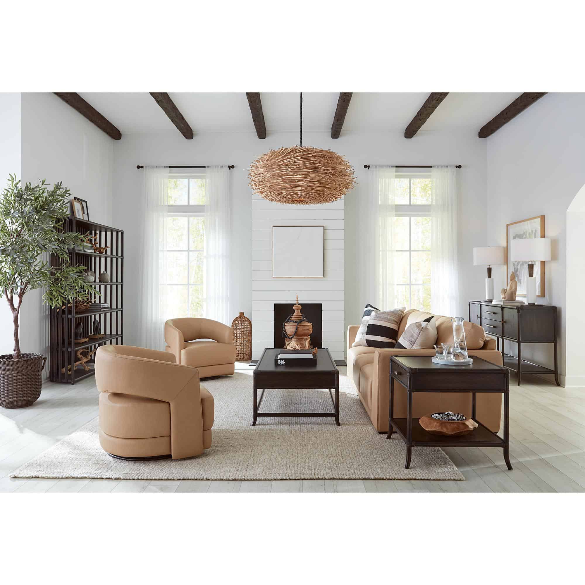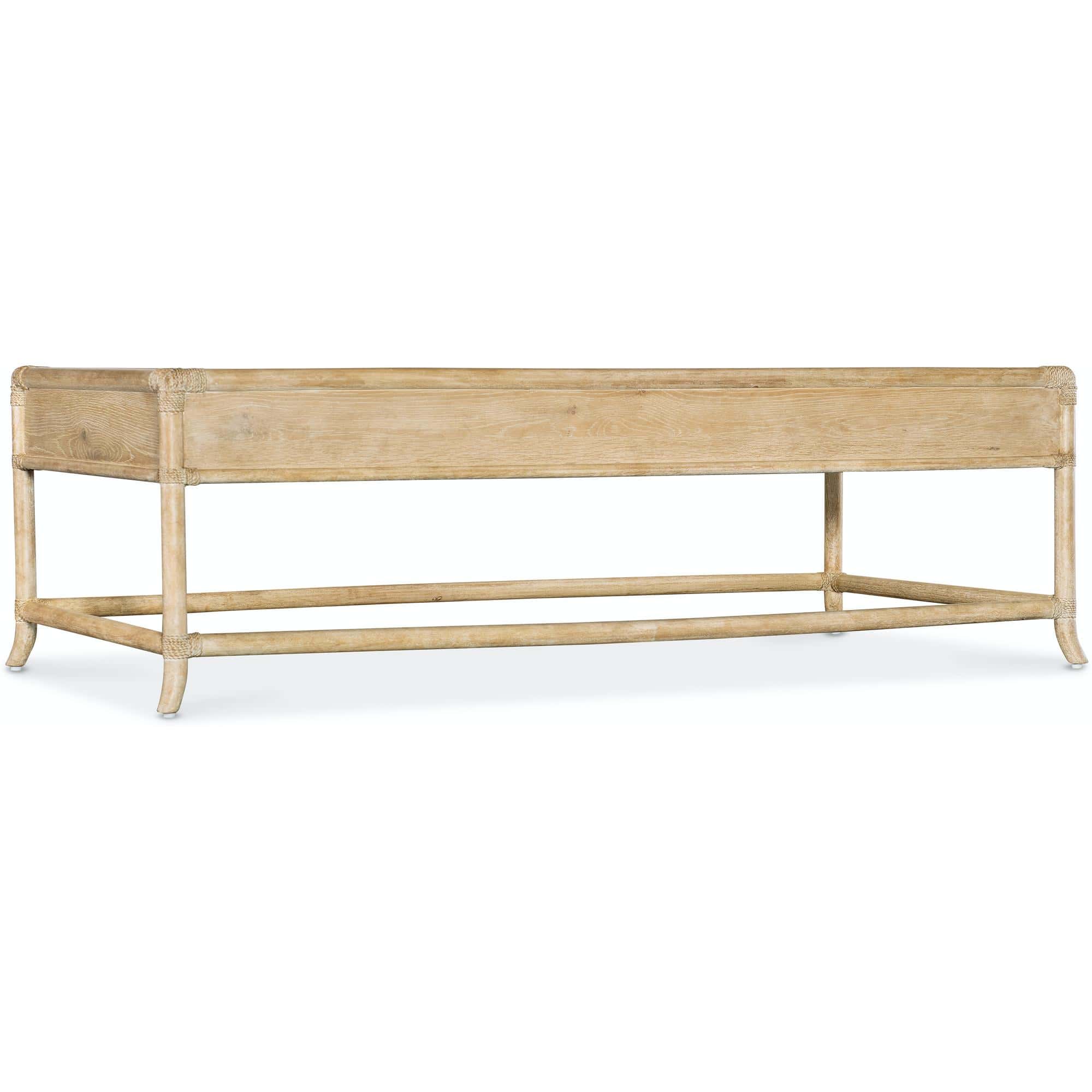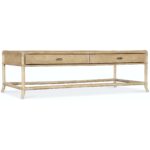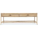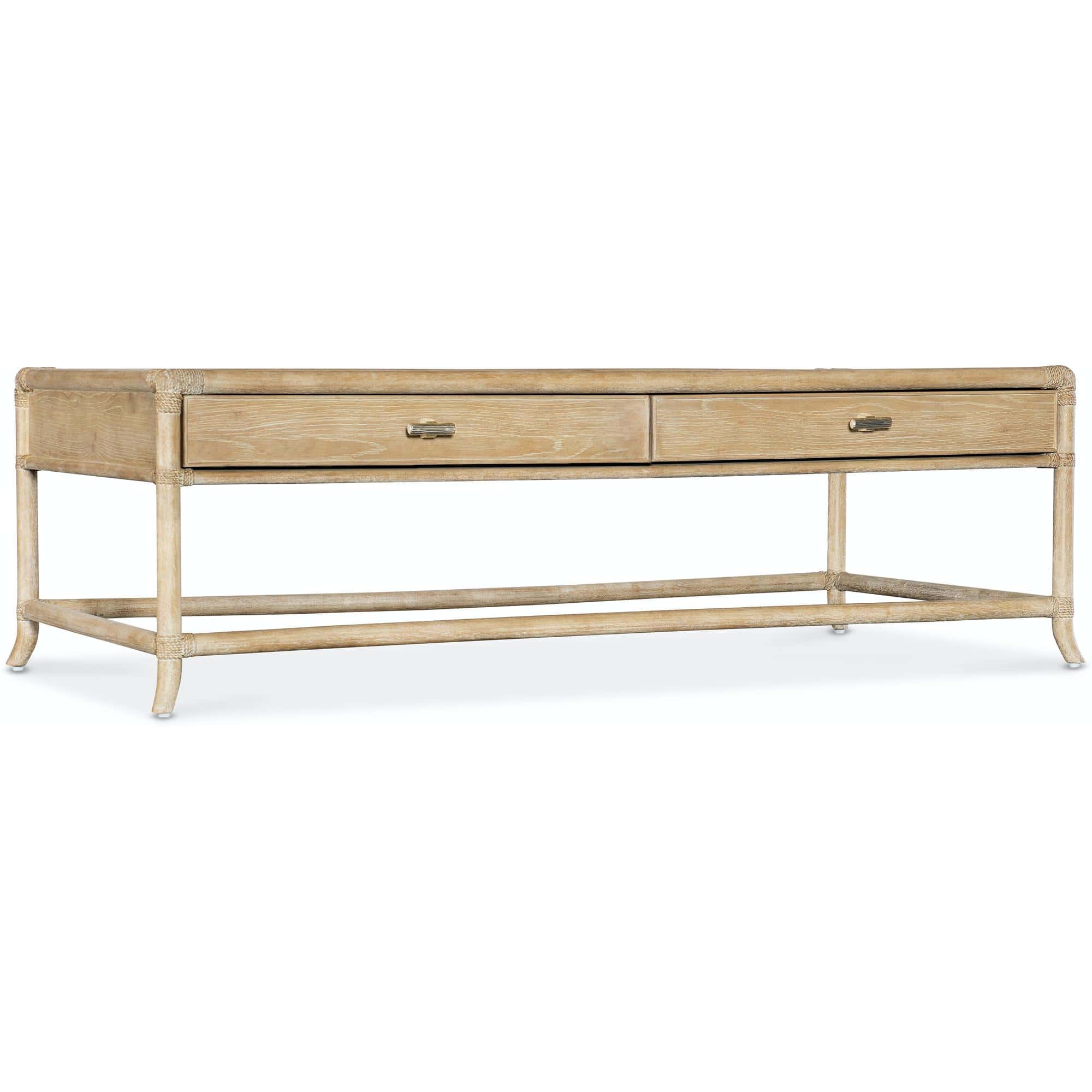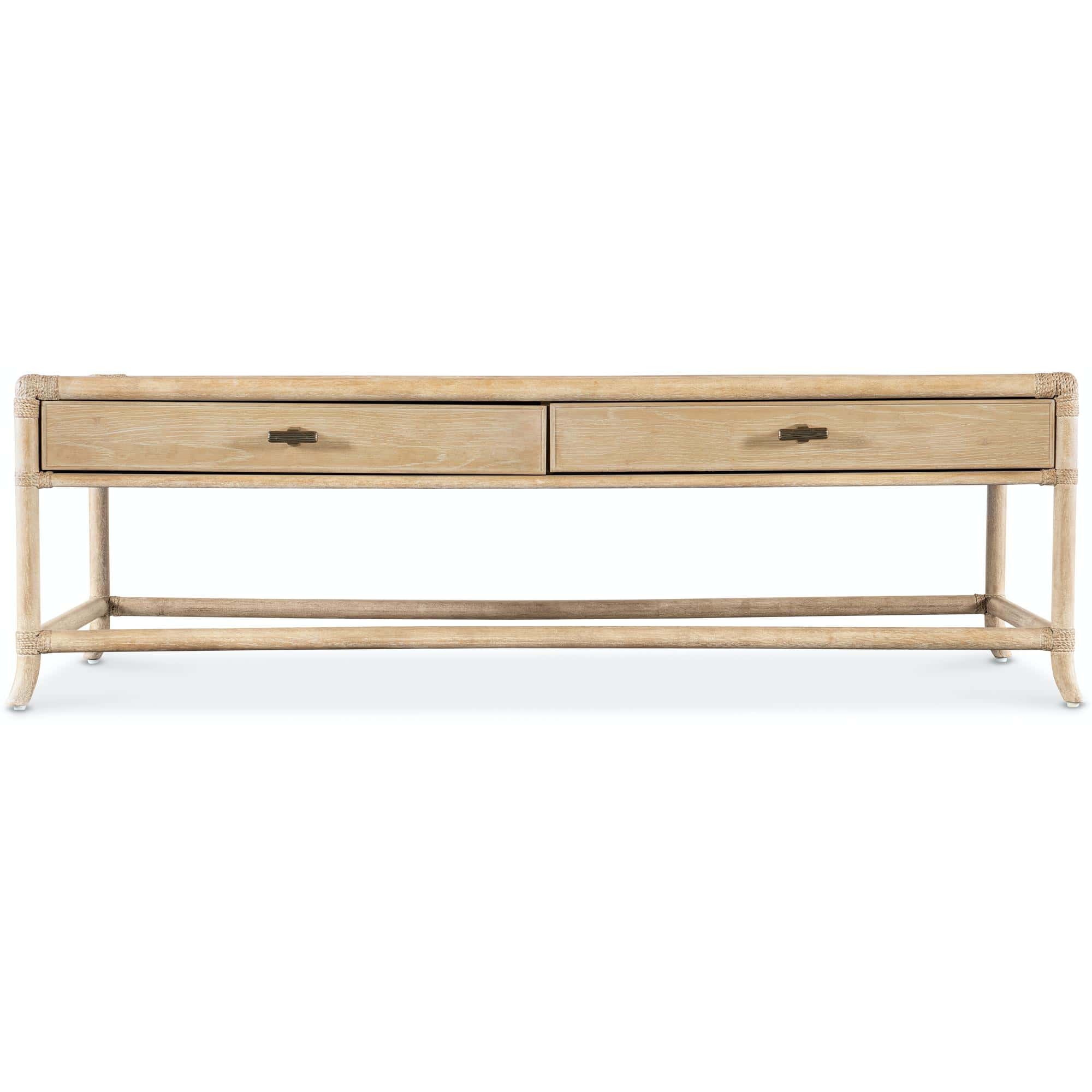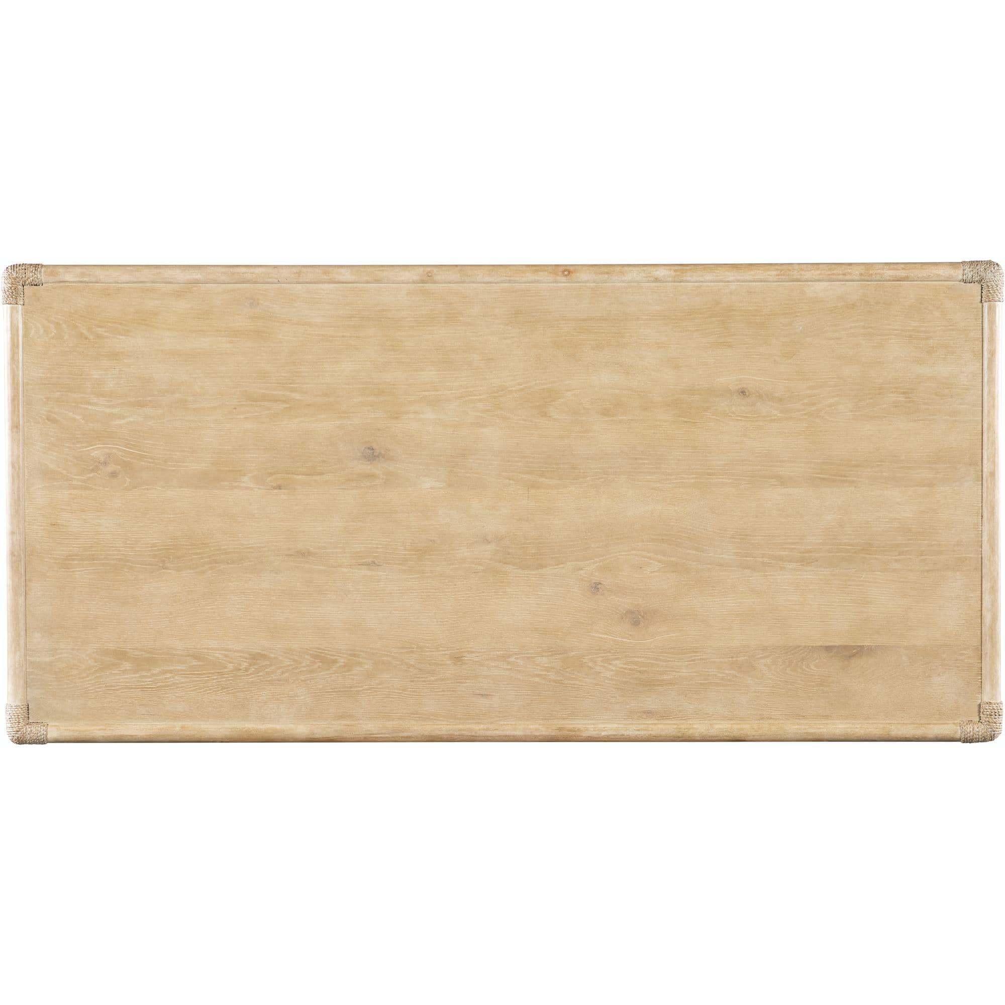 Features: Rectangle shape Two self-closing drawers Levelers Finished on all sides Rope accents
