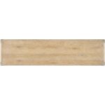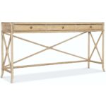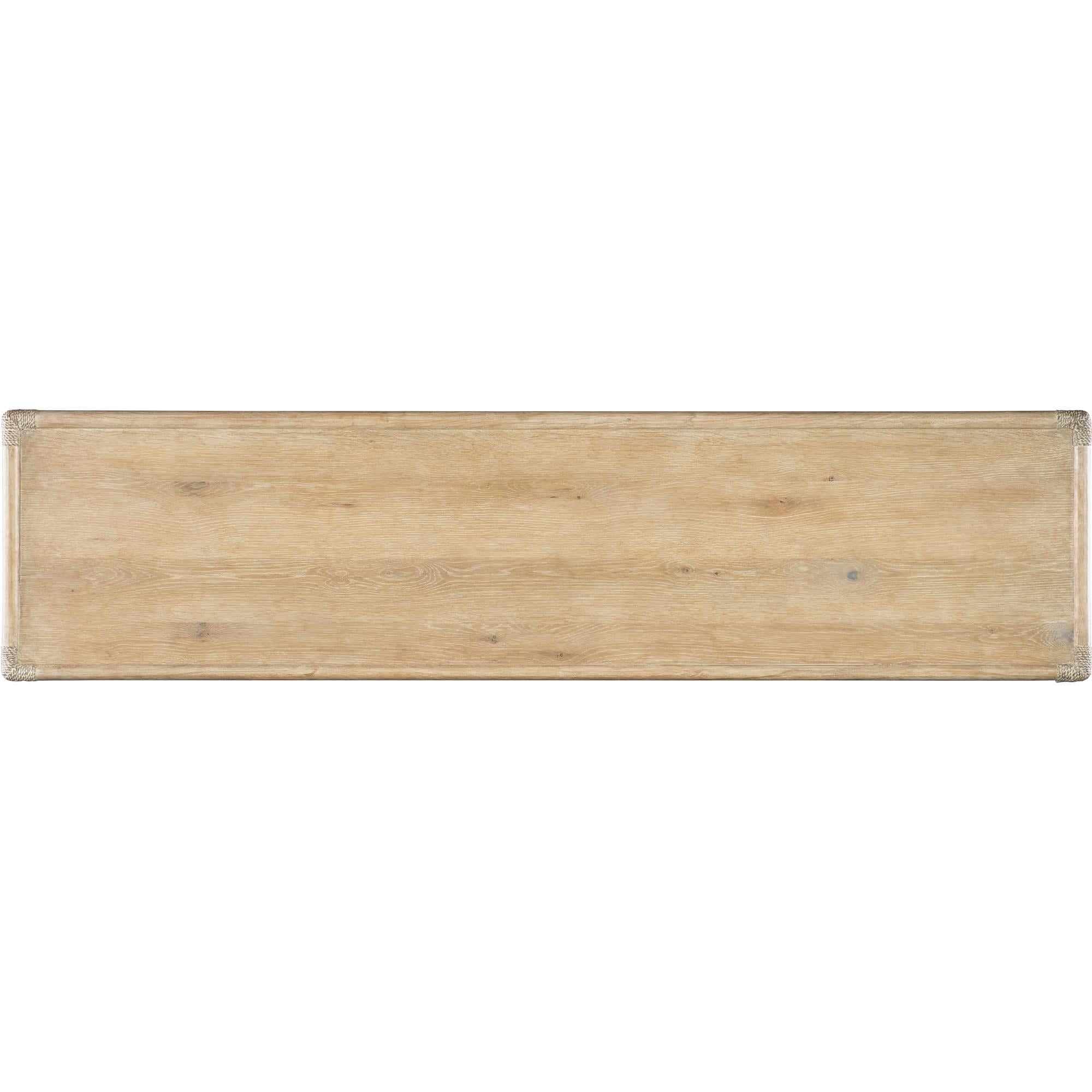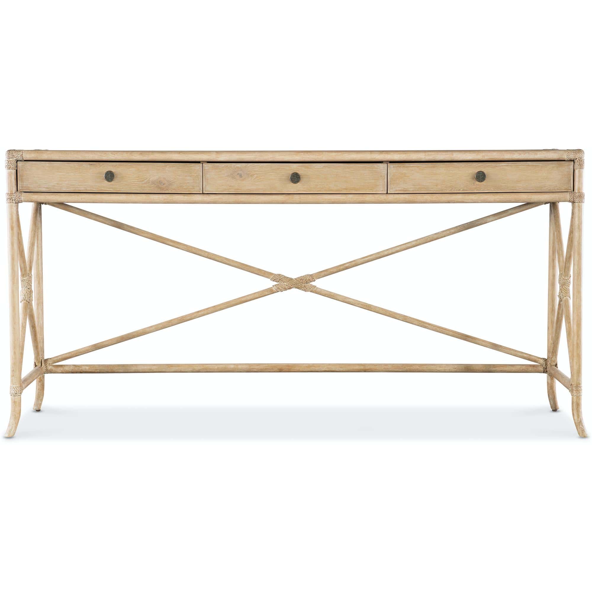 Features: Three self-closing drawers Levelers X-design on back and sides Rope accents and bamboo motif Finished on back