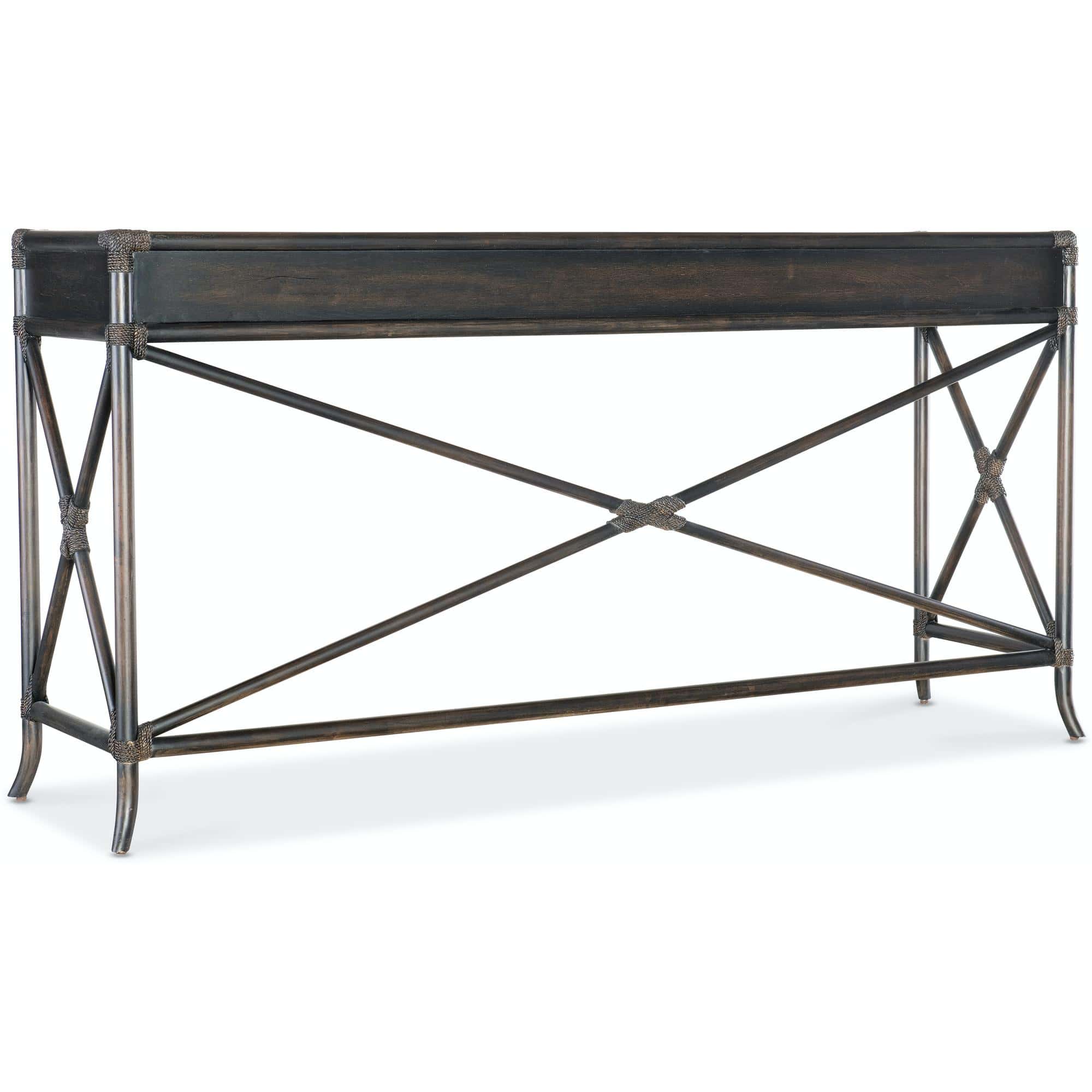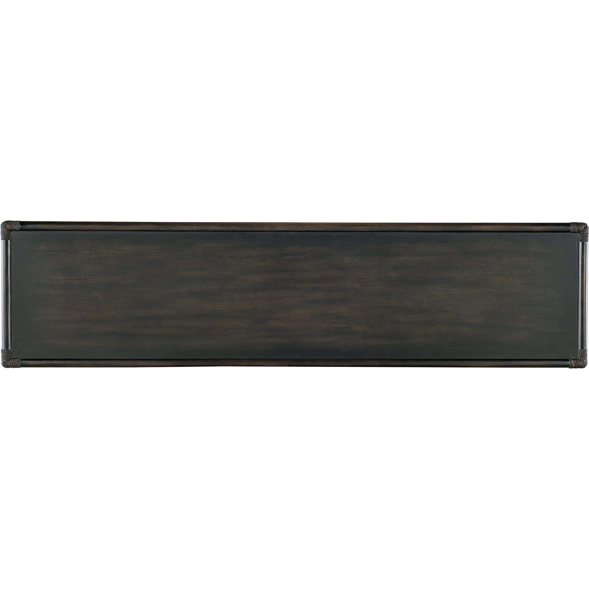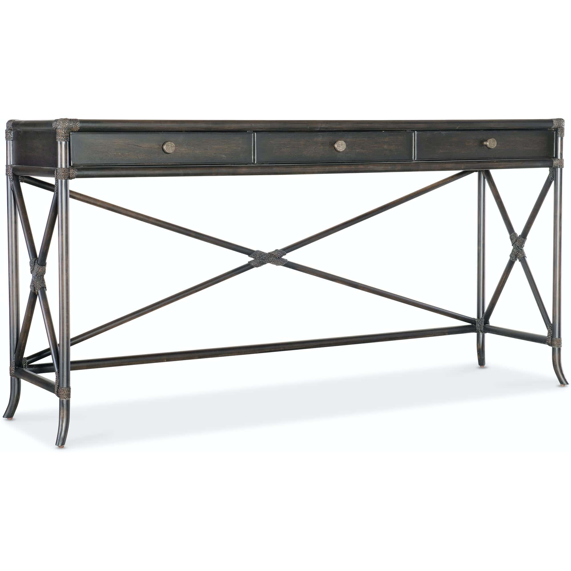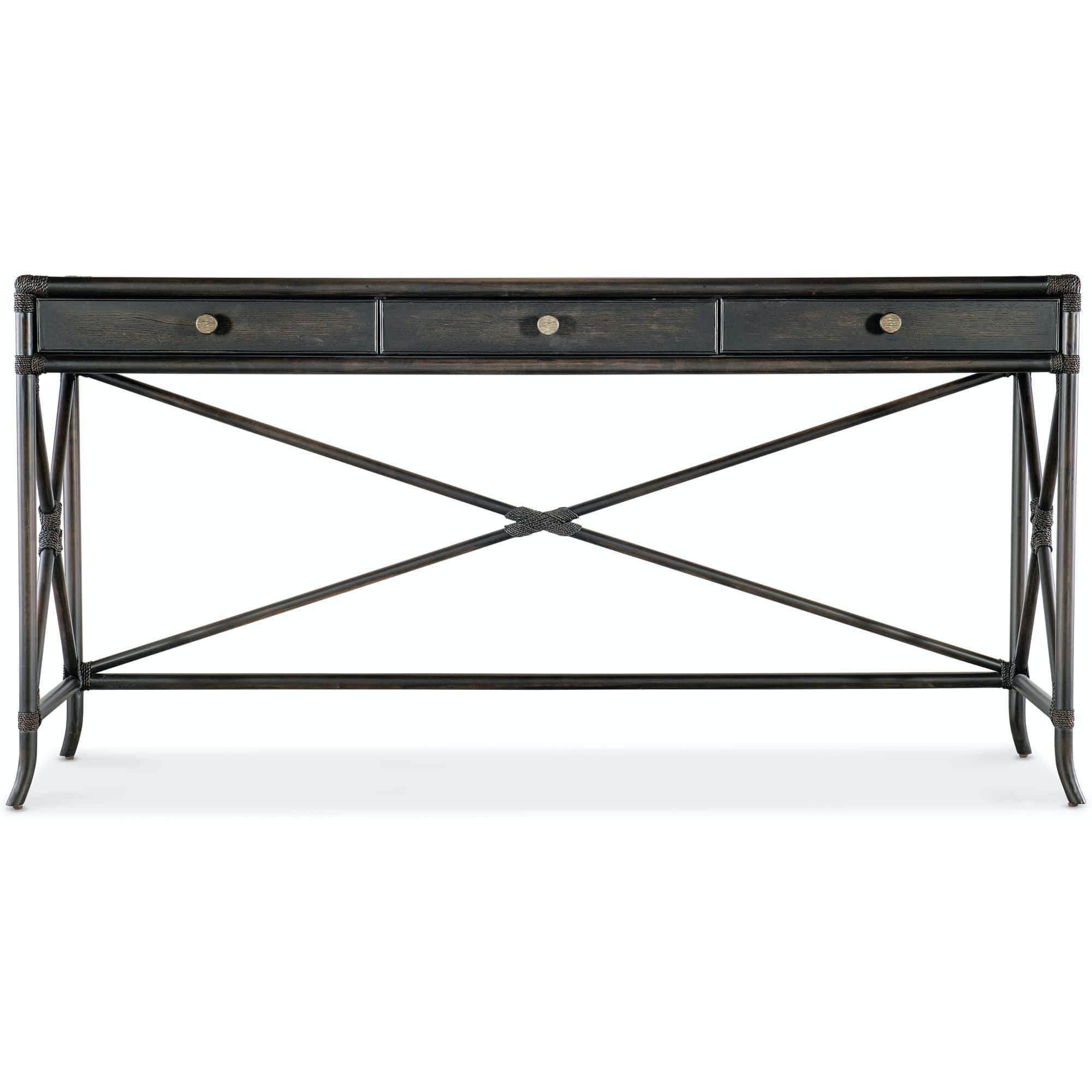 Features: Three self-closing drawers Levelers X-design on back and sides Rope accents and bamboo motif Finished on back