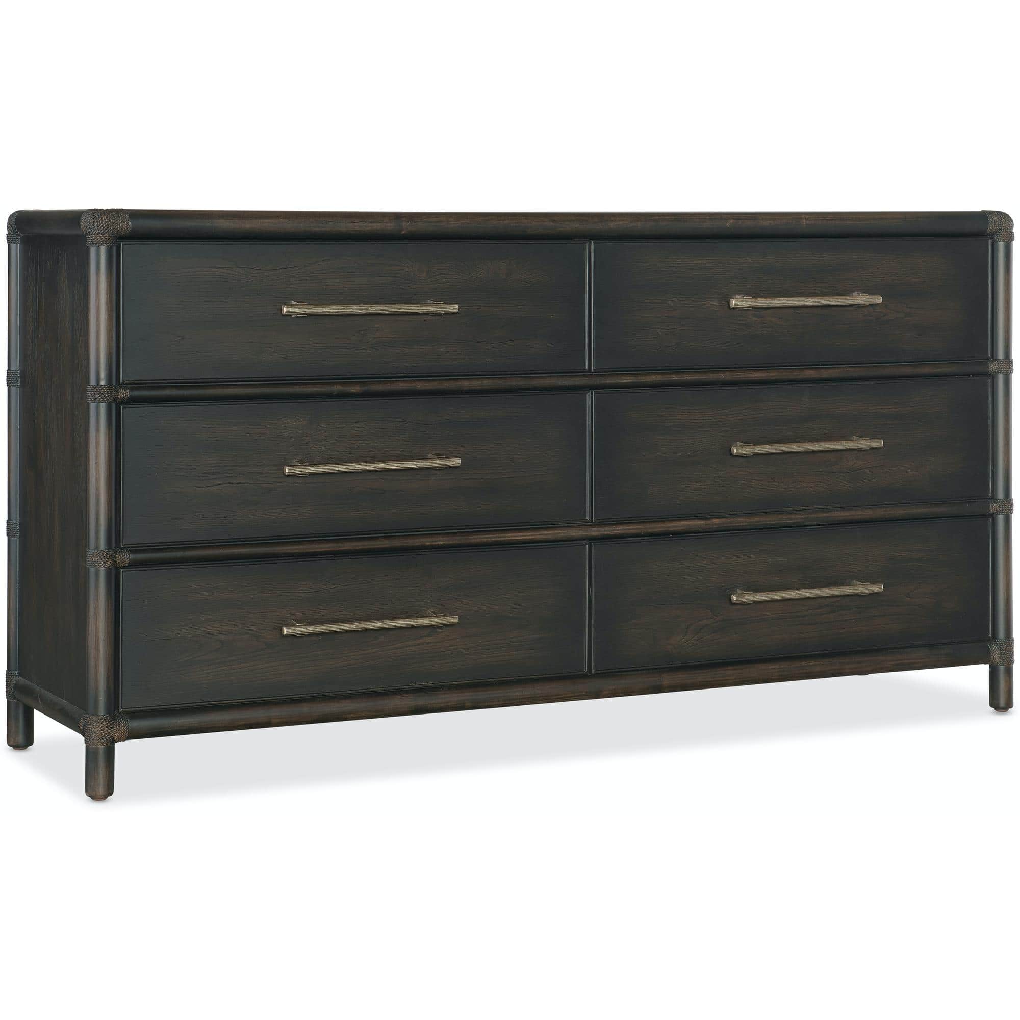 Finish: Black Sand: Transparent by design to showcase the unique grain patterns of the veneer, Black Sand was inspired by the black silk sands found on the shorelines of exotic beaches of Maui and Tahiti. Soft pewter bar pulls.
